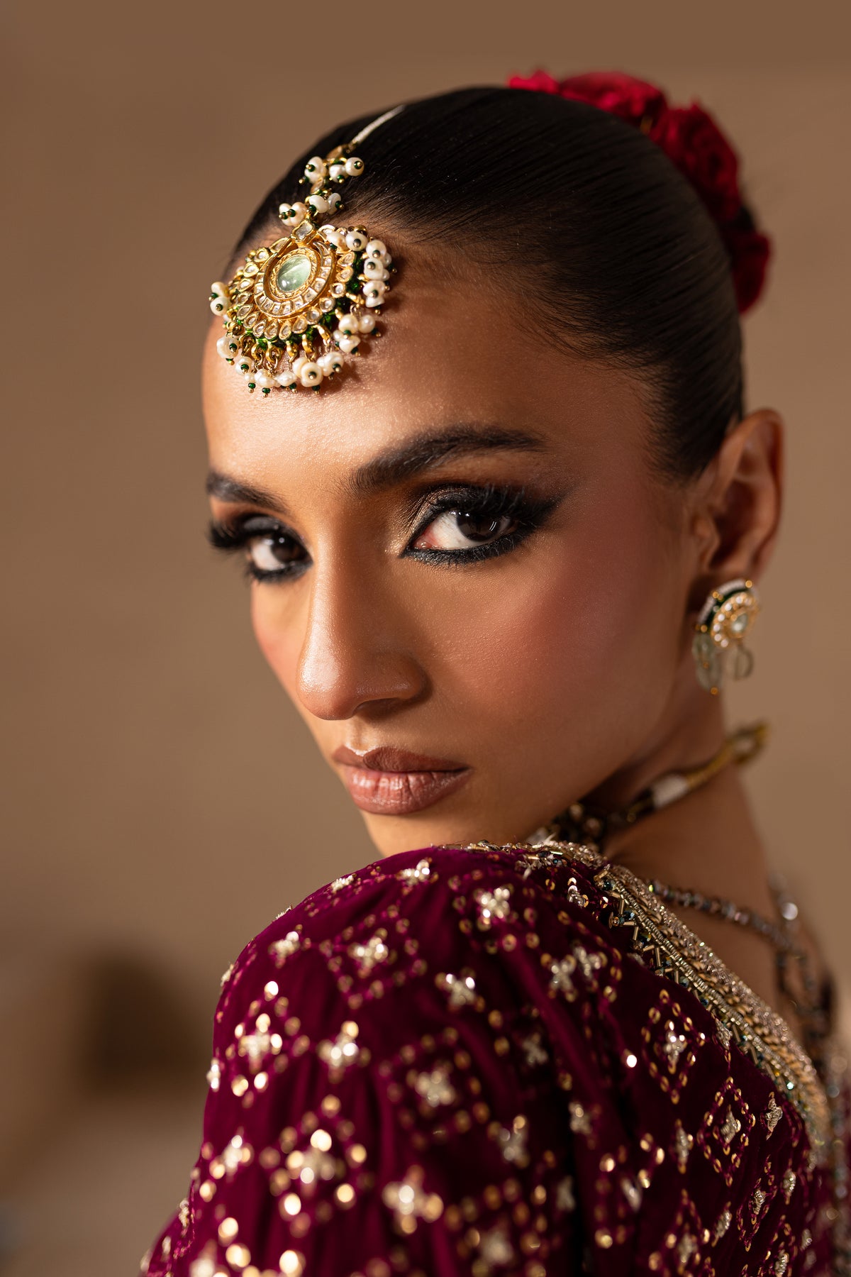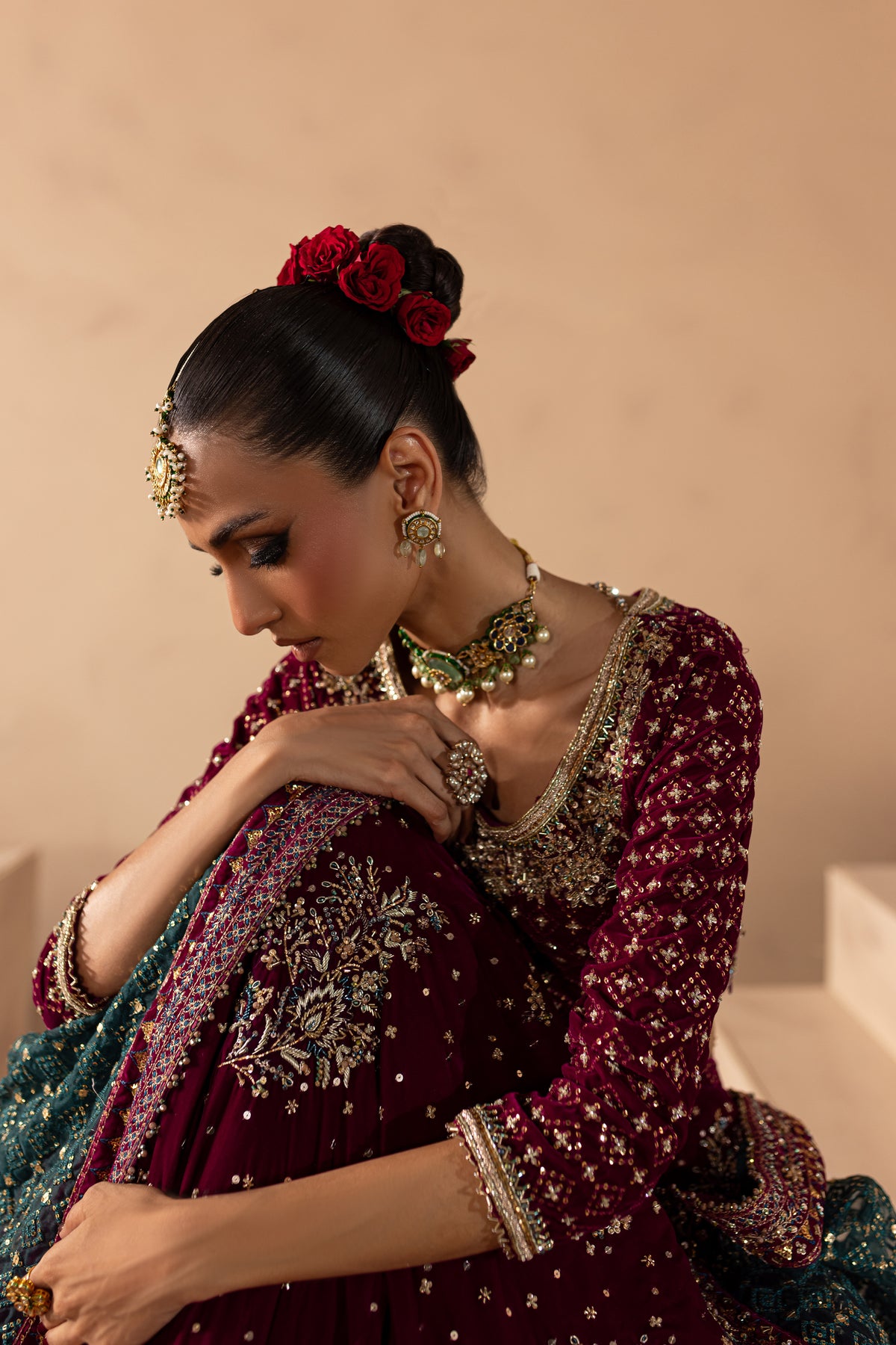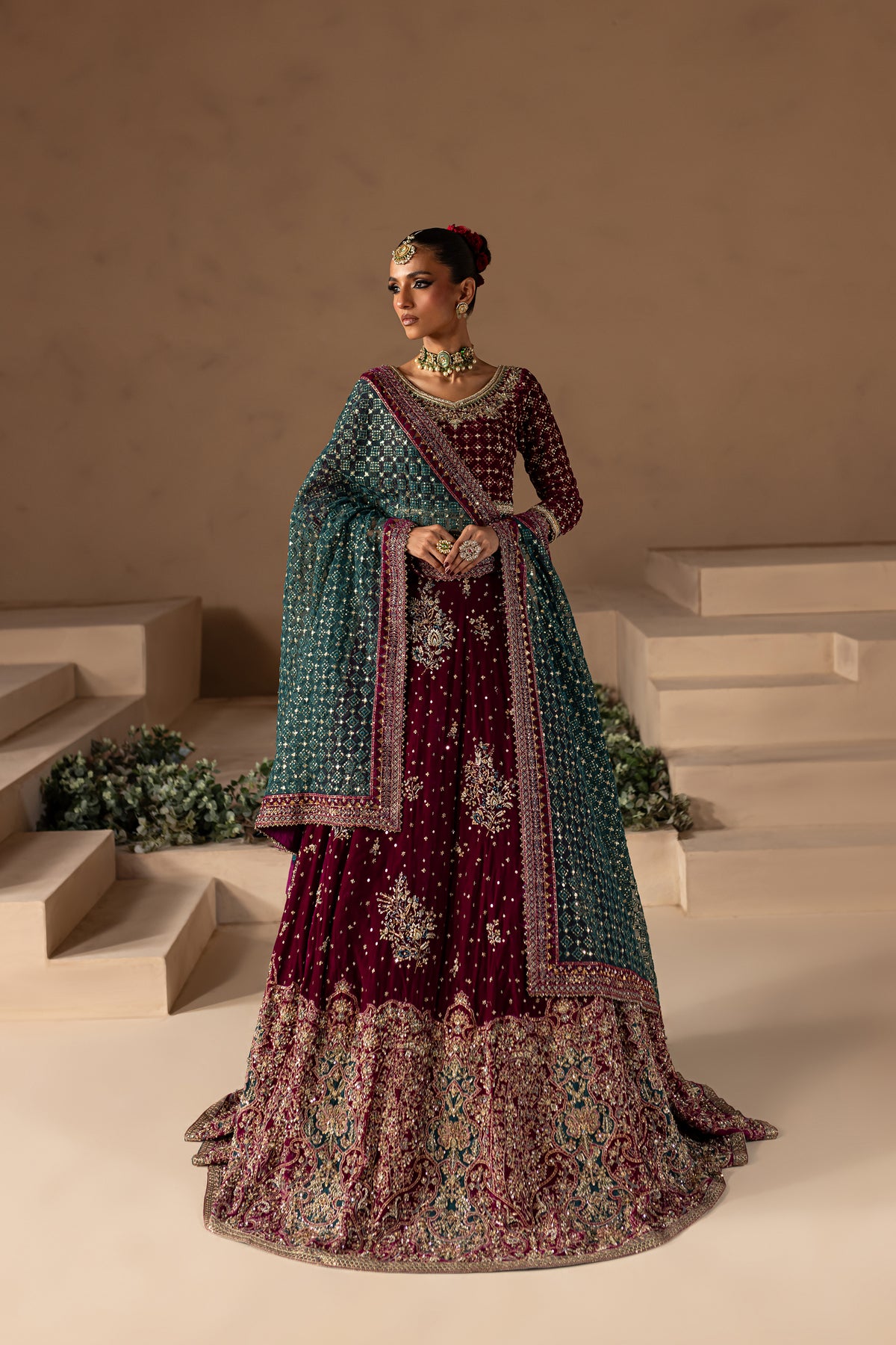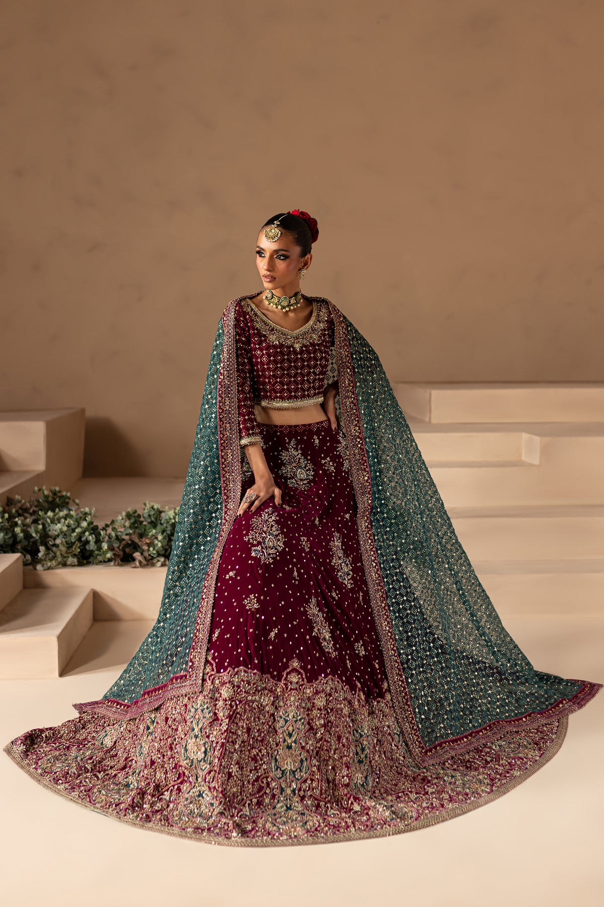 Paired with a widely flared velvet lehnga displaying intricate handwork and sitara spread on panels. Elevated with a heavily embroidered border incorporating embroidered raw silk patching in teal color. Front and back panels feature finely hand worked motifs. Striking material details withhold a blend of mukesh, resham, dabka, naqshi, pearls, crystals, and more. A minimal border is added for finishing touched up with teal. It comes with an attached can can.