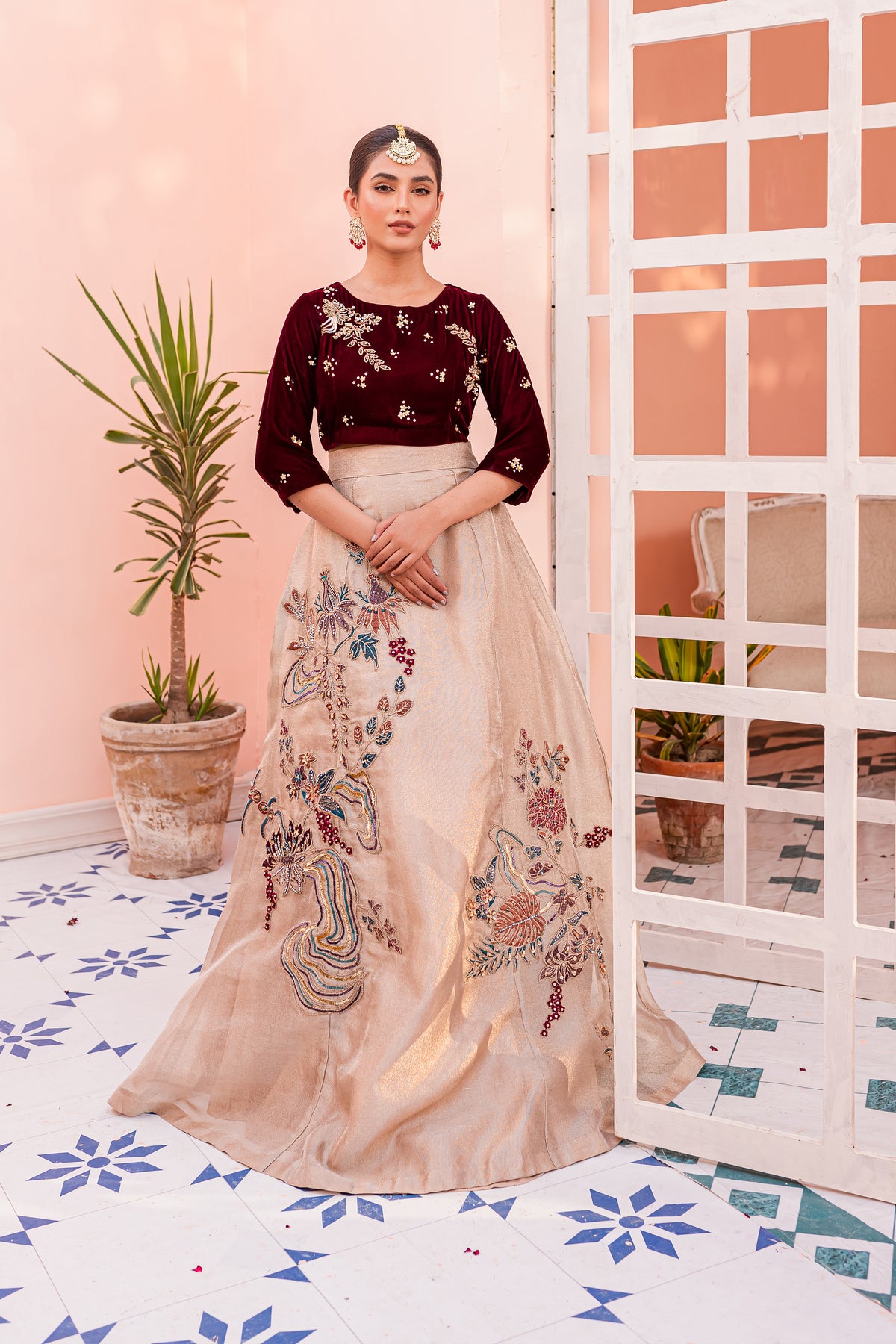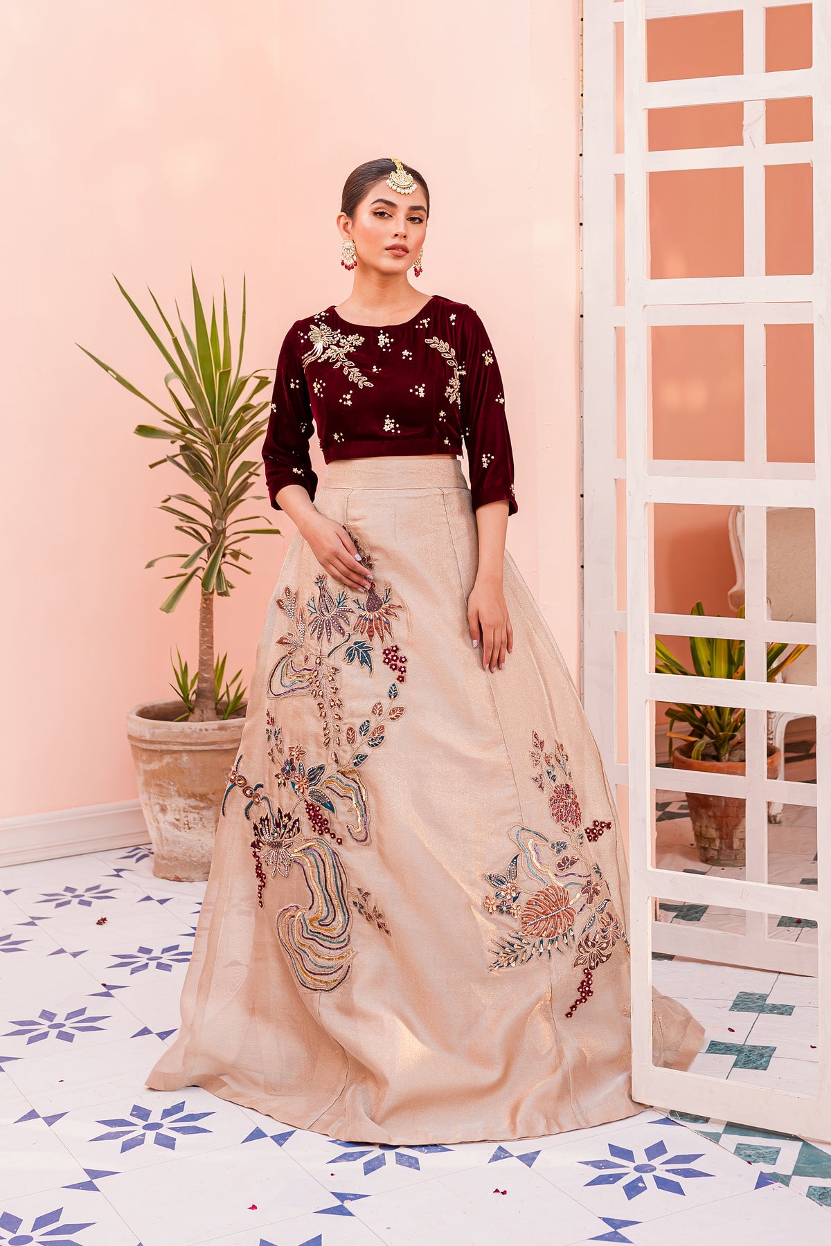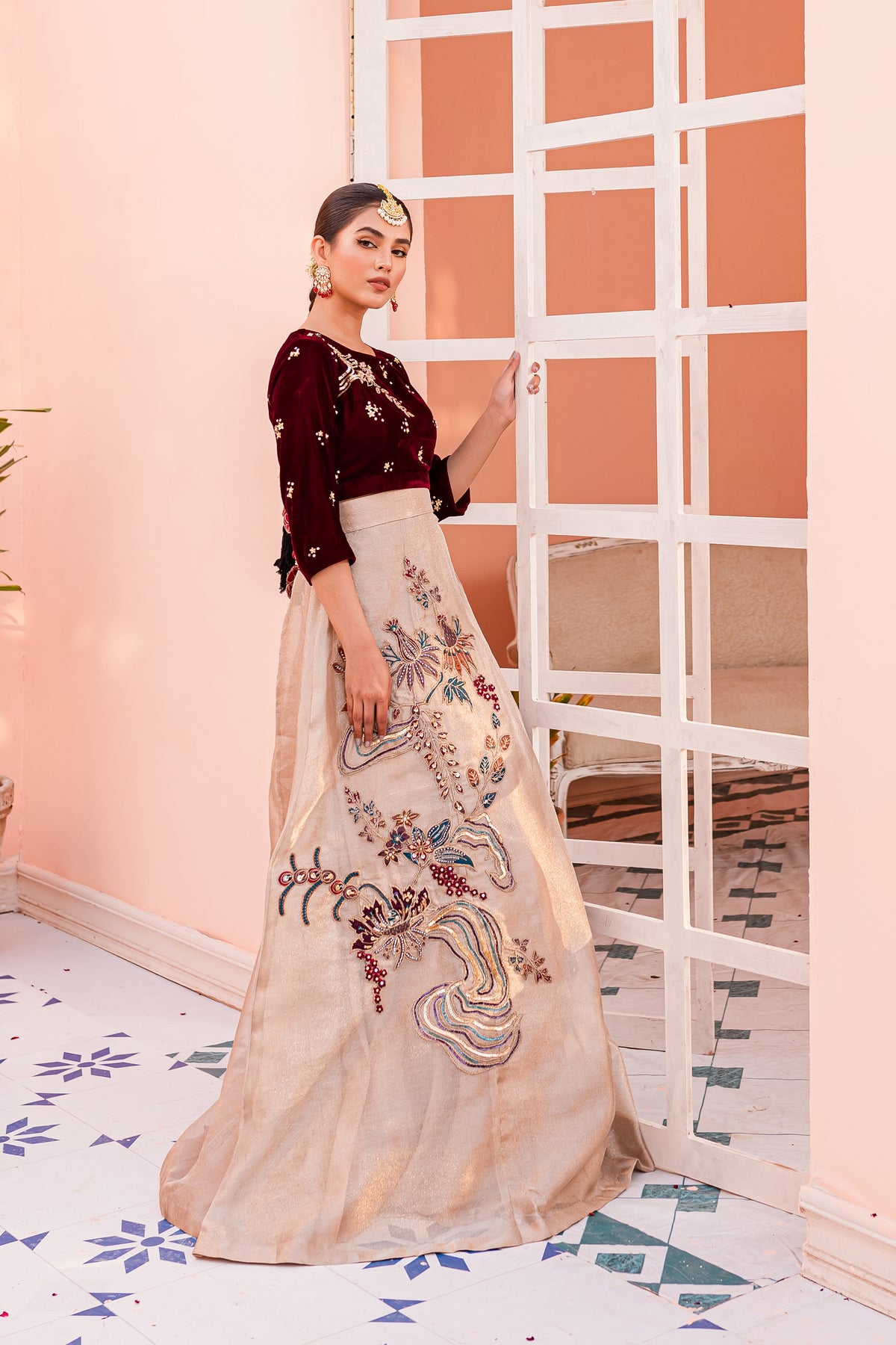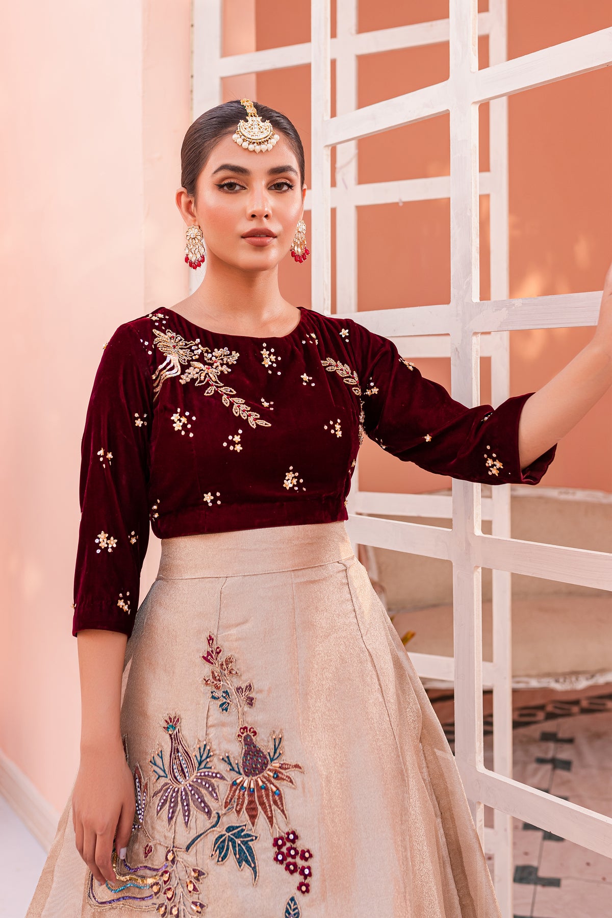 Gorgeously crafted velvet choli in the shades of deep maroon. Embellishments feature subtle details of adda work with added glitz and shimmer of spread all over