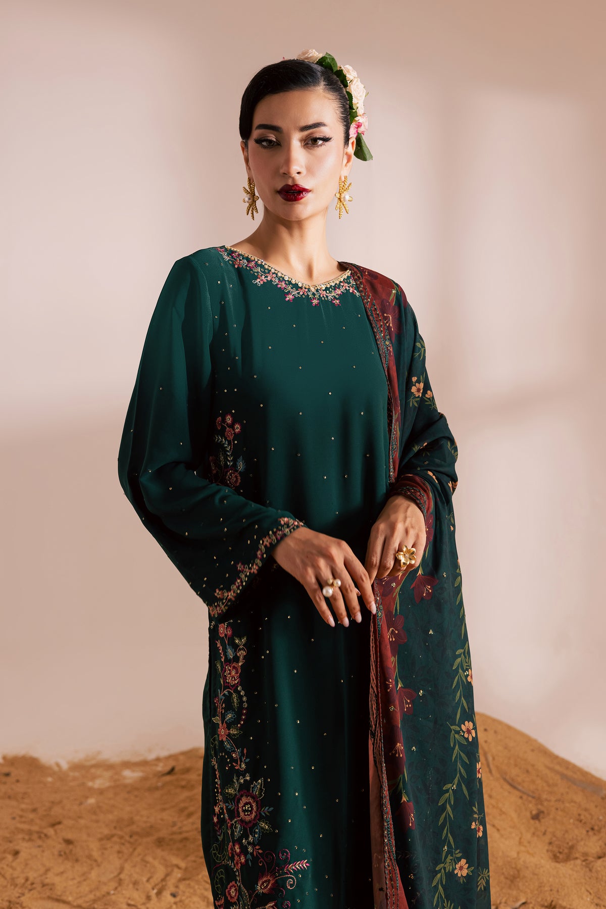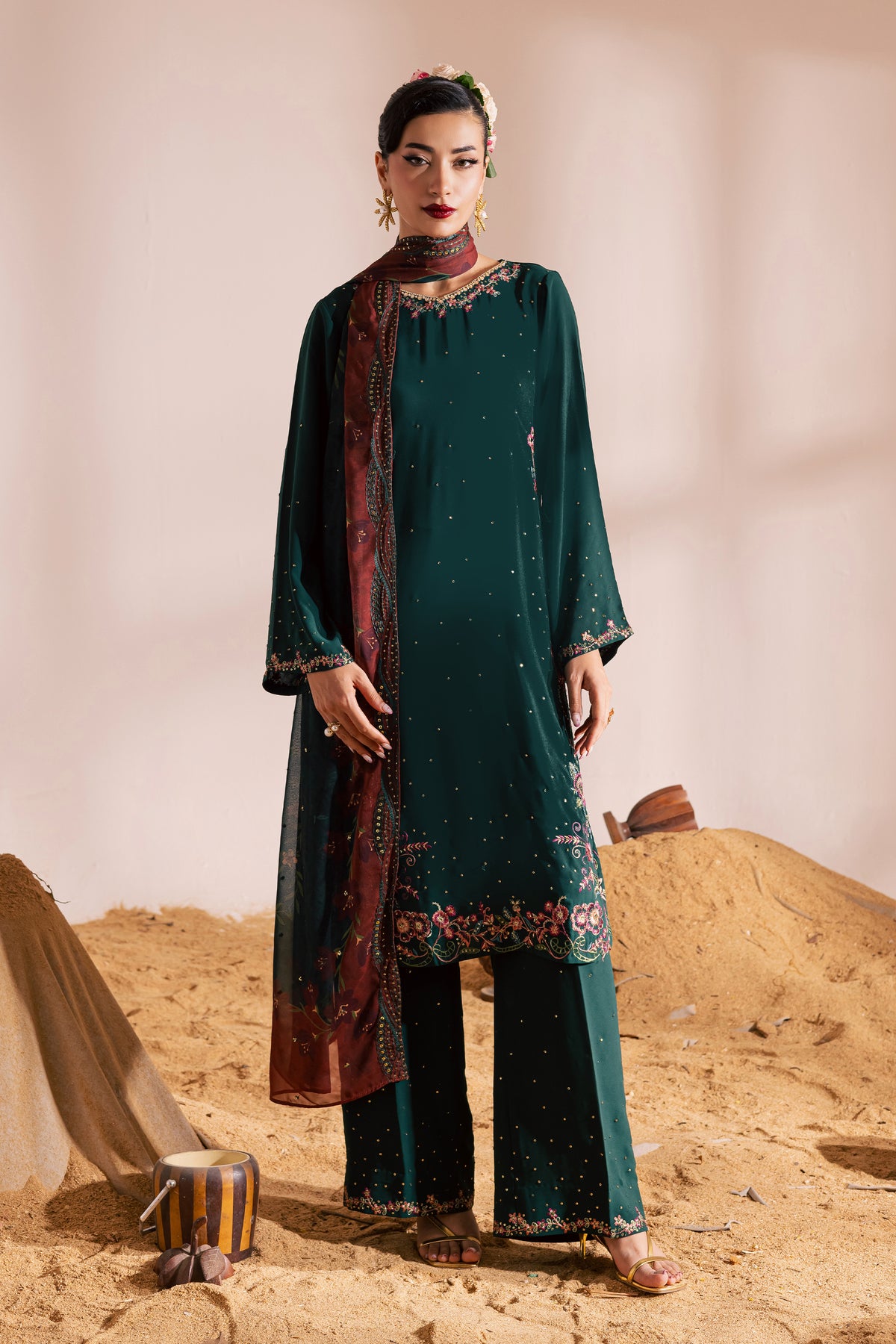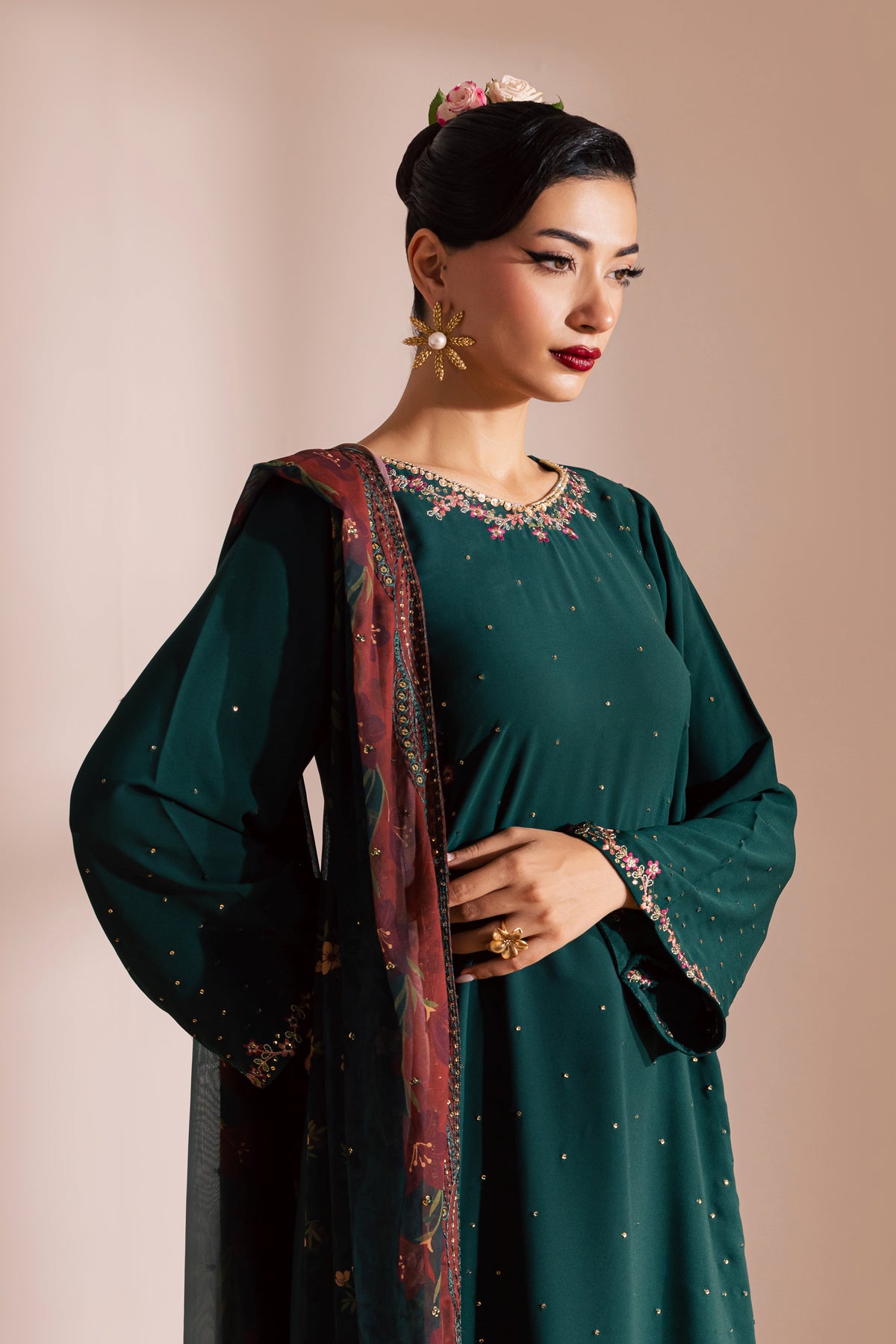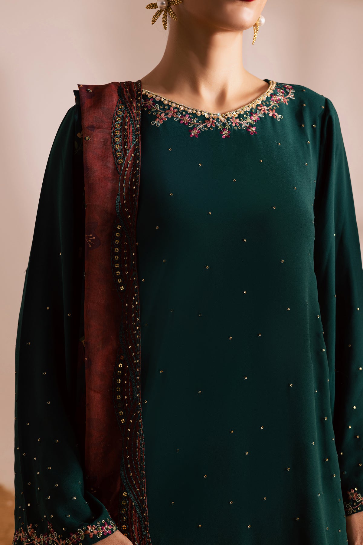 A formal embroidered dress featuring a mid-length georgette green shirt featuring a composed embroidered round hem and a V-shaped embroidered neckline, further enhanced with delicate hand embellishments for an elegant finish. The sleeves are styled with open hems and embroidery, adding a graceful touch to the silhouette.
