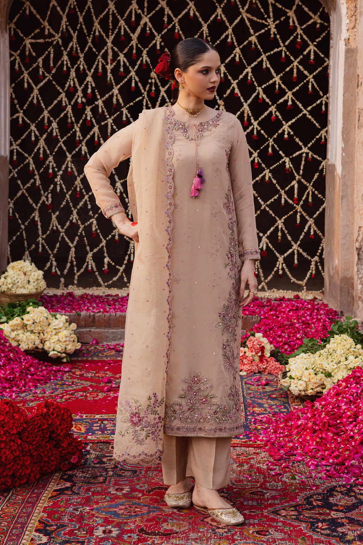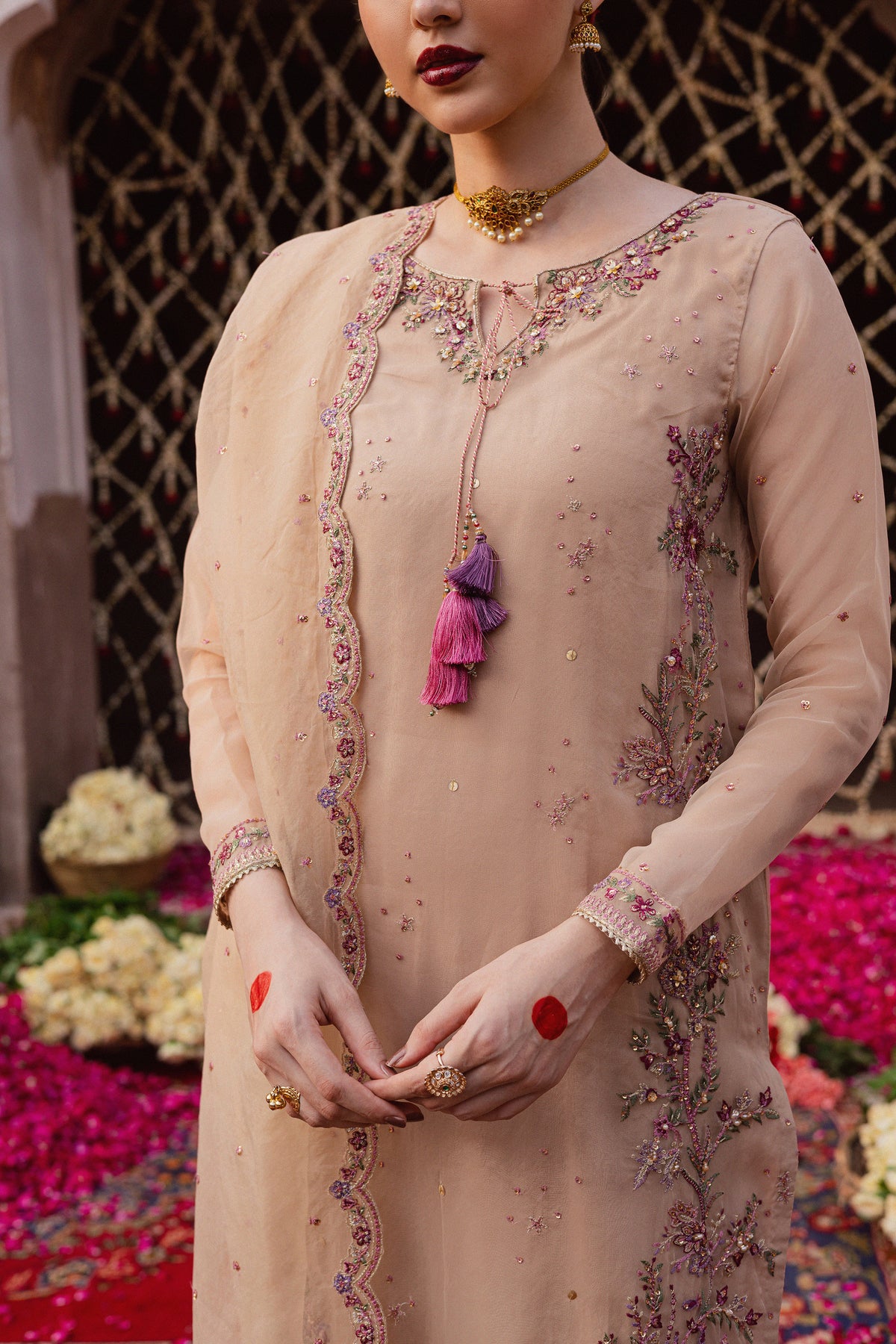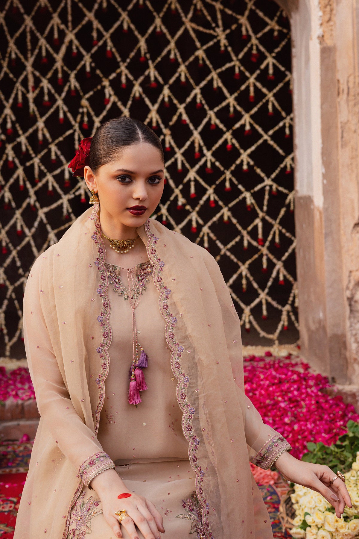 Step into elegance with Zahra, a composed long beige organza embroidered shirt featuring a keyhole neckline adorned with tassels and delicate adda work on the front and neckline. The embroidered sleeves are finished with a bordered hem and gold samosa lace for a luxurious touch.