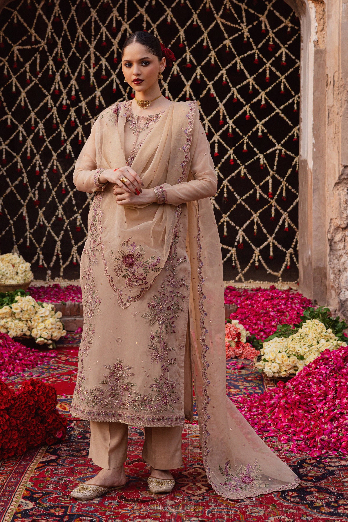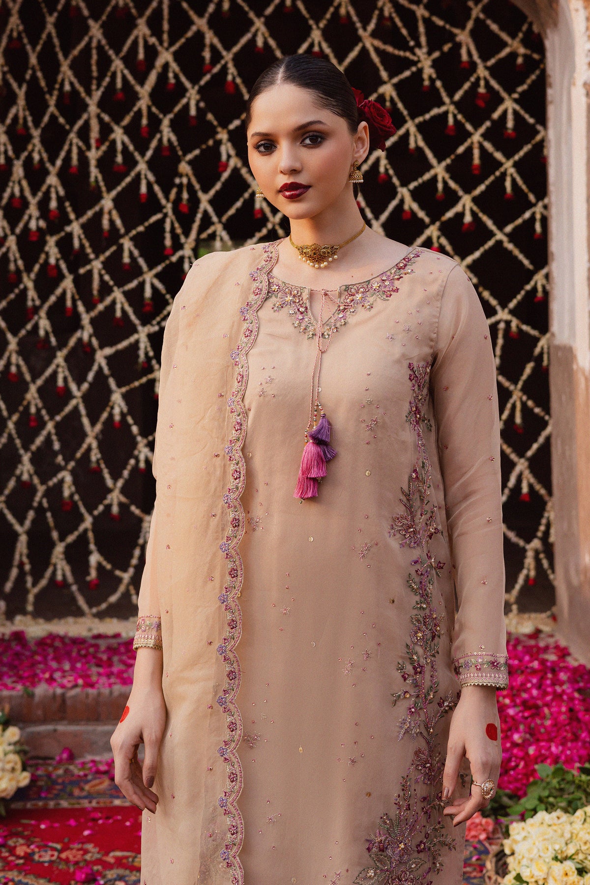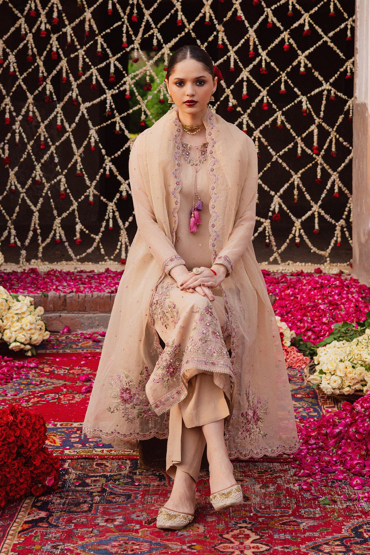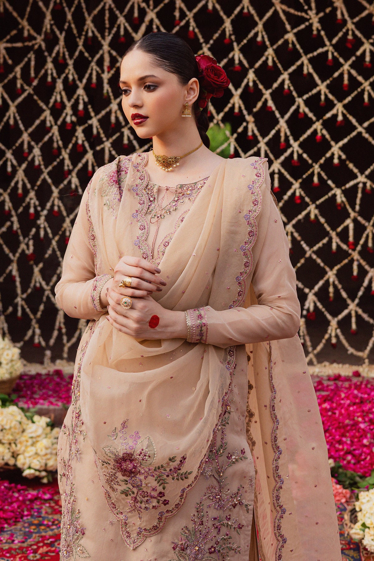 Step into elegance with Zahra, a composed long beige organza embroidered shirt featuring a keyhole neckline adorned with tassels and delicate adda work on the front and neckline. The embroidered sleeves are finished with a bordered hem and gold samosa lace for a luxurious touch.
