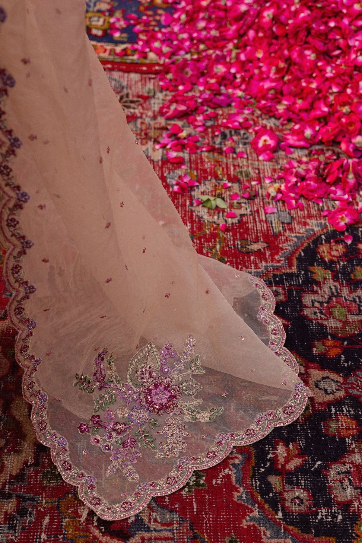 The look is completed with an organza dupatta, edged with a scalloped border on all four sides, featuring embroidered motifs on the pallu and a shimmering sequin spread at the center, perfect for festive occasions.