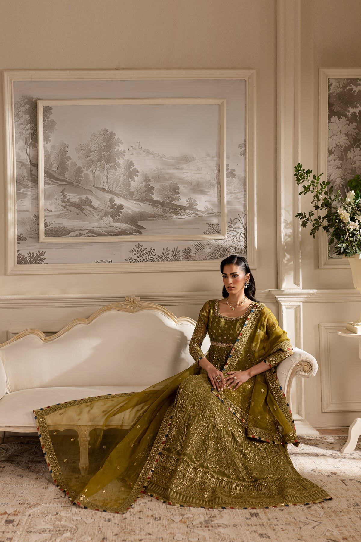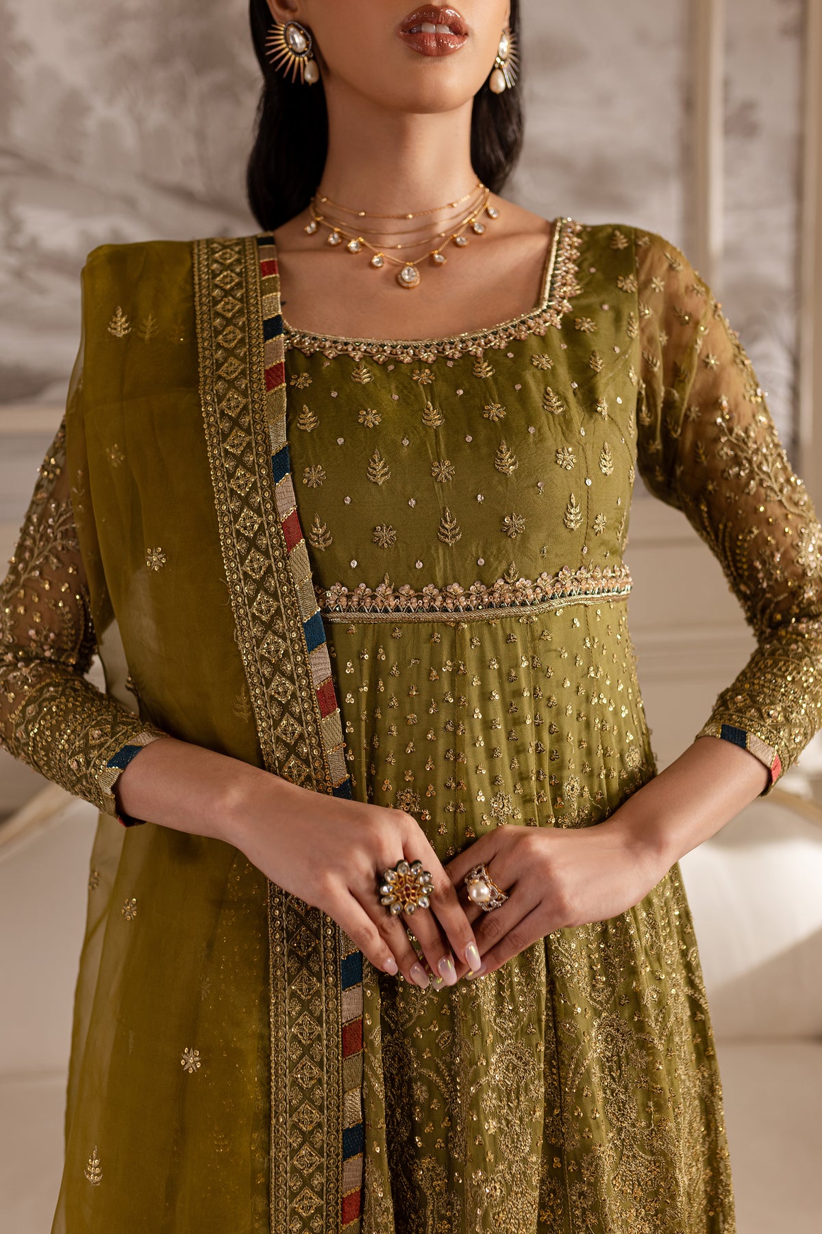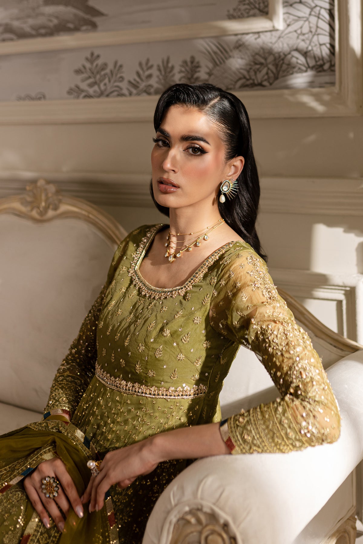 This Crinkle Mehndi Green Crinkle ensemble beautifully blends intricate embroidery with luxurious fabrics. The frock features a heavy embroidered yoke, adorned with direct Adda work on the neckline and yoke hem, adding a touch of intricate craftsmanship. The heavily embroidered sleeves are finished with a delicate embroidered Chatta Patti, enhancing the elegance of the design. The heavily embroidered panels create a beautiful flow, while the border at the hem adds balance to the overall look. The frock is finished with Chatta Patti, adding a refined and polished touch.