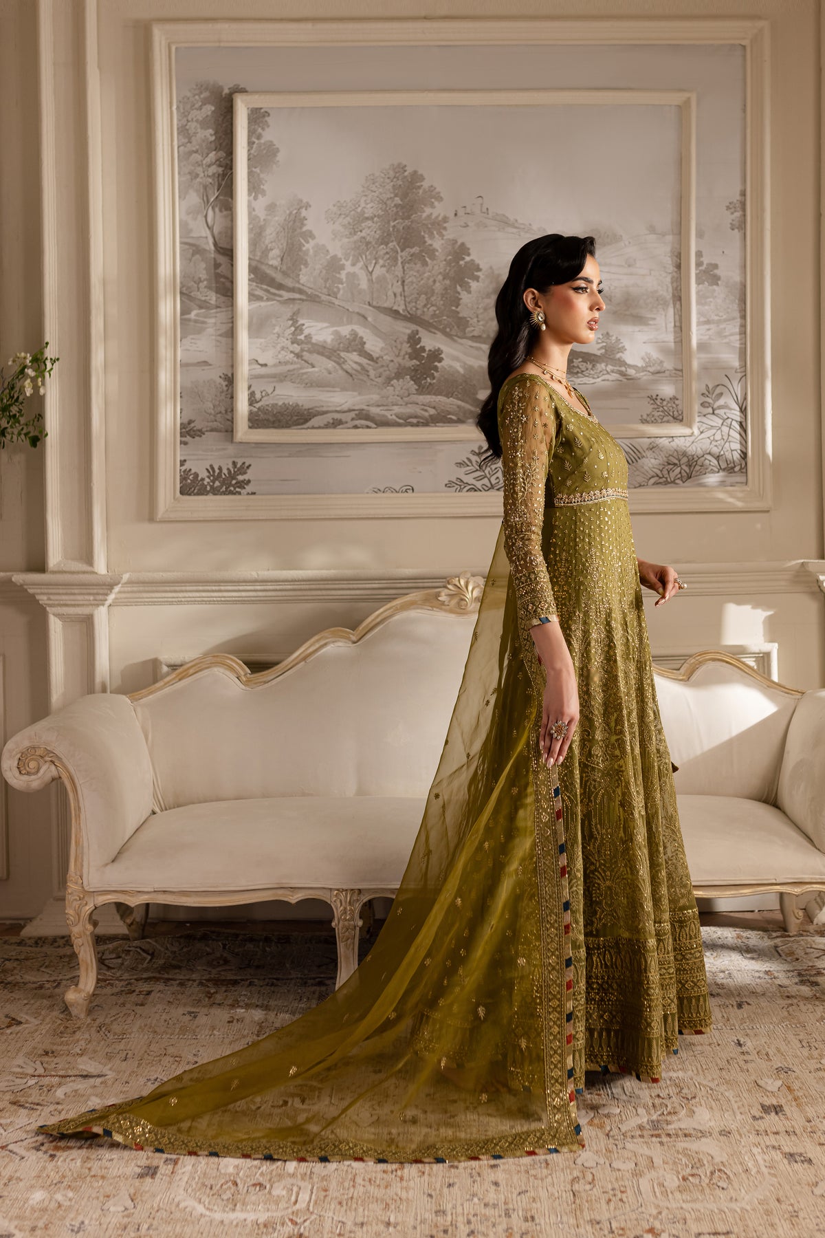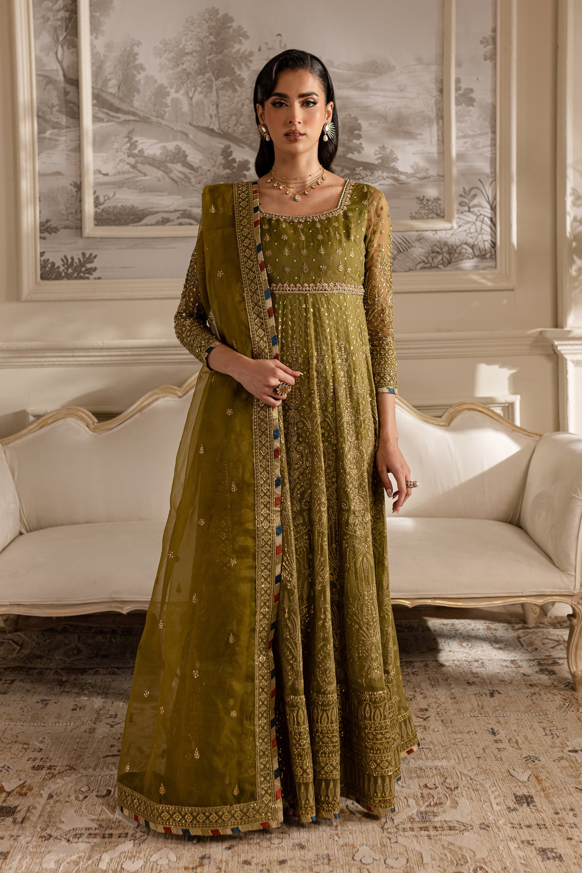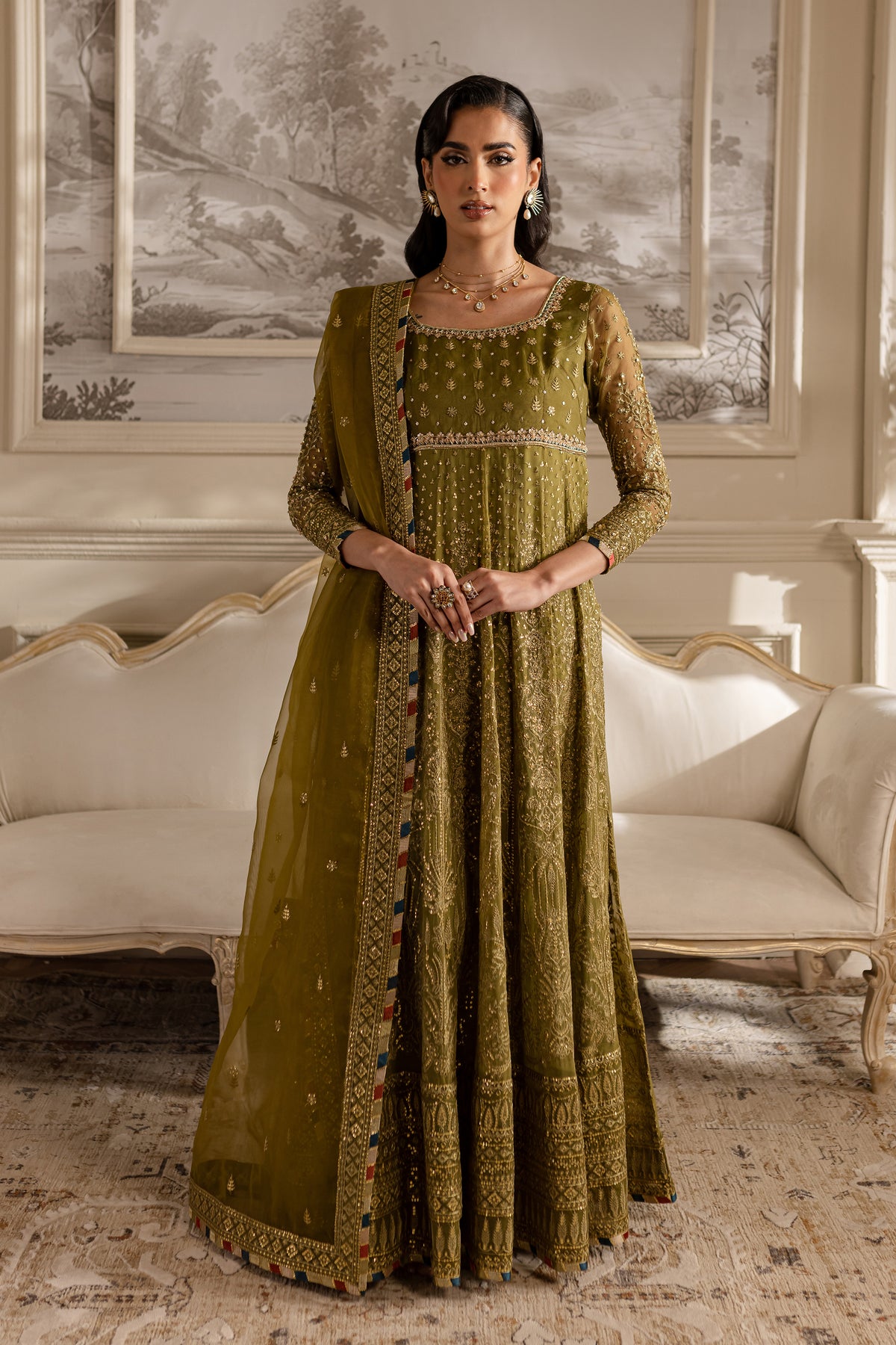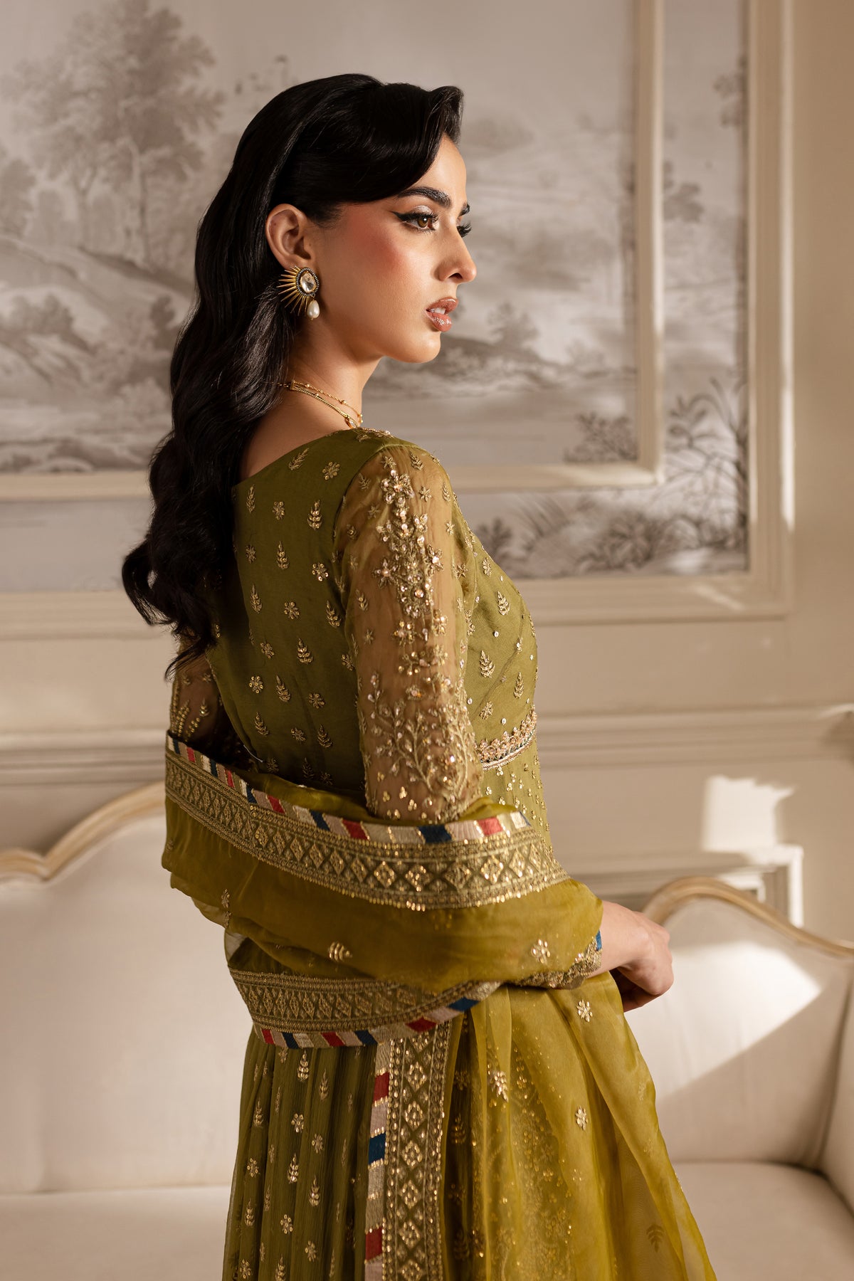 This Crinkle Mehndi Green Crinkle ensemble beautifully blends intricate embroidery with luxurious fabrics. The frock features a heavy embroidered yoke, adorned with direct Adda work on the neckline and yoke hem, adding a touch of intricate craftsmanship. The heavily embroidered sleeves are finished with a delicate embroidered Chatta Patti, enhancing the elegance of the design. The heavily embroidered panels create a beautiful flow, while the border at the hem adds balance to the overall look. The frock is finished with Chatta Patti, adding a refined and polished touch.