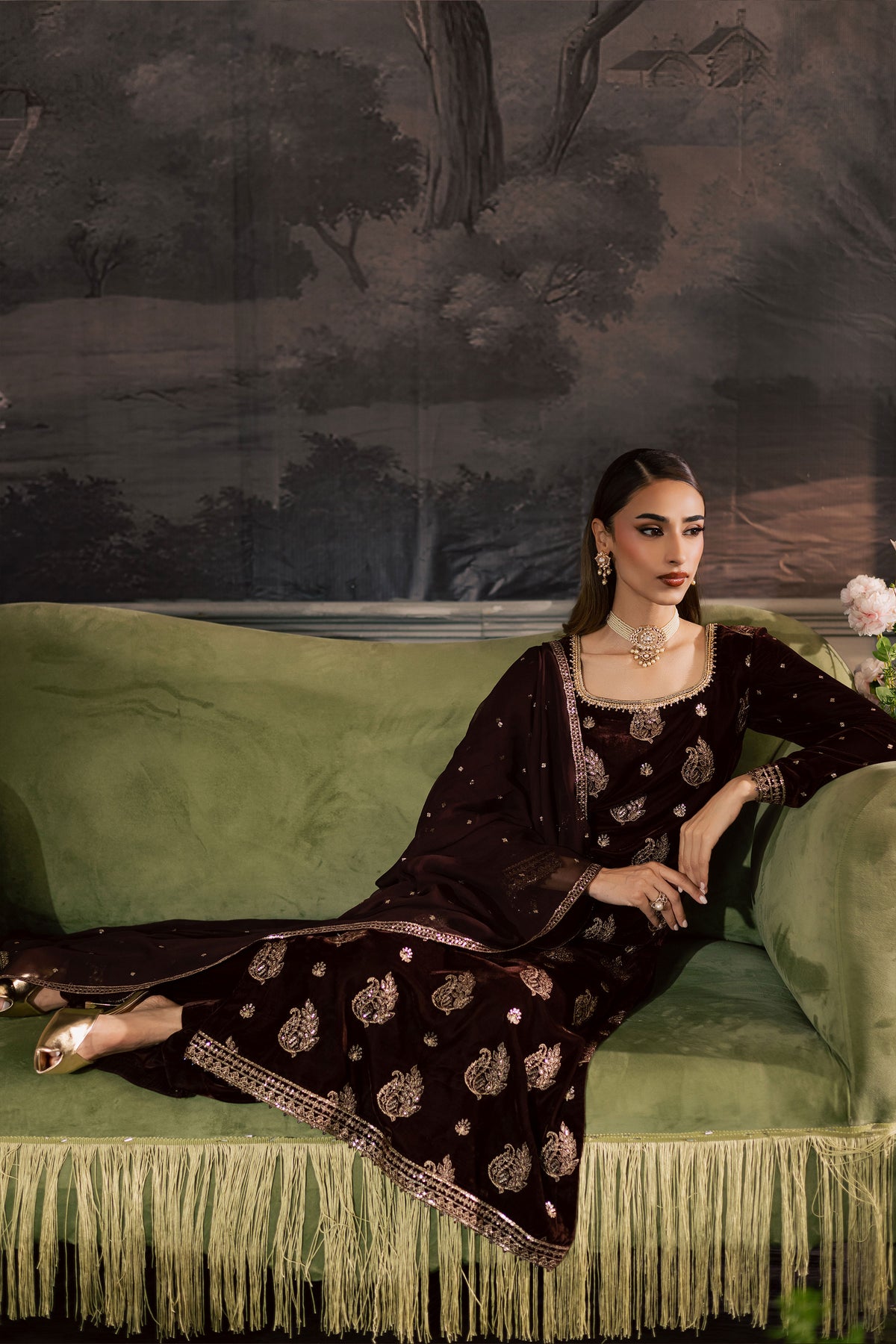 This 3-piece brown velvet ensemble features a long embroidered shirt enhanced with delicate adda work on the neckline. Motif tassels at the back add a unique detail that brings charm and movement to the outfit.