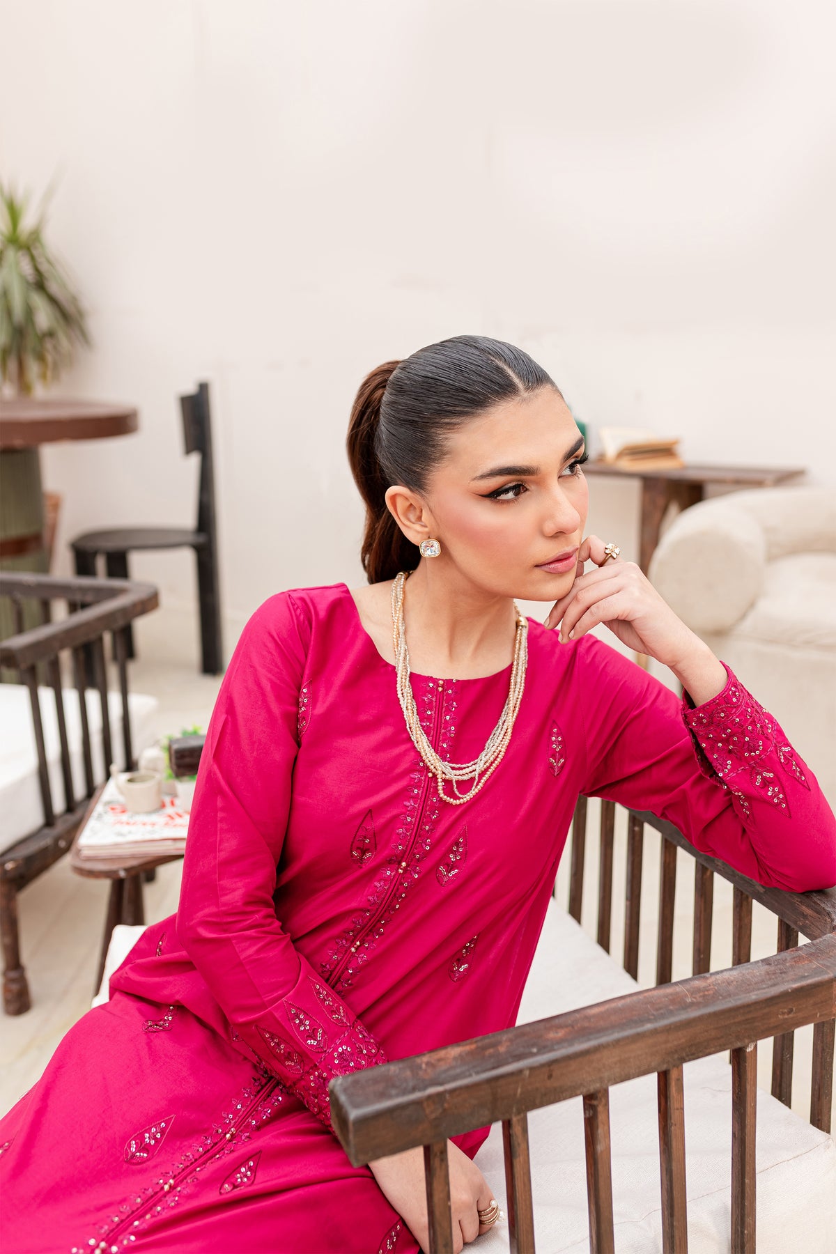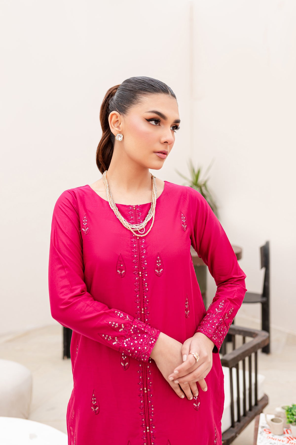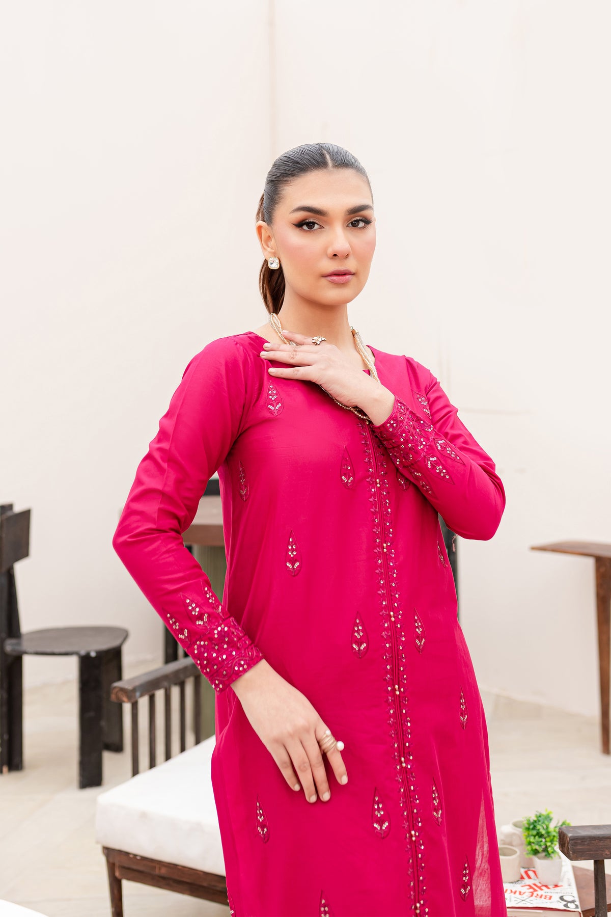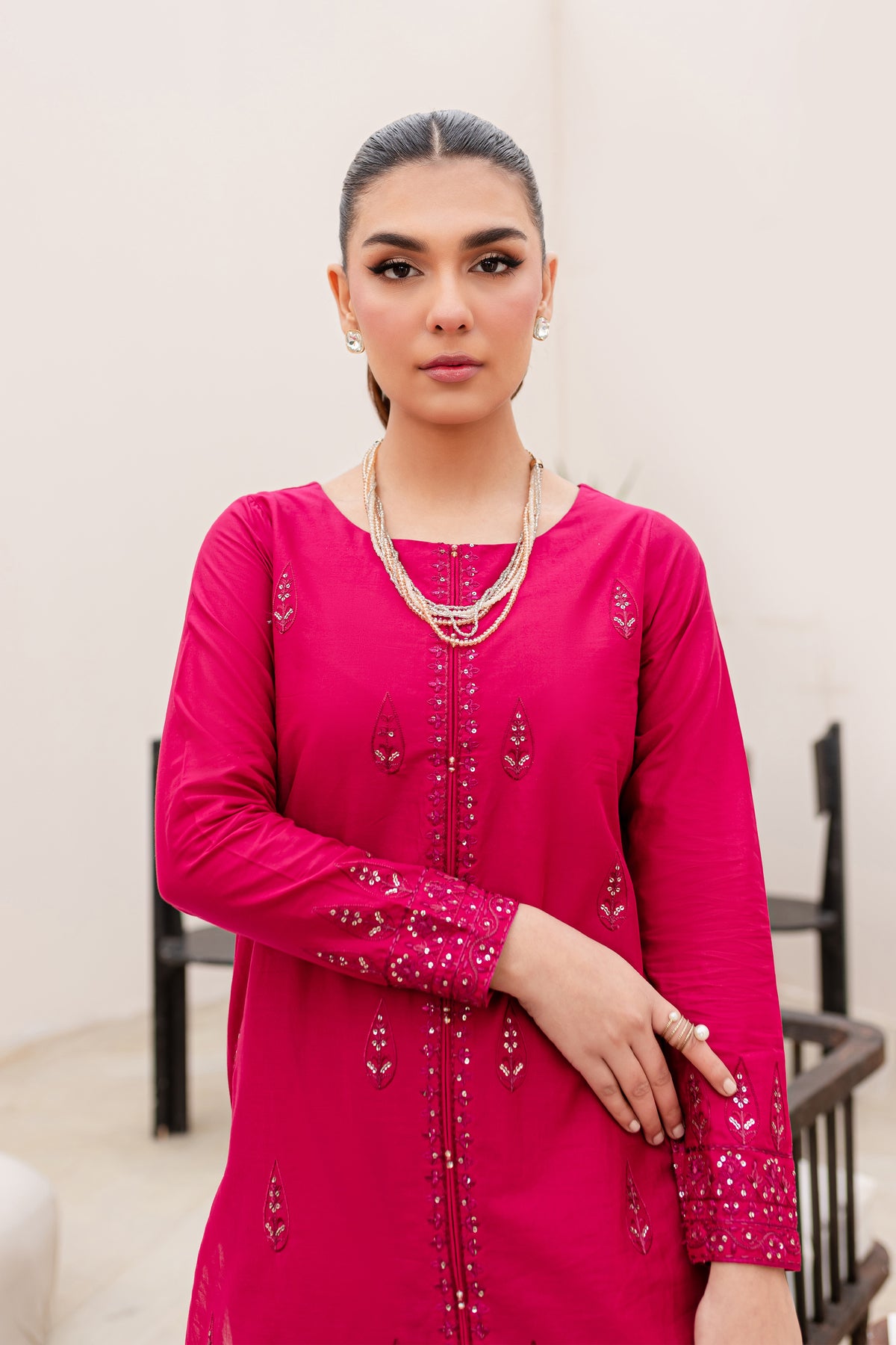 Experience the luxurious comfort and timeless appeal of Pima lawn in the shades of bright pink. Gracefully designed front open shirt displays a fusion of self and sequin embroidery on the front with a heavily embroidered hem. Further enhanced with material collages. Fitted sleeves feature fine embellishments.
