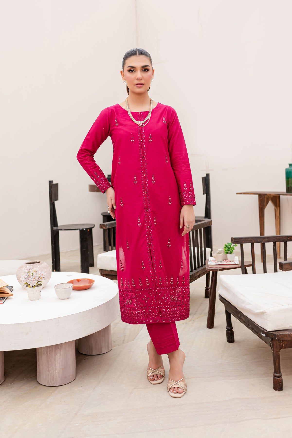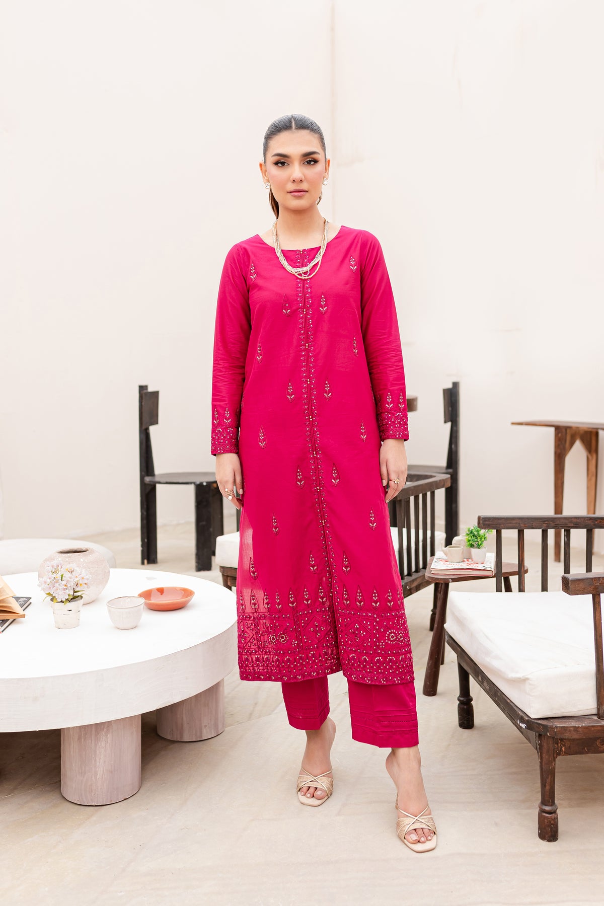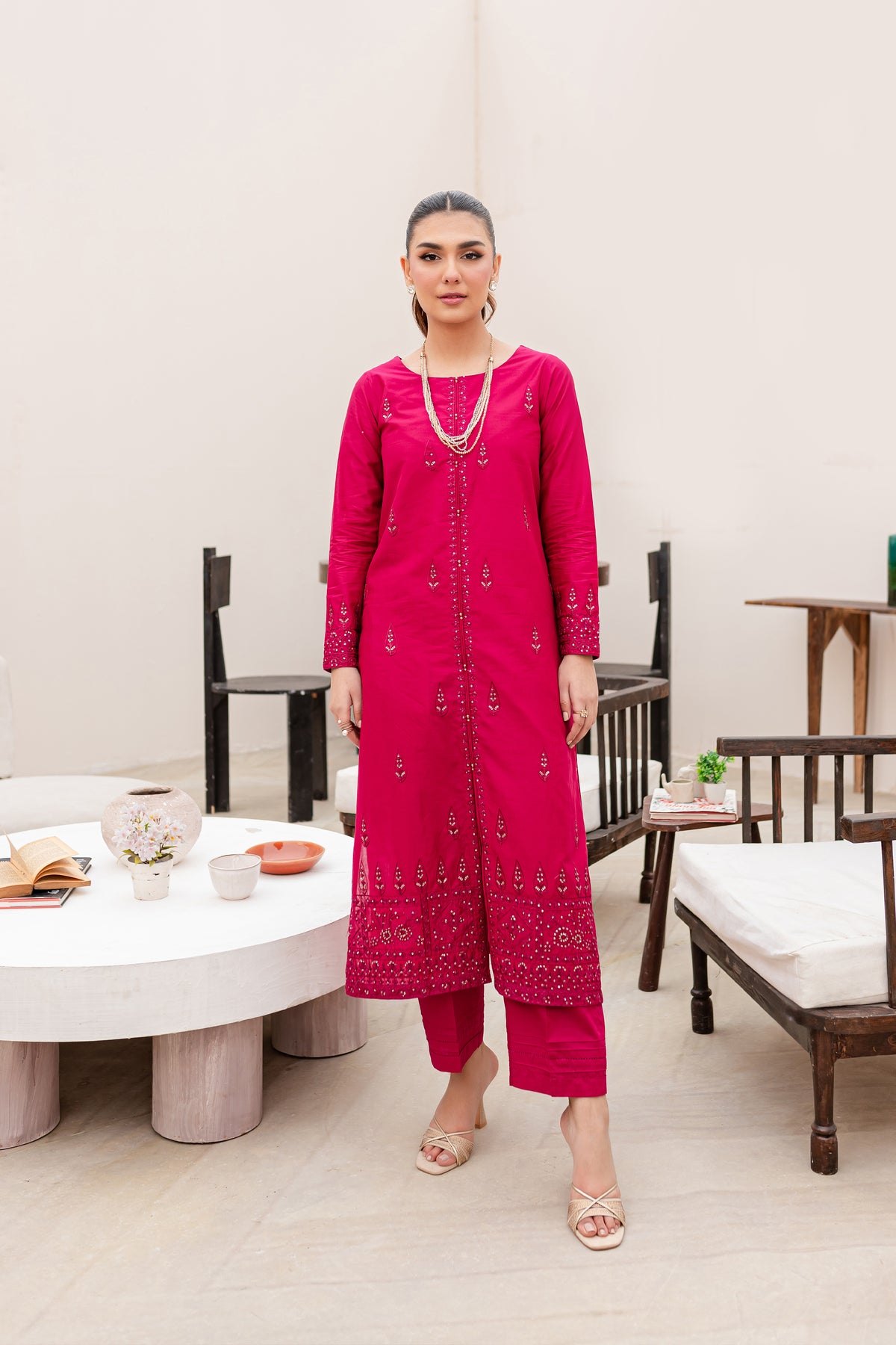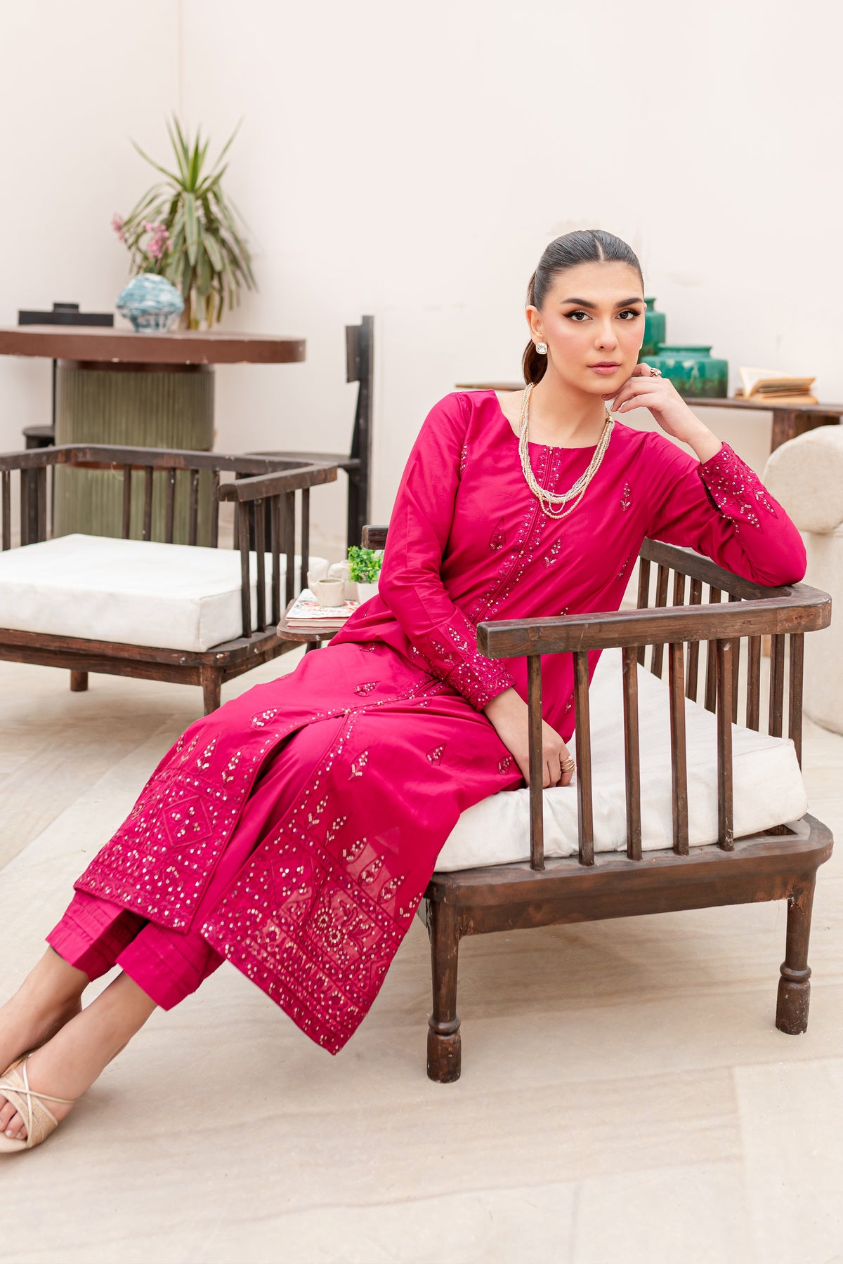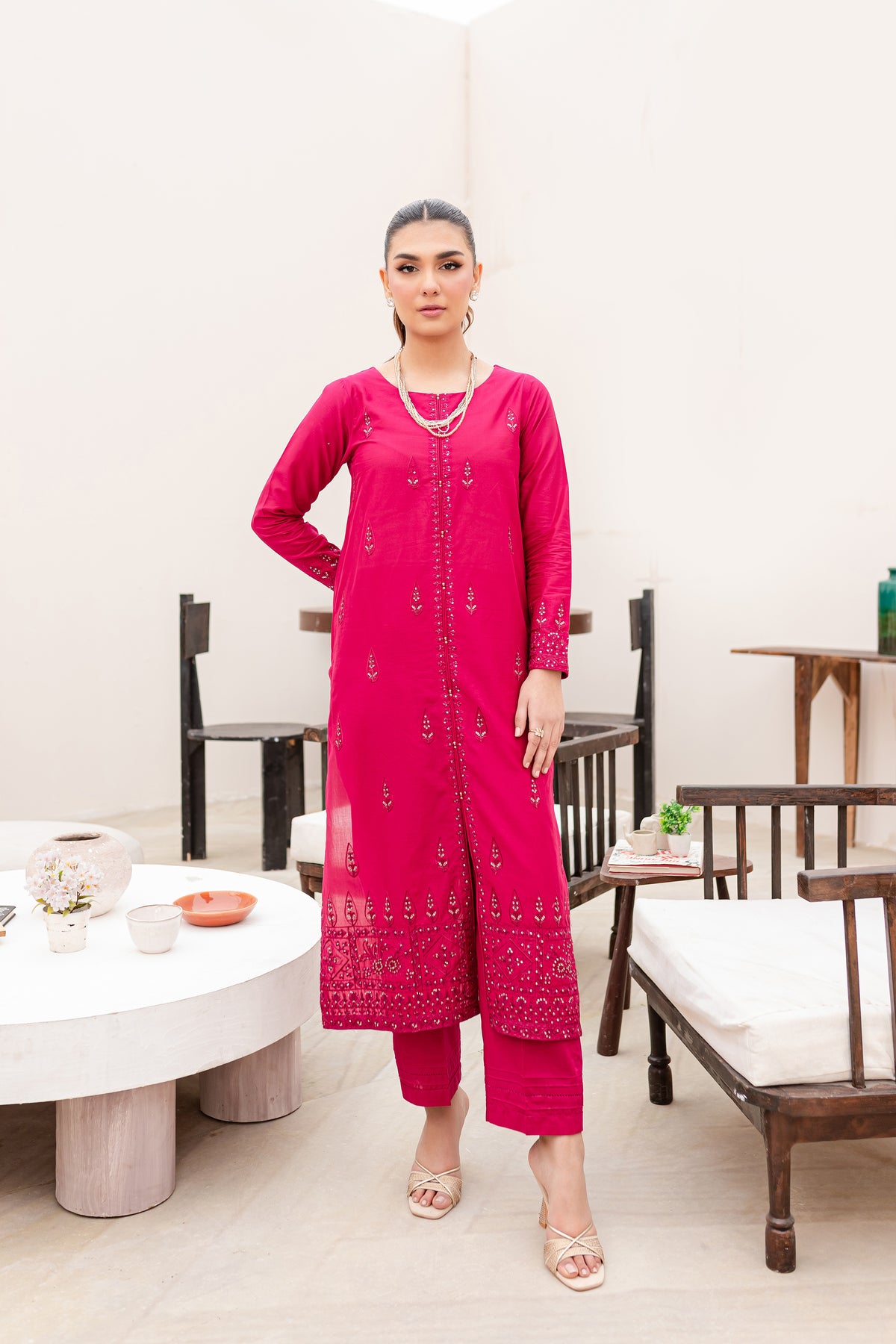 Experience the luxurious comfort and timeless appeal of Pima lawn in the shades of bright pink. Gracefully designed front open shirt displays a fusion of self and sequin embroidery on the front with a heavily embroidered hem. Further enhanced with material collages. Fitted sleeves feature fine embellishments.