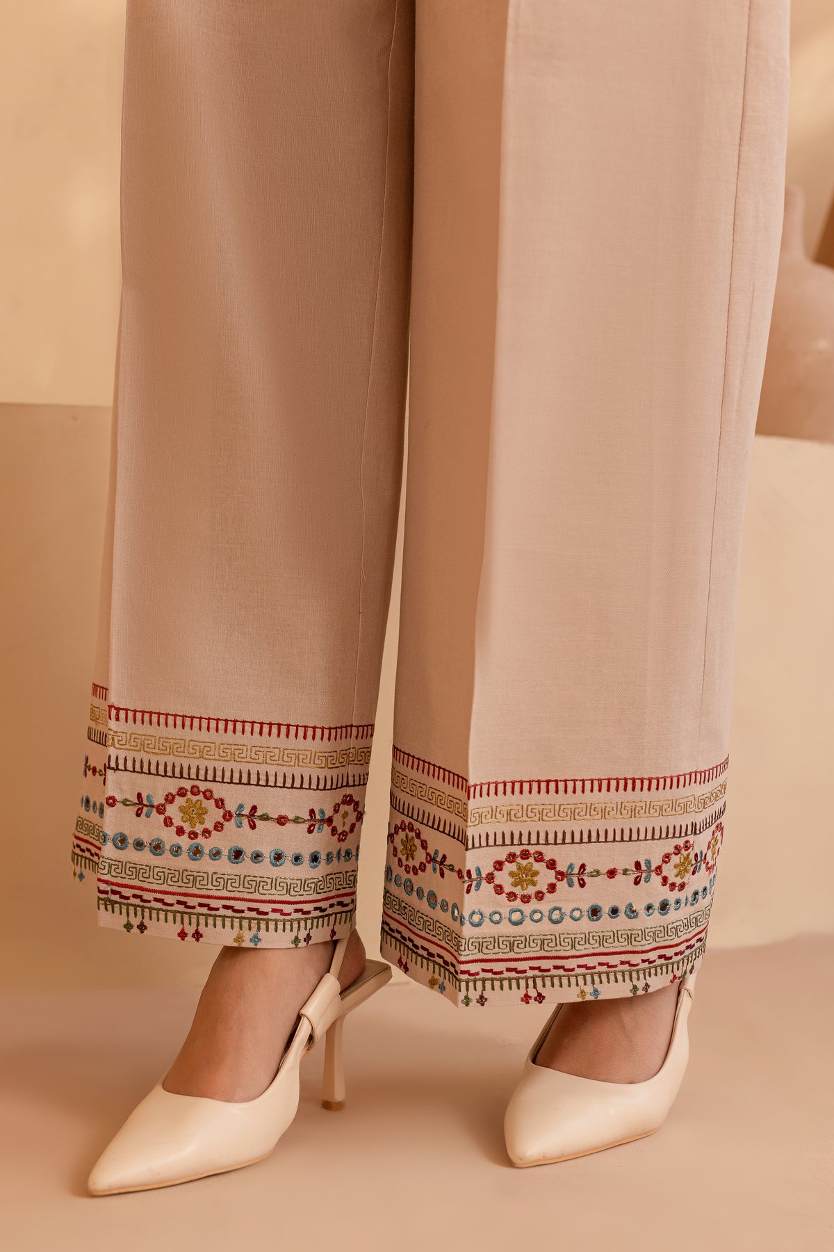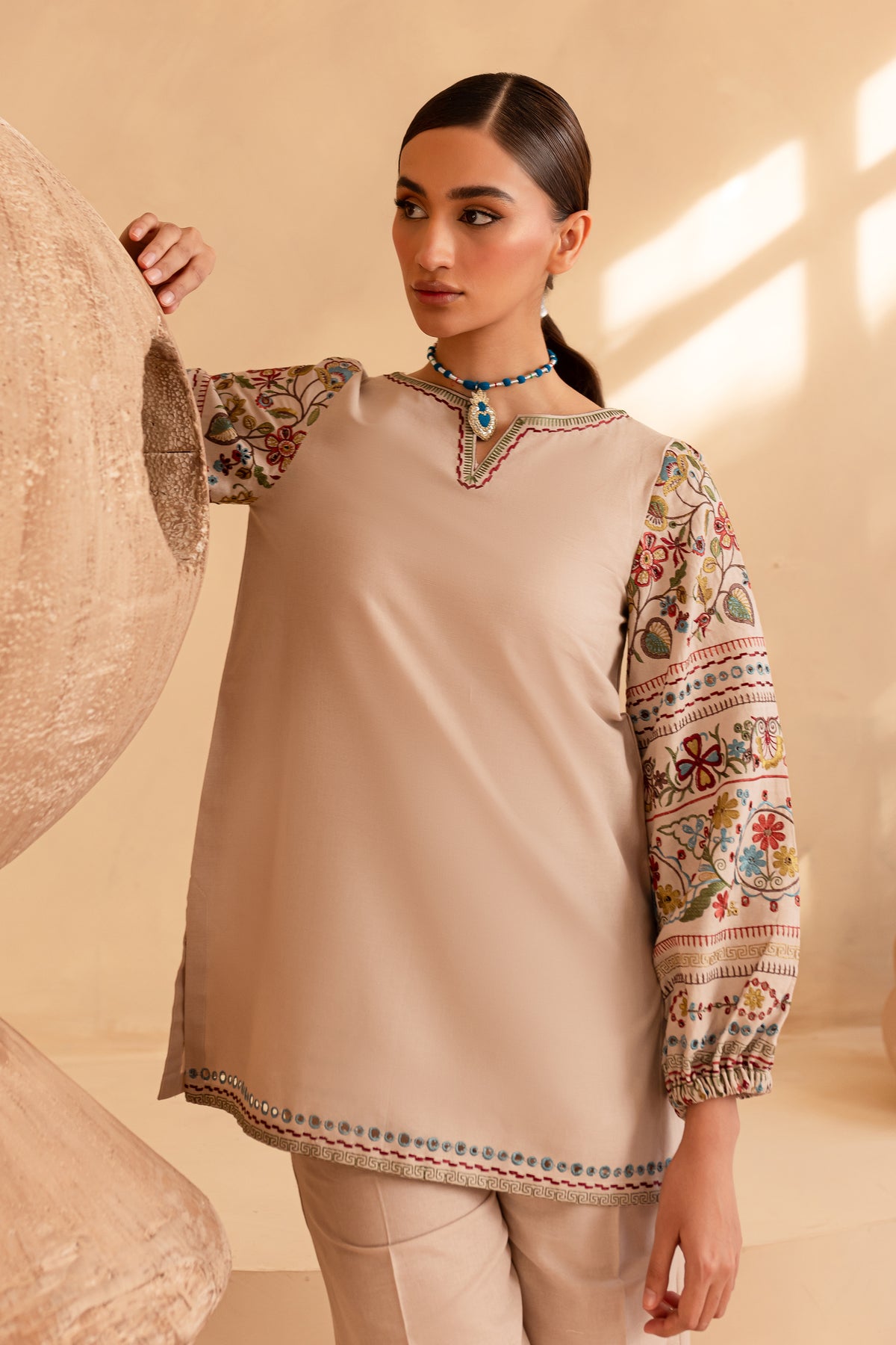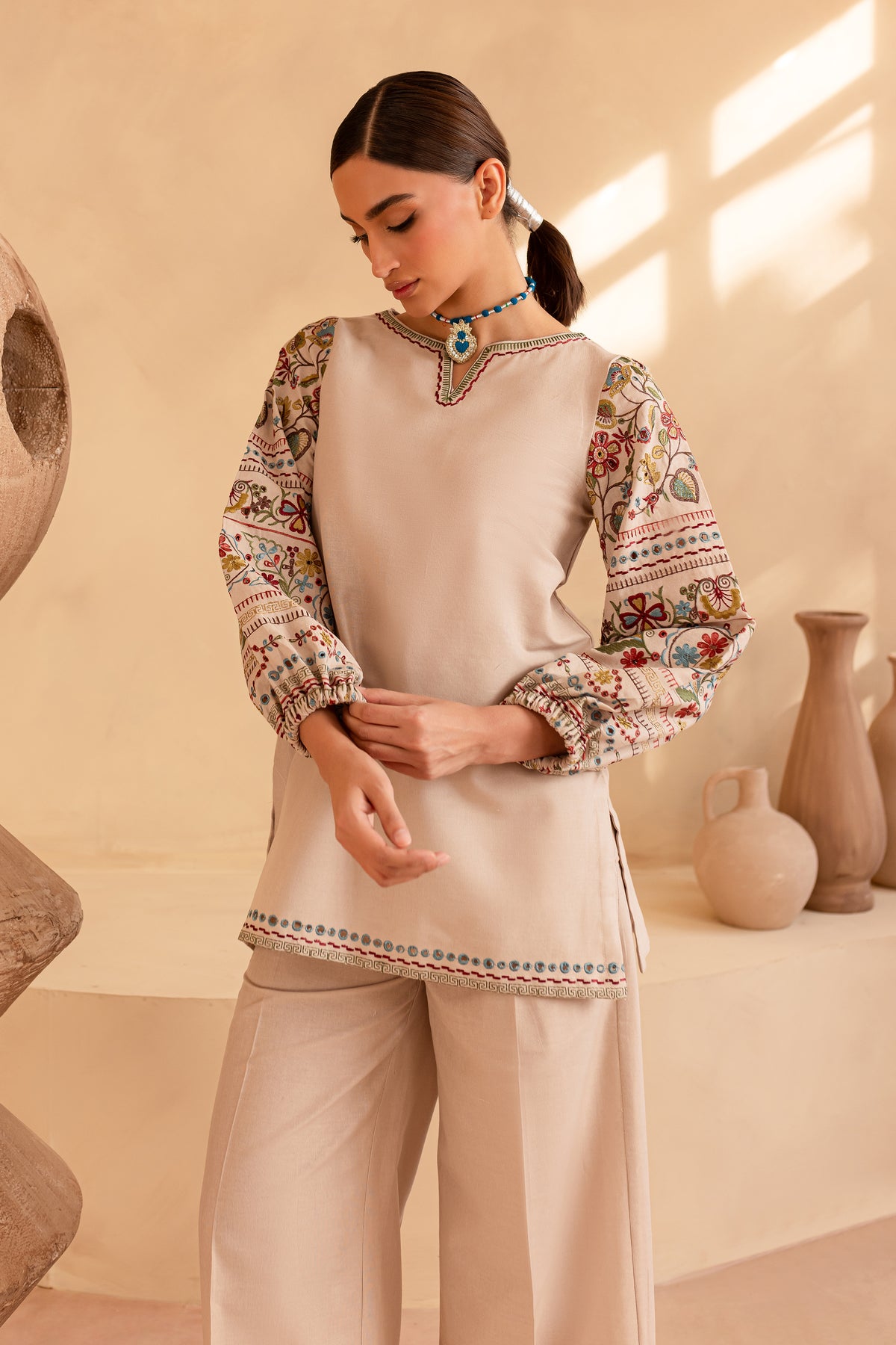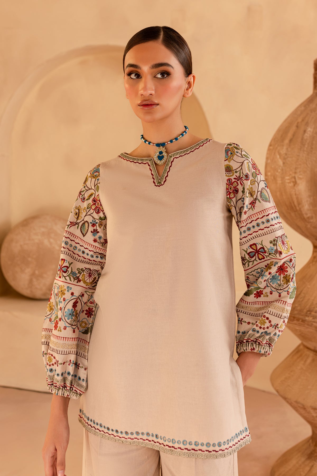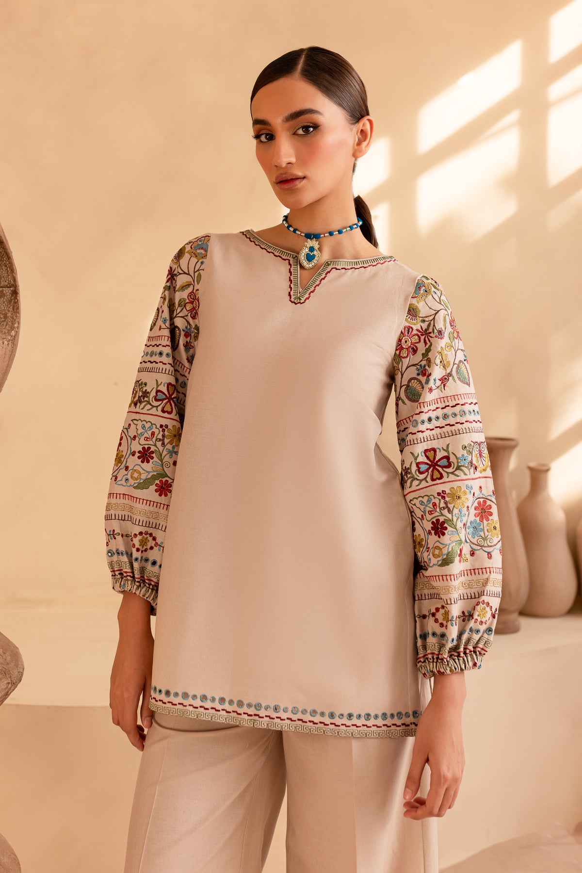 Paired with embroidered high-waisted khaddar pants, designed with side pockets and a zipper closure, this set offers both elegance and comfort.