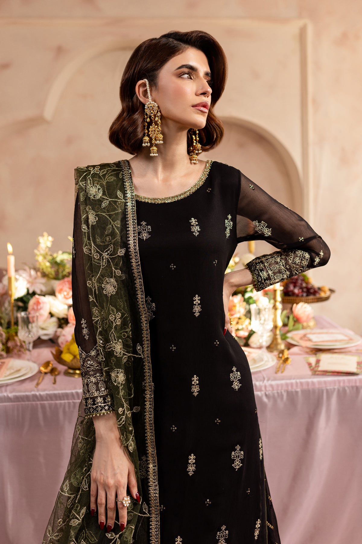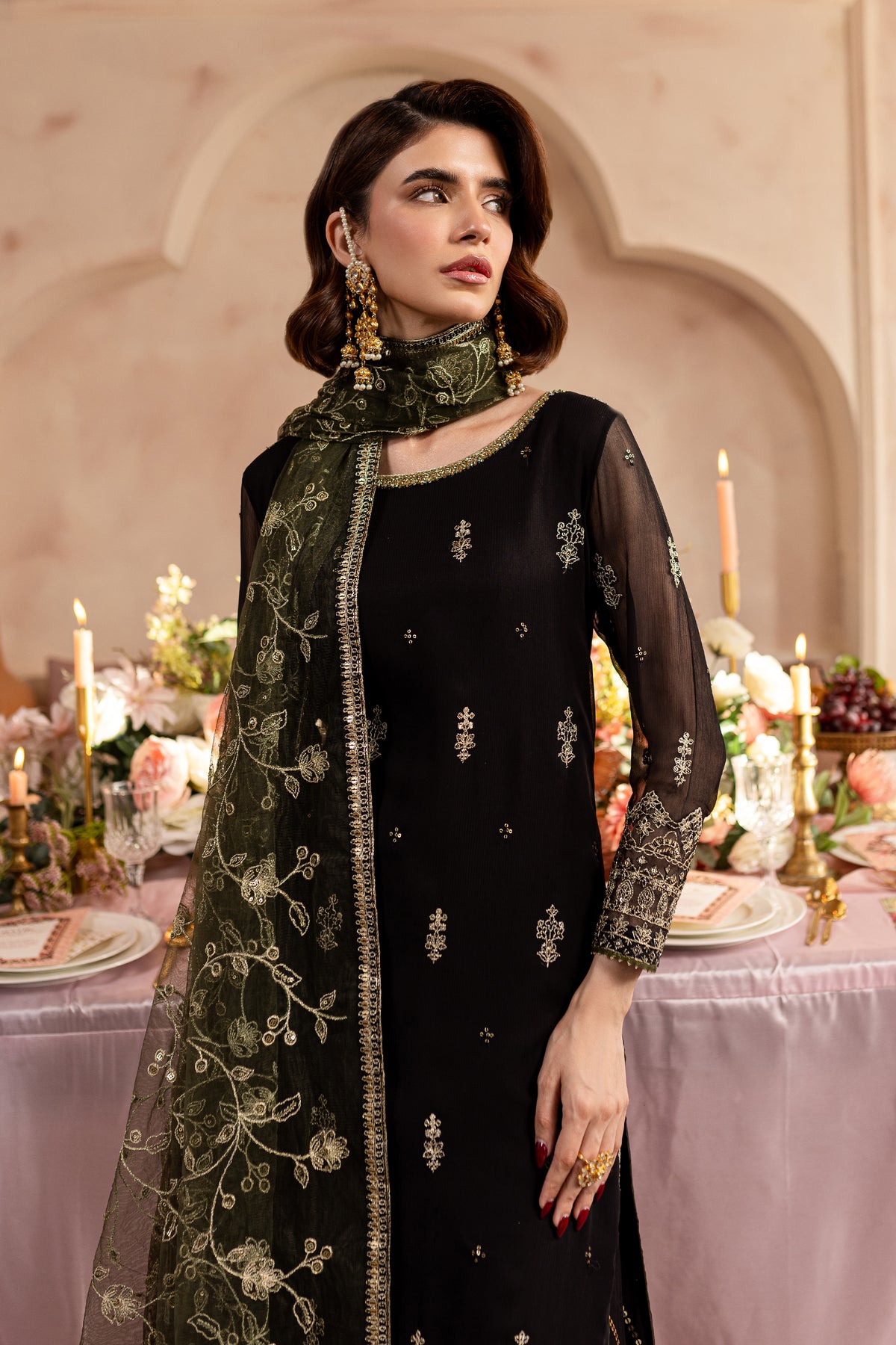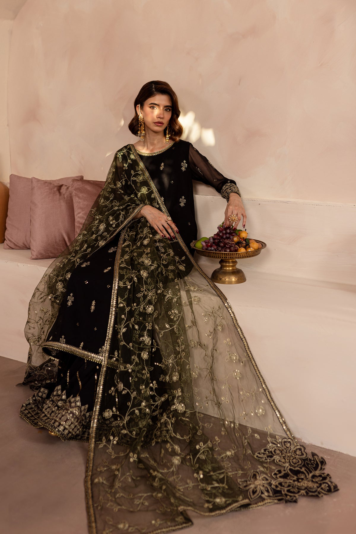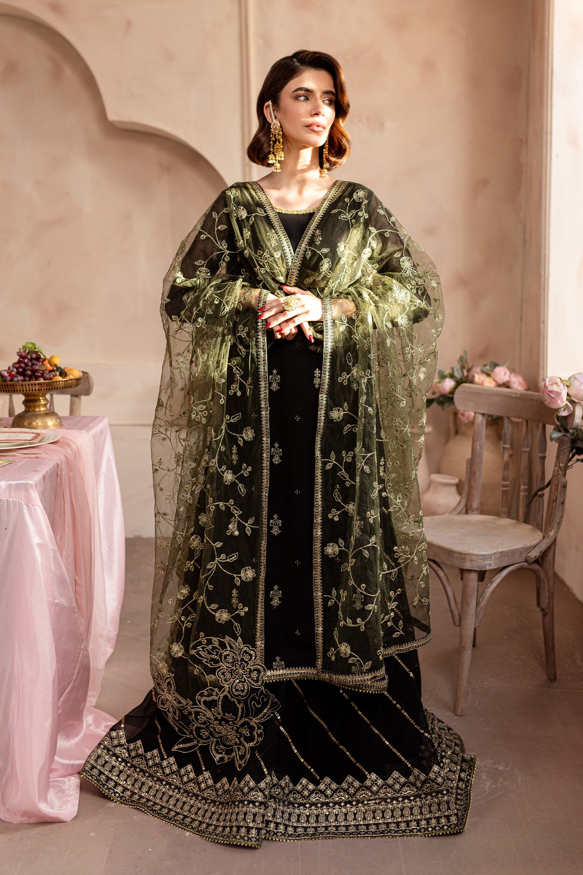 The net dupatta fully embroidered to perfection drapes effortlessly while adding a layer of elegance and sophistication to this all-black look.