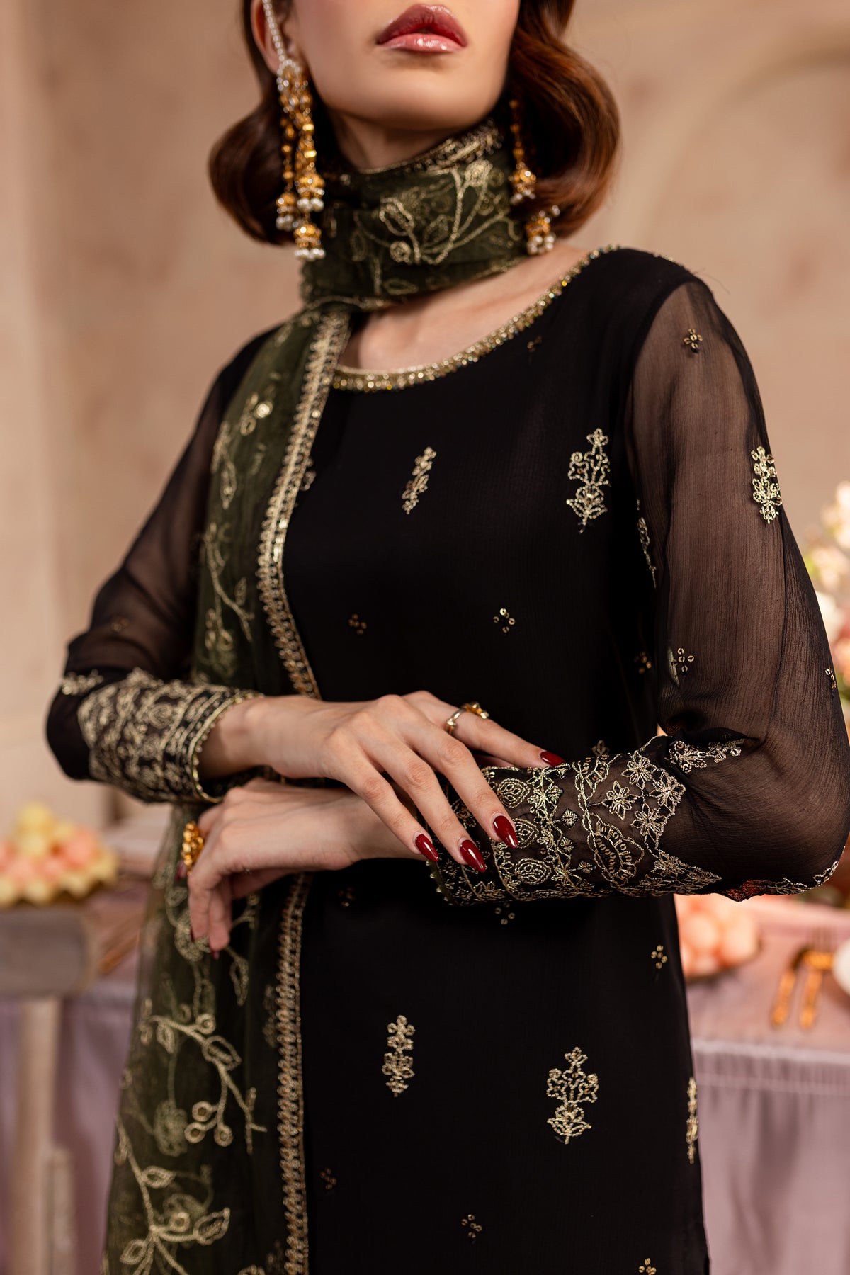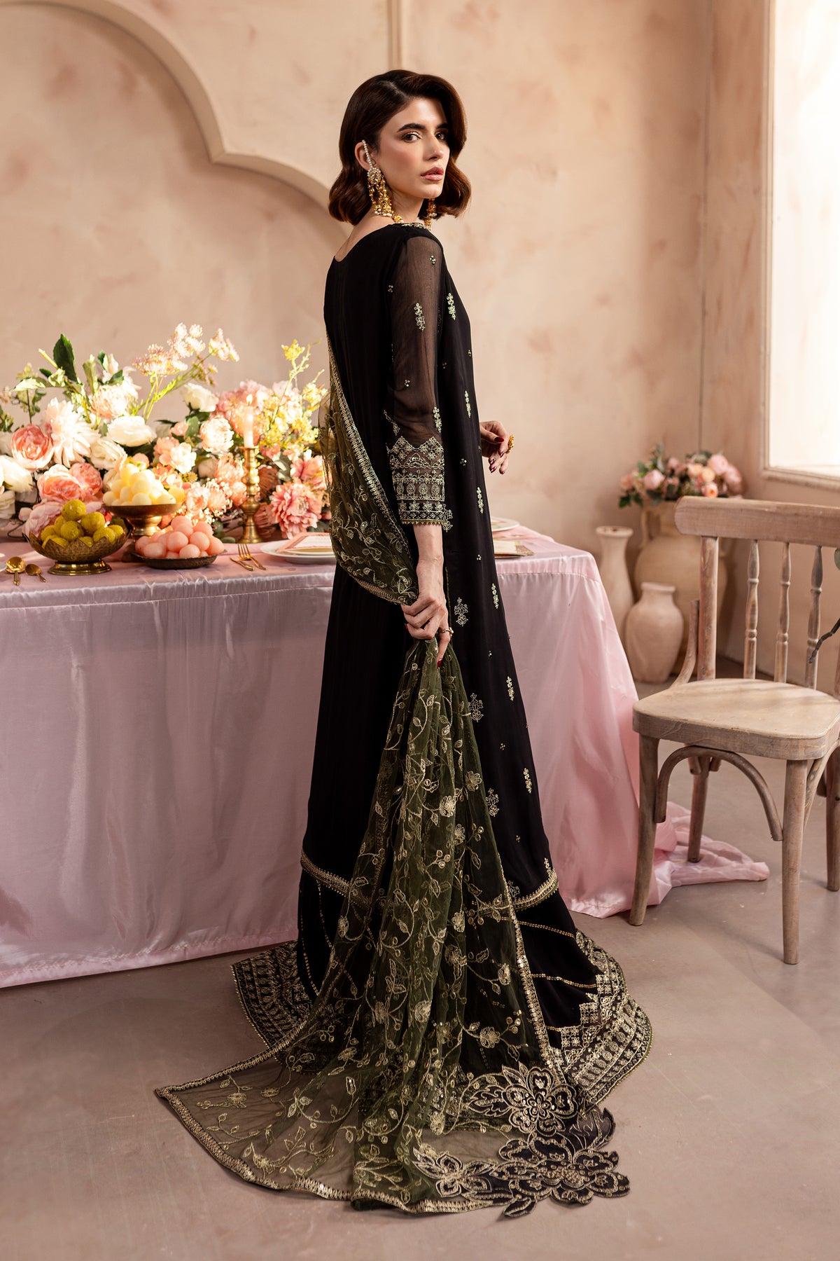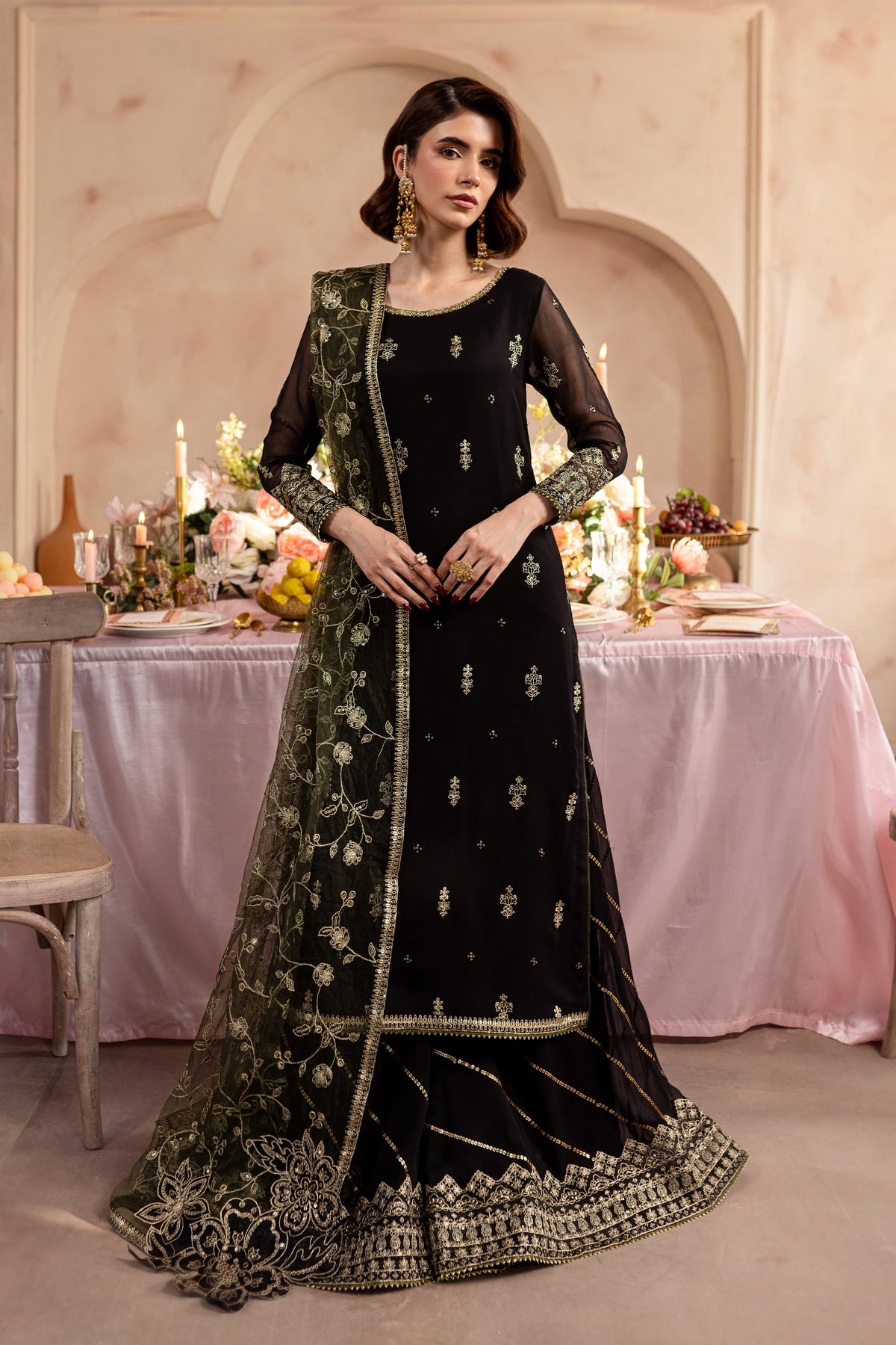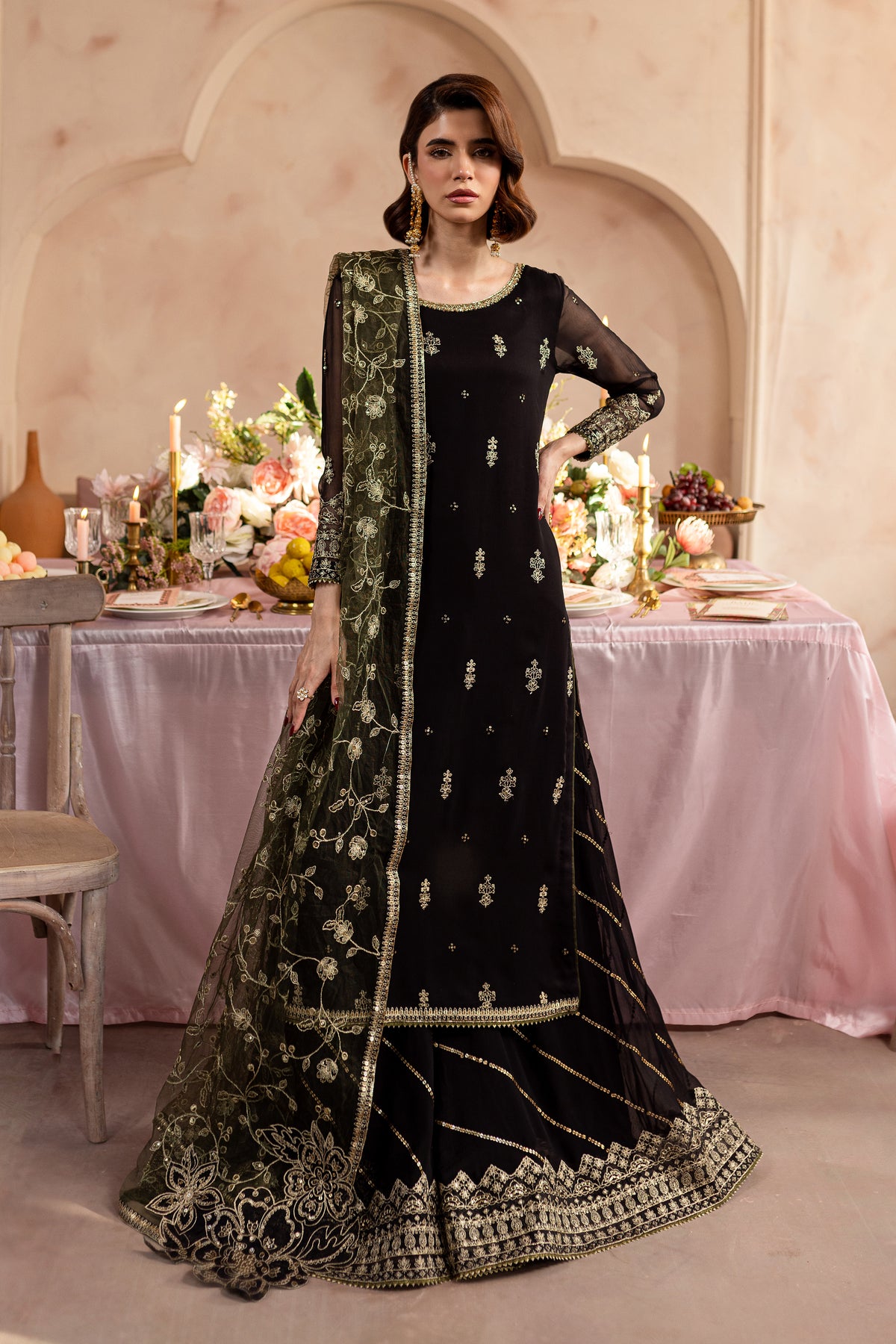 The net dupatta fully embroidered to perfection drapes effortlessly while adding a layer of elegance and sophistication to this all-black look.