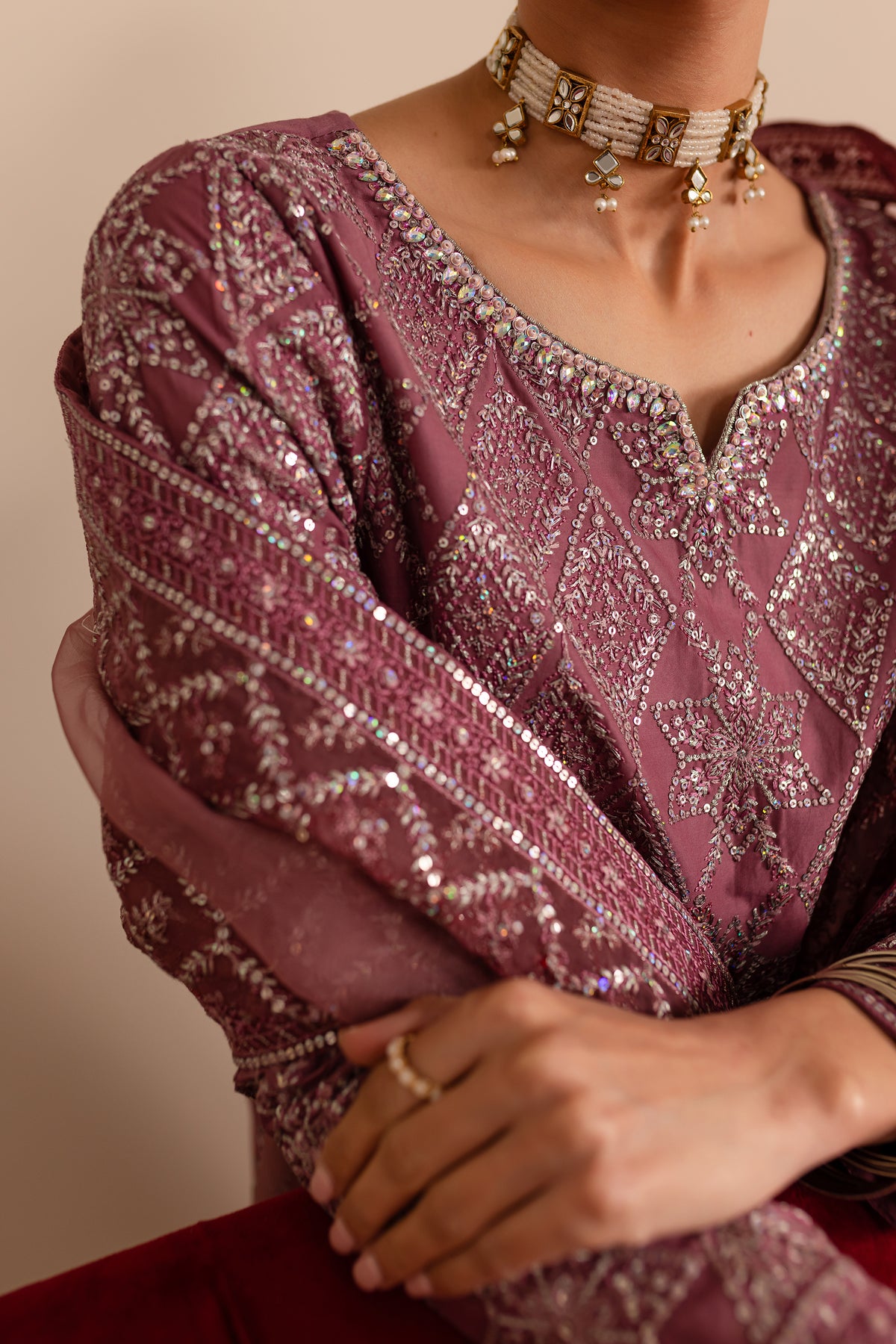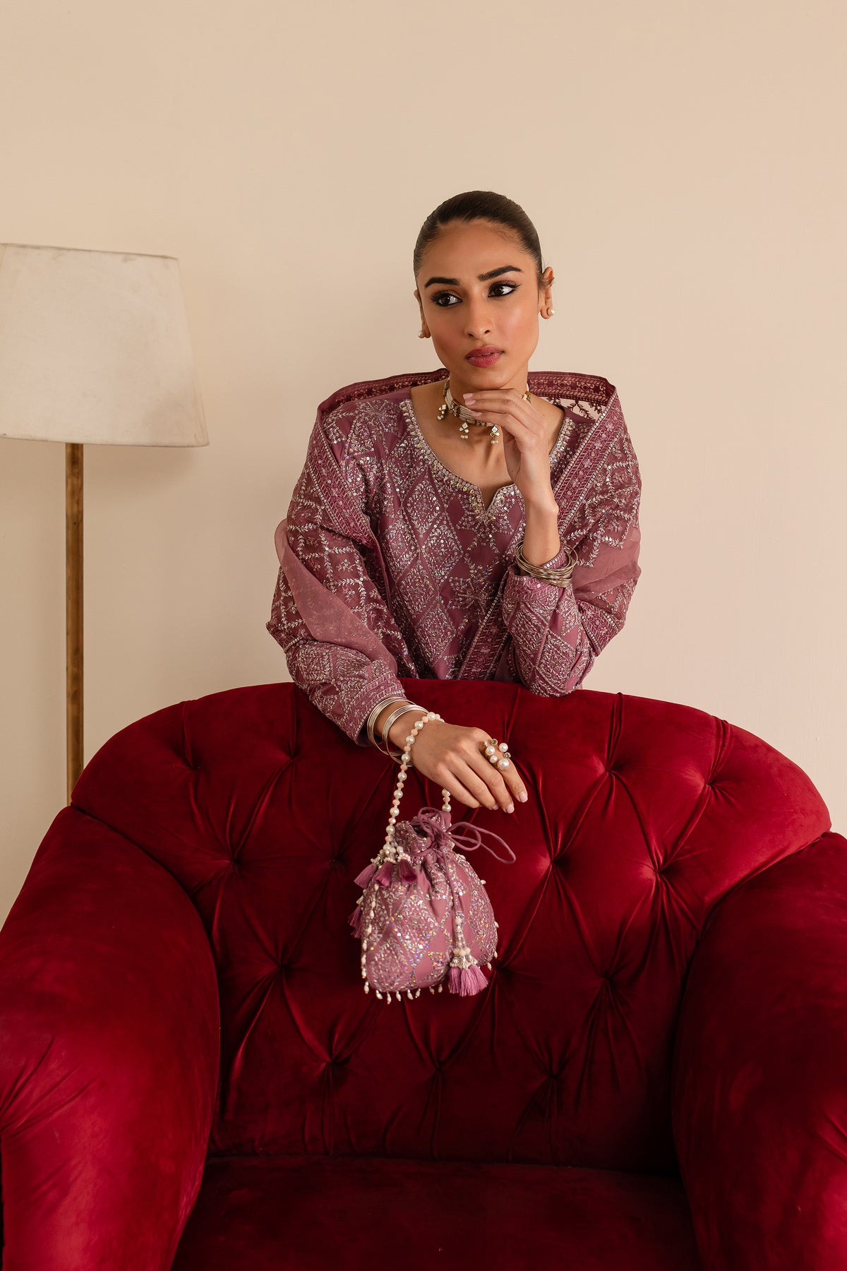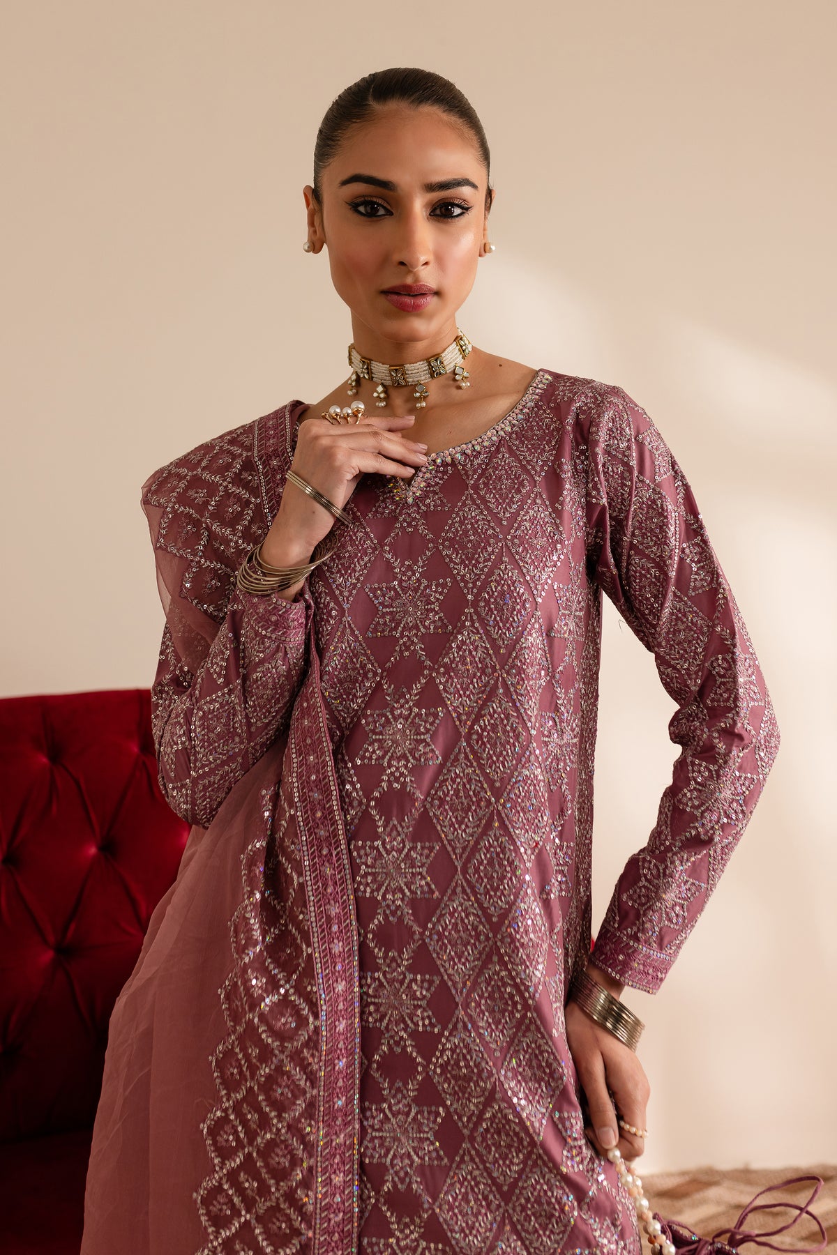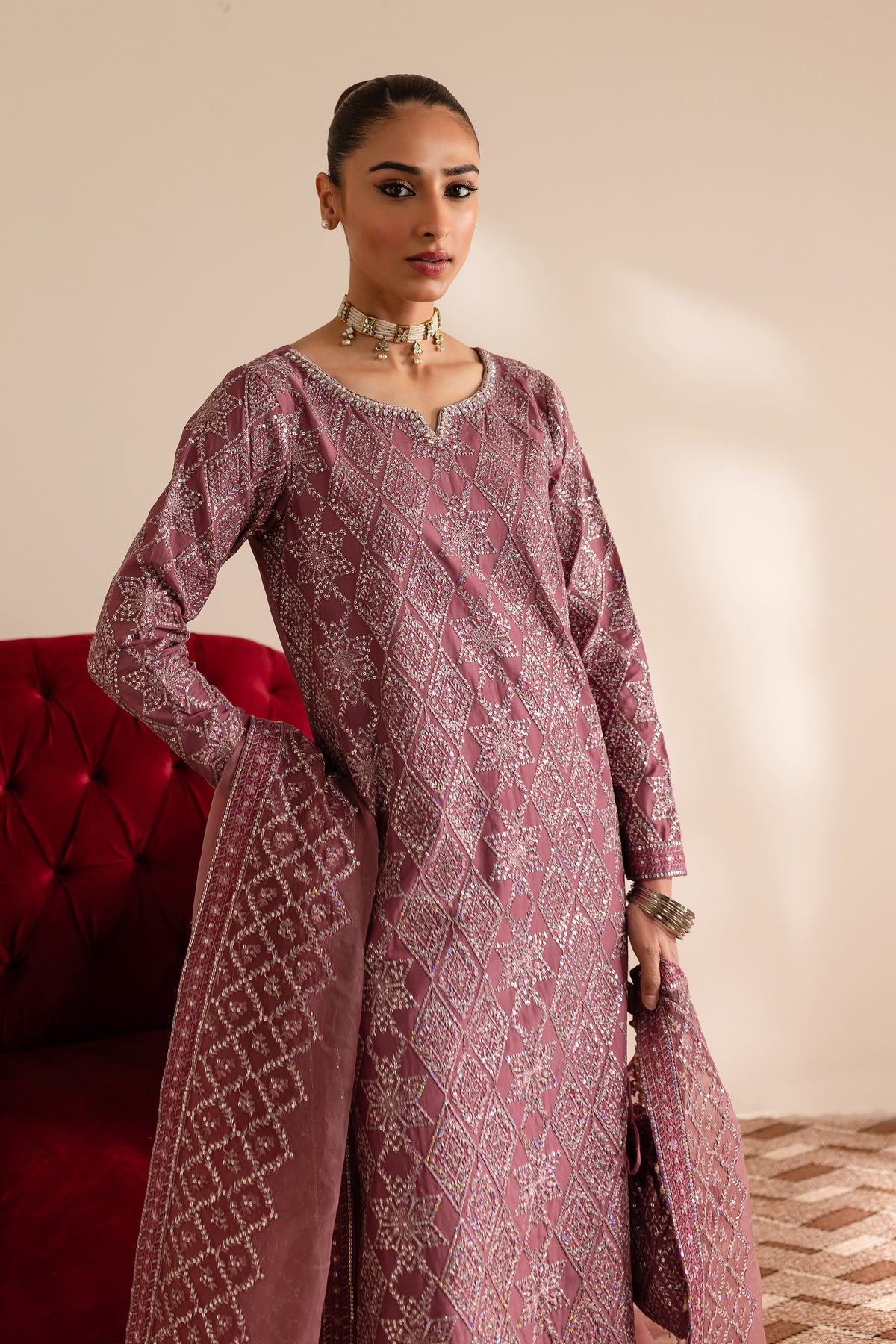 This heavy embroidered mauve Pima lawn shirt features direct adda work at the neckline, adding a unique and intricate detail. The sleeves are beautifully embroidered with a border at the hem, and the hem of the shirt is finished with a decorative border, enhancing its refined design.