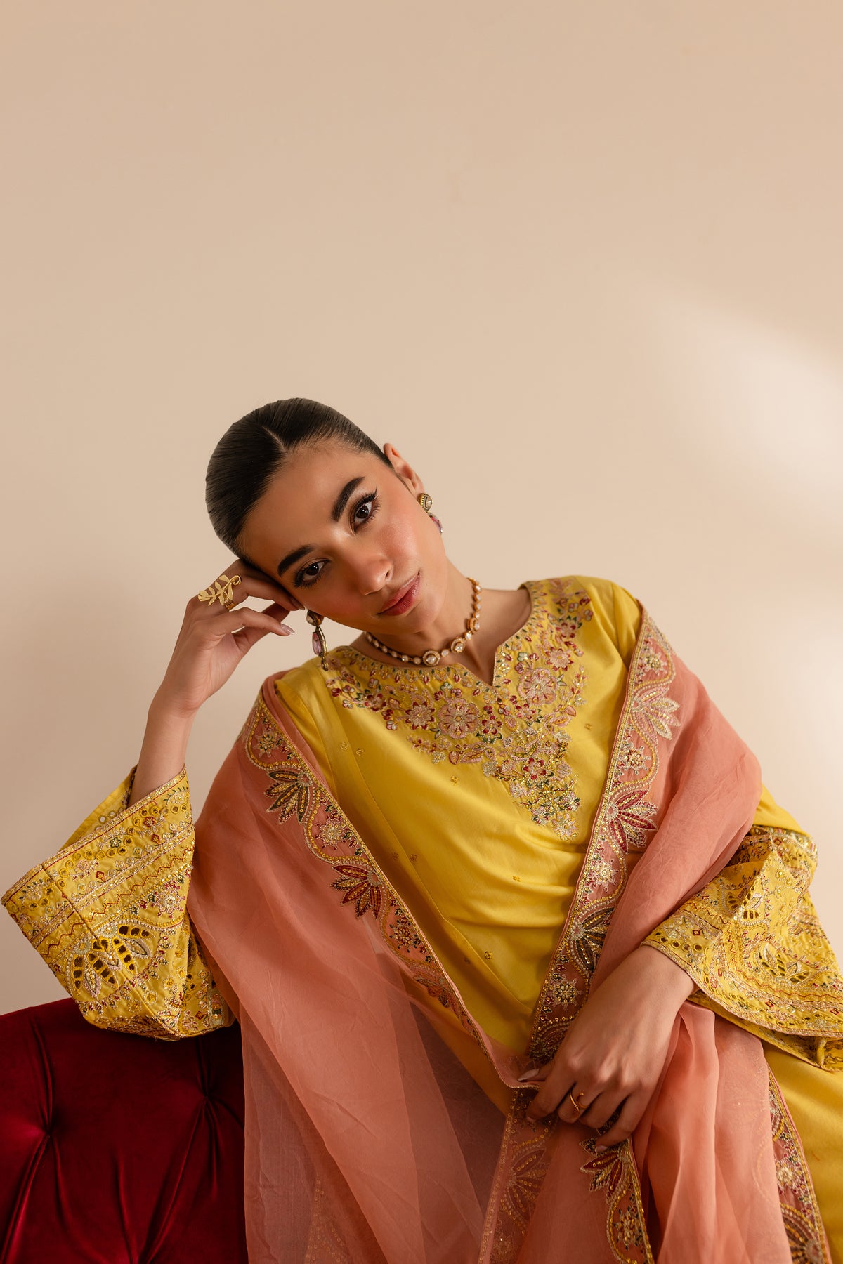 This lemon yellow Pima lawn long shirt features beautiful embroidery on the neckline and spread across the front. The sleeves are embroidered with an organza border at the hem, and a matching border is added along the hem of the shirt for a cohesive design.