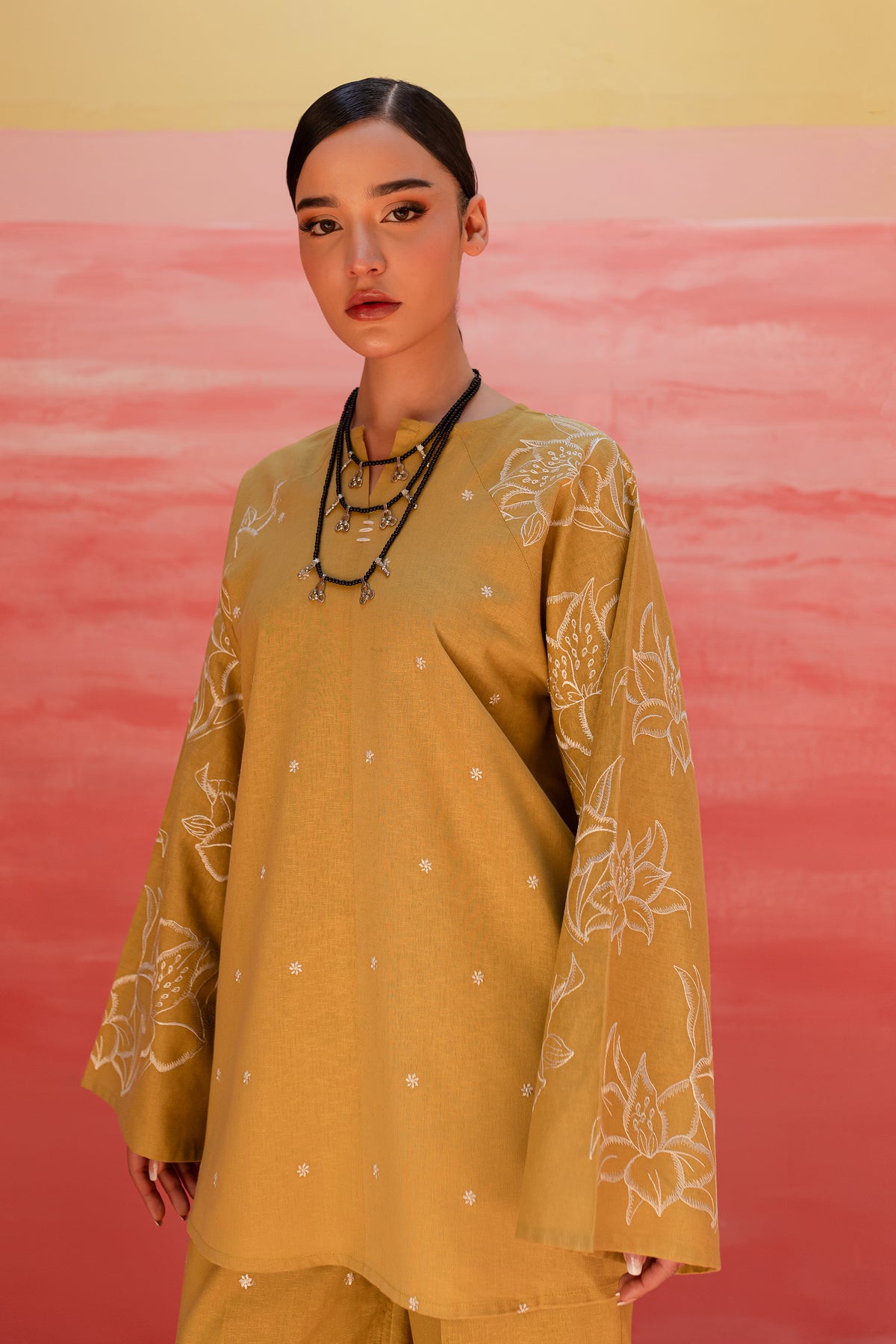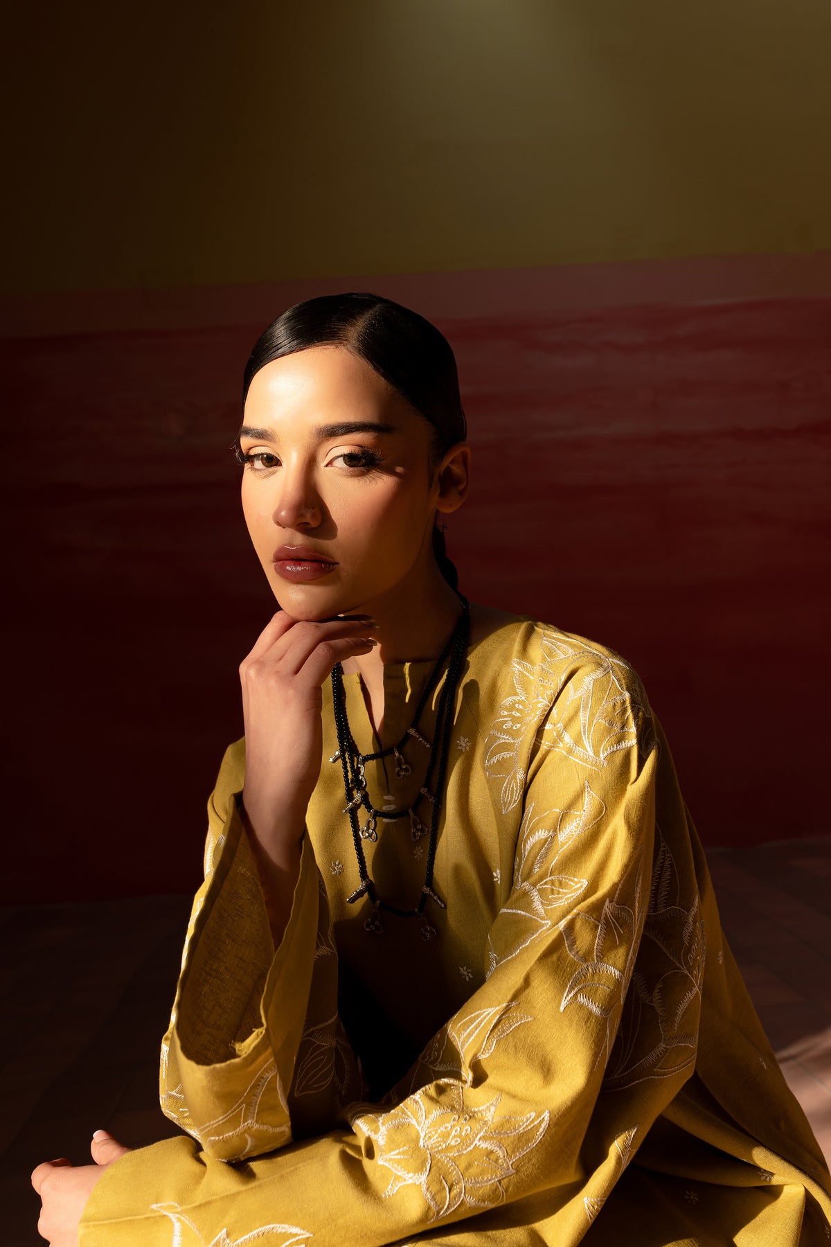 This stylish lime colored 2-piece karandi set combines modern flair with artisanal detailing. The flared shirt features raglan sleeves and is adorned with matte thread embroidery, with subtle handwork on the neckline for an elegant touch.