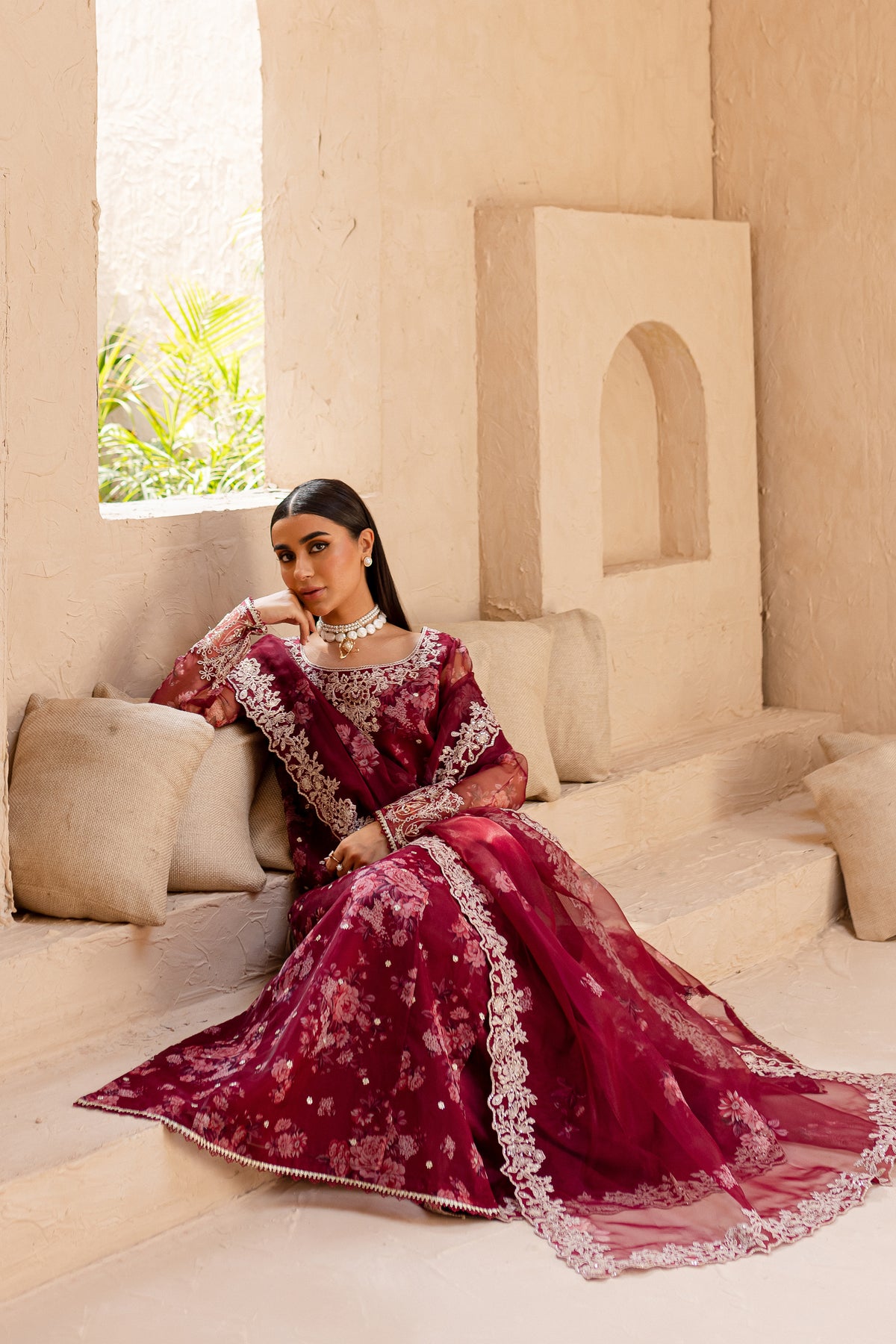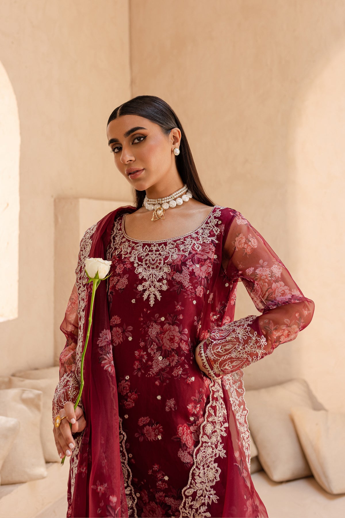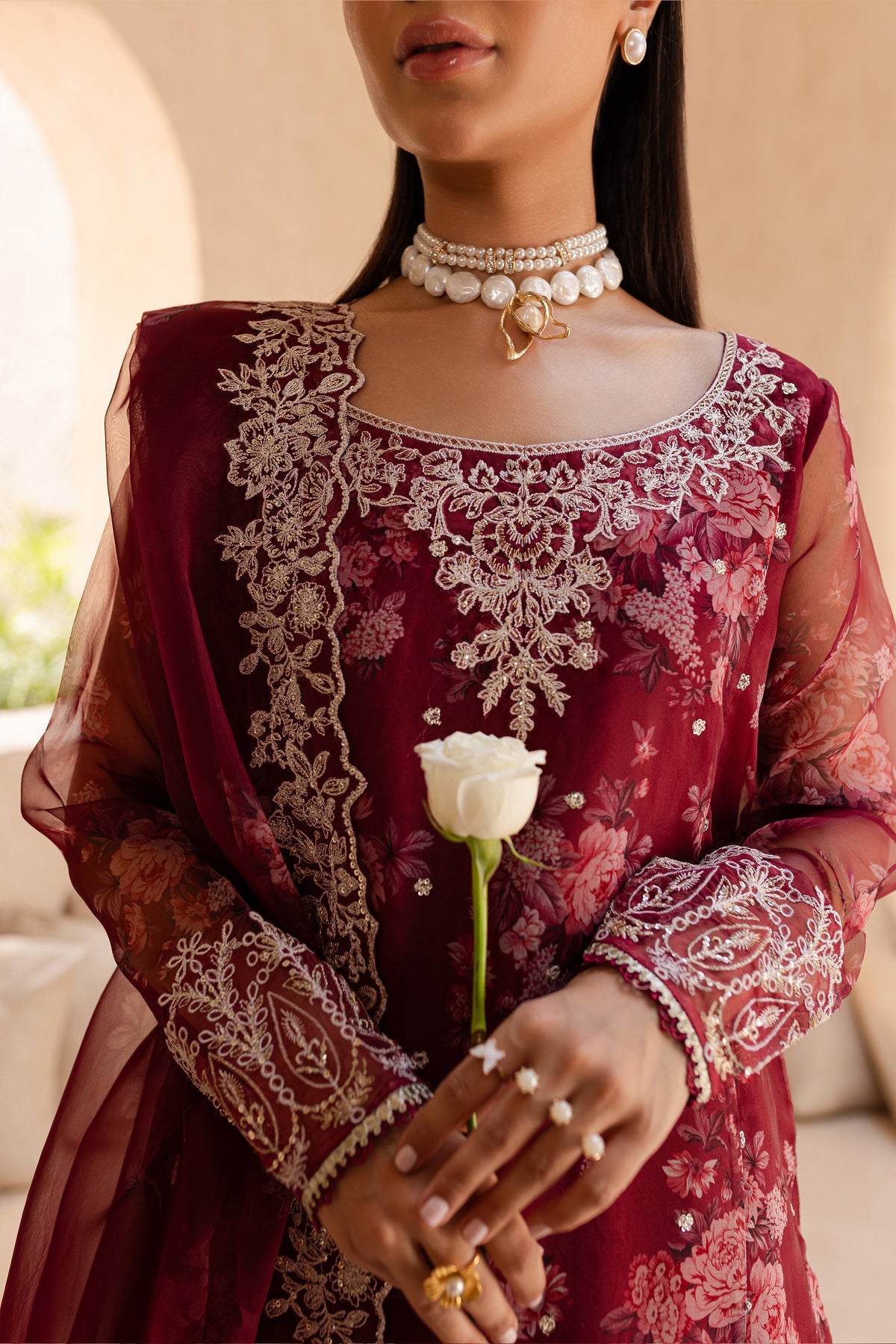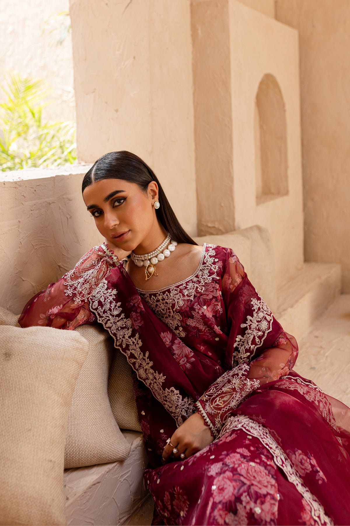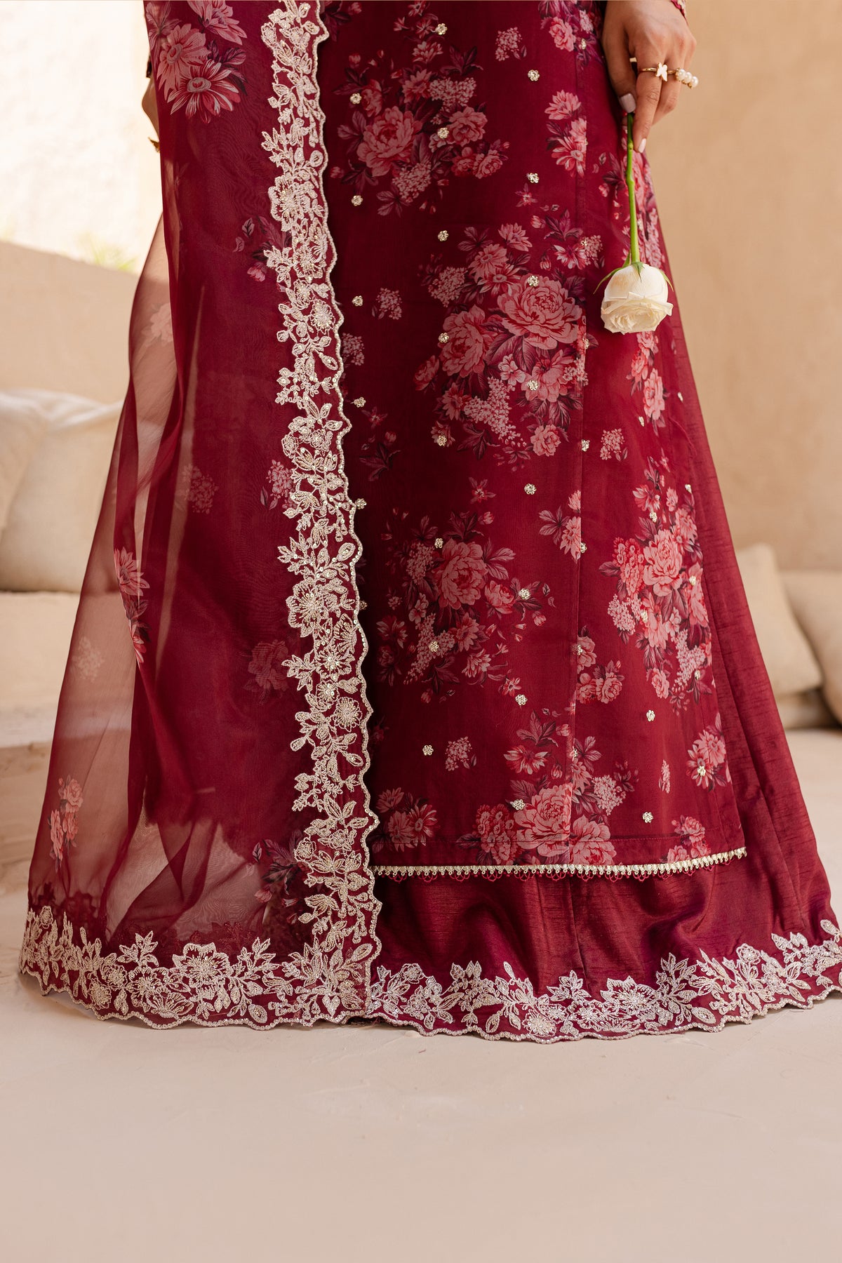 Complemented by a printed organza dupatta featuring embroidered borders on four sides.