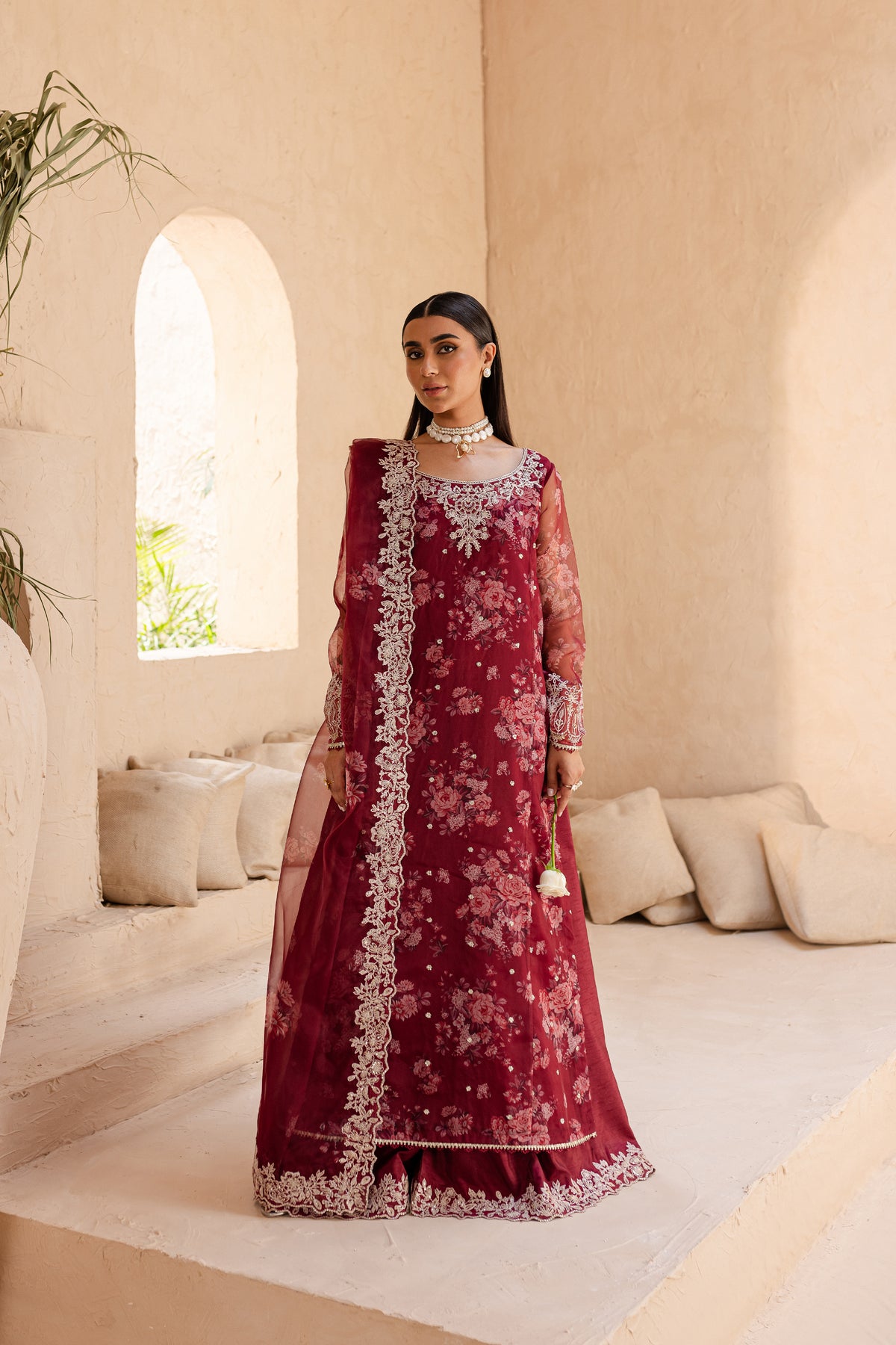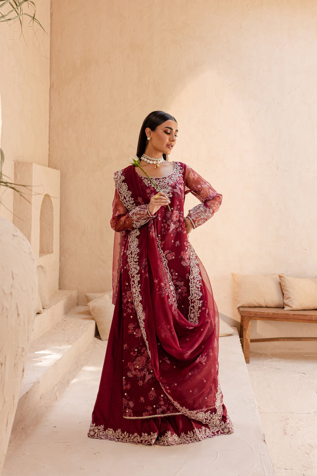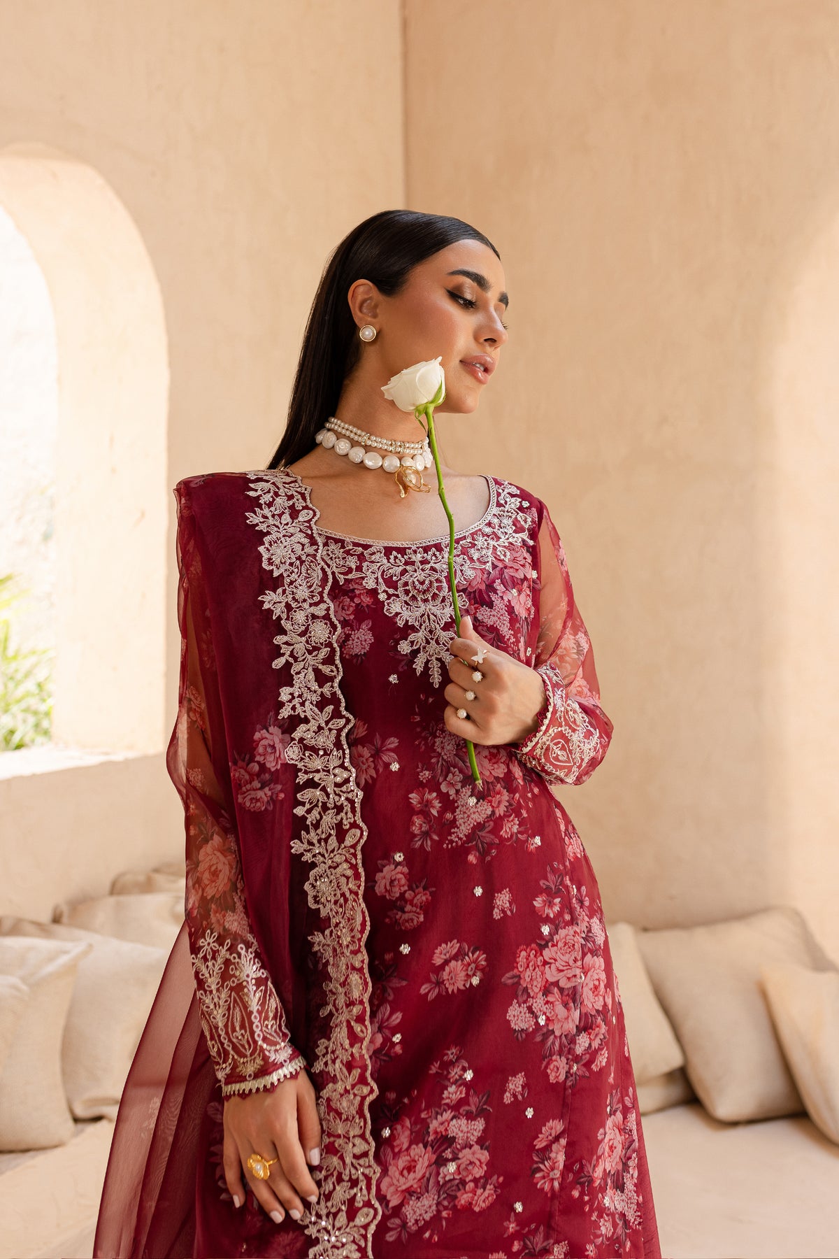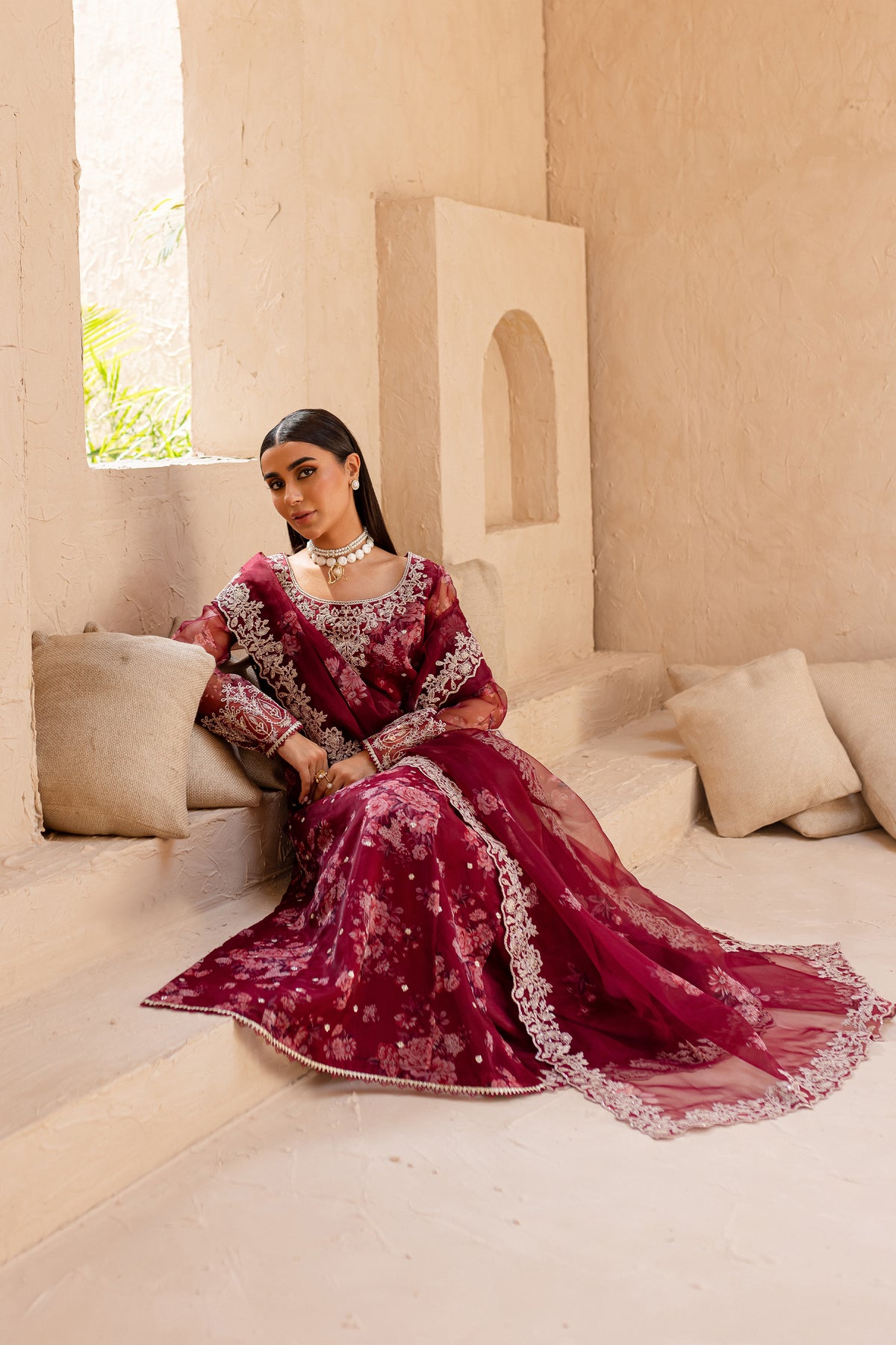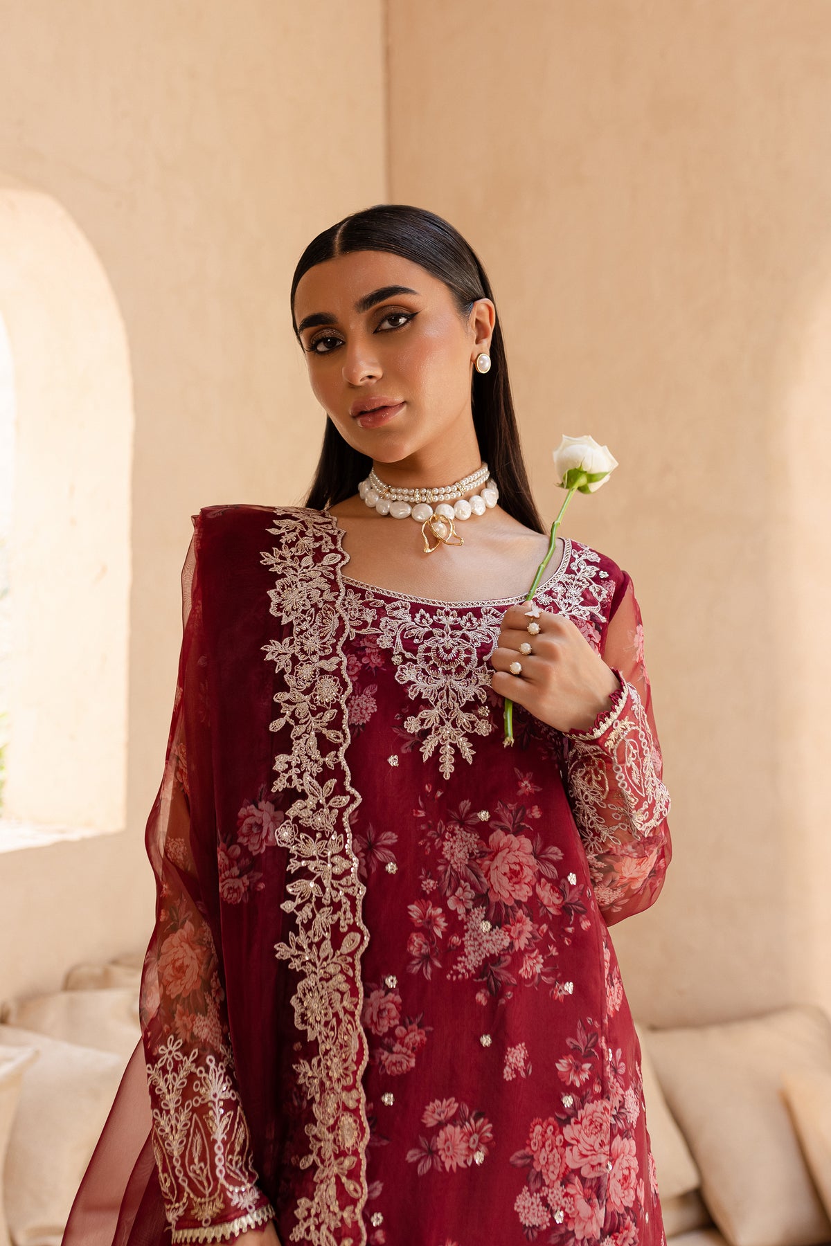 Complemented by a printed organza dupatta featuring embroidered borders on four sides.