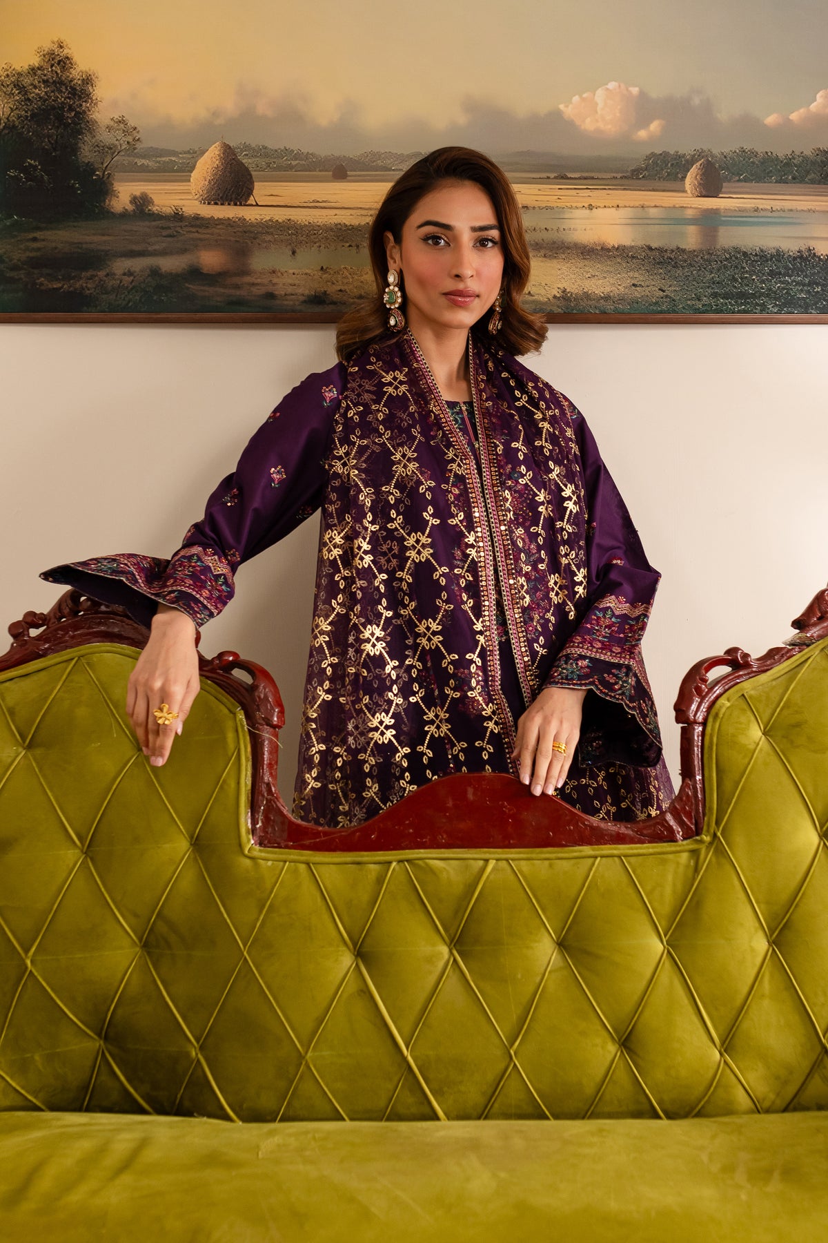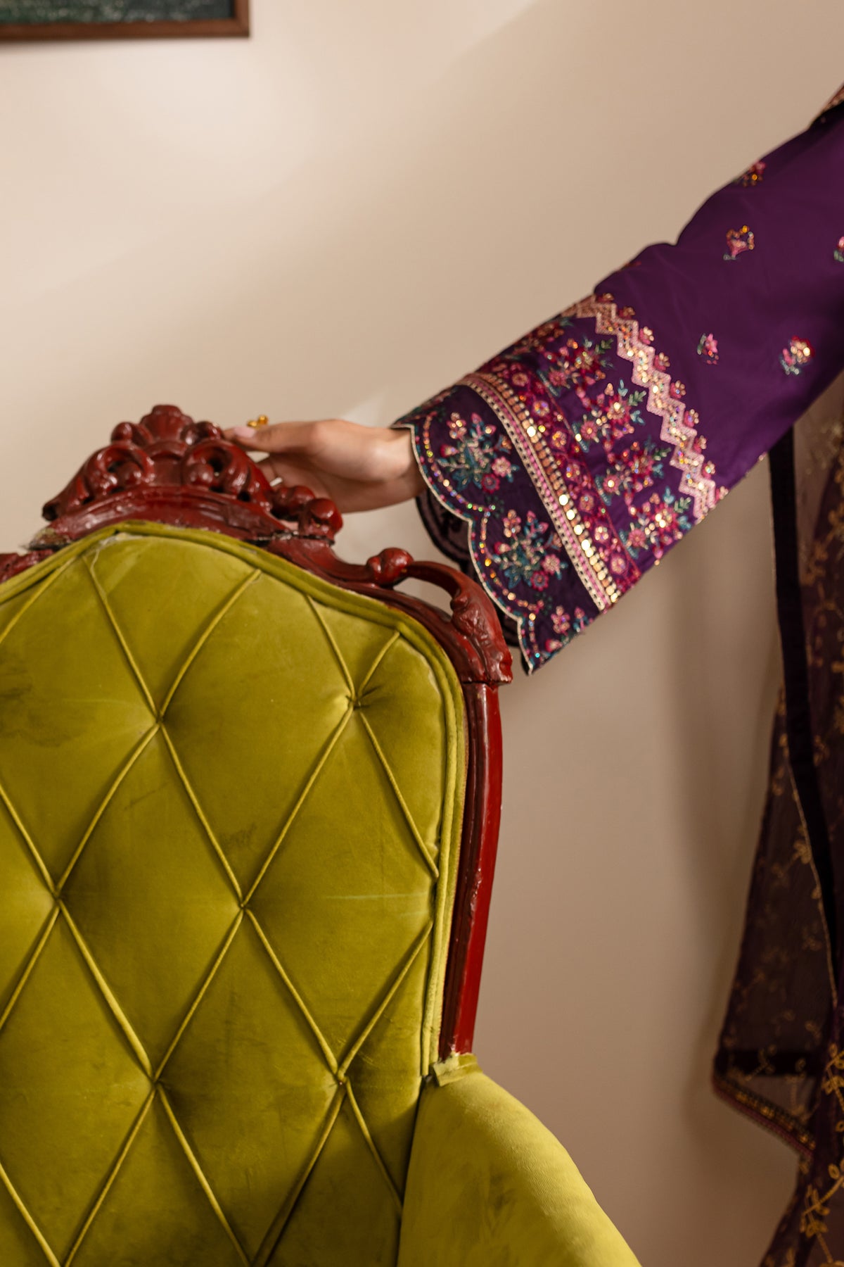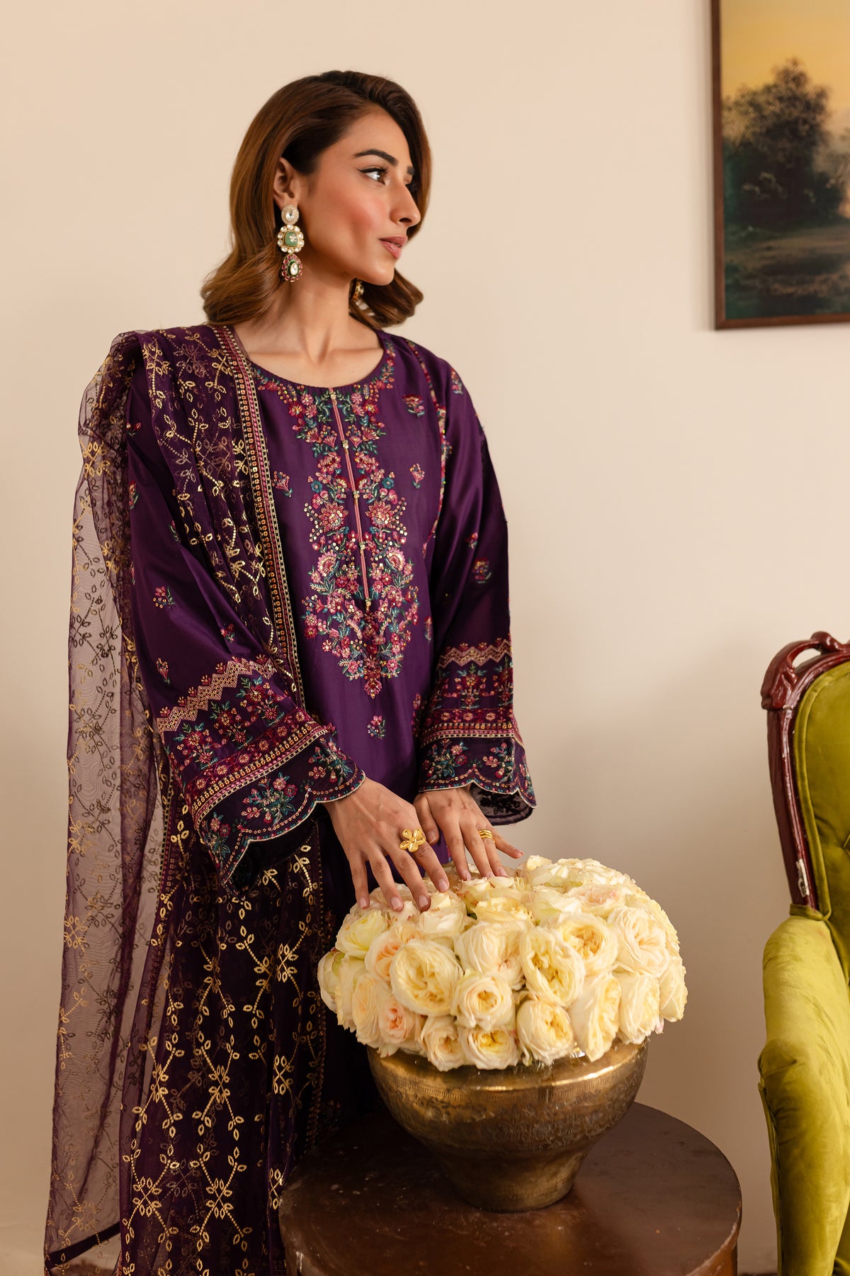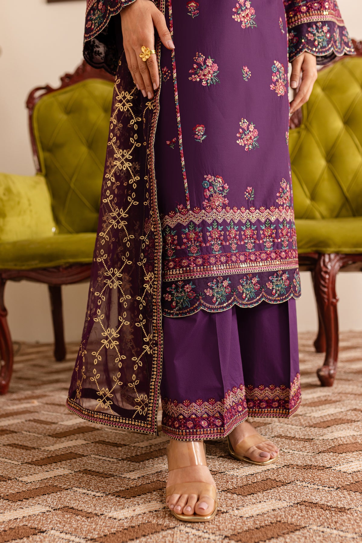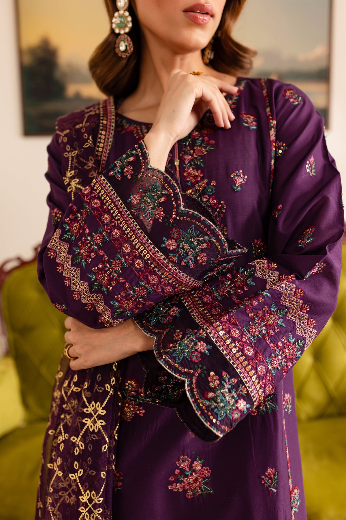 This purple Pima lawn long shirt features a contrast-colored embroidered neckline that enhances its delicate design. The shirt is beautifully embroidered on the front and sleeves, complemented by intricately composed borders with scallop finishing along the hem and sleeve cuffs, offering a refined look. The neckline also boasts contrast piping, and the material collage adds an artistic touch, making this shirt a standout piece.