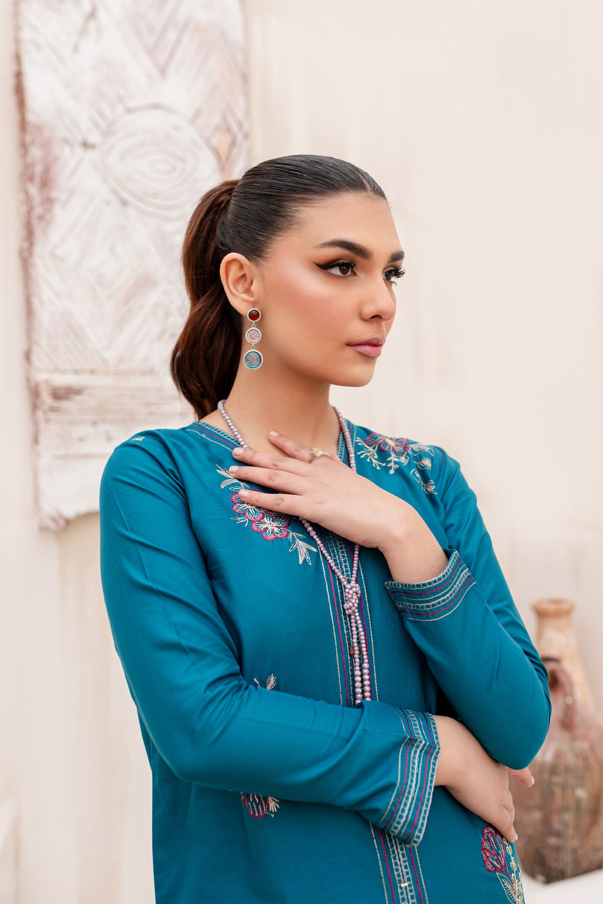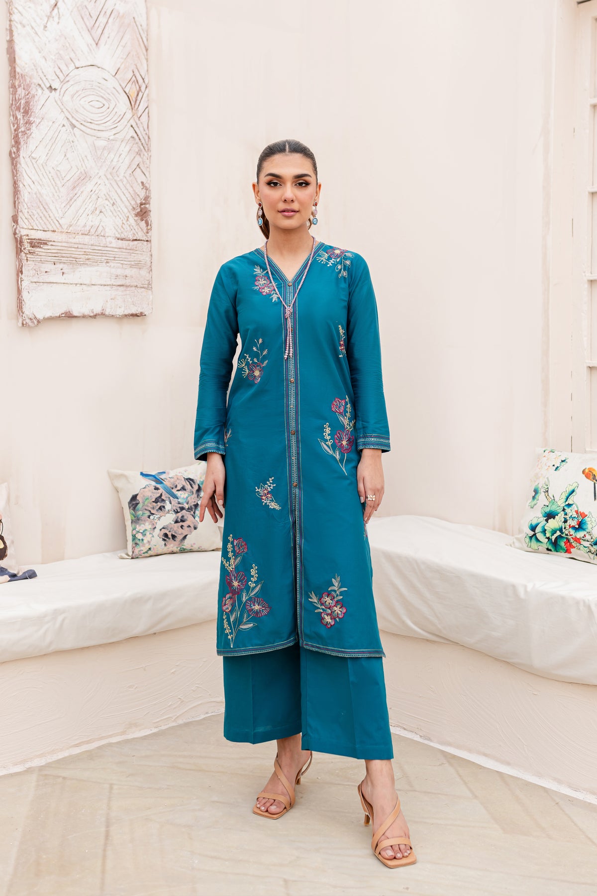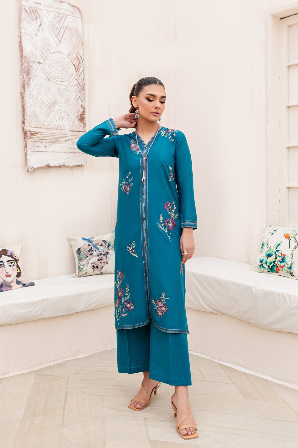 Meticulously crafted from high quality Pima lawn in the shades of Prussian blue – this outfit is a perfect pick for the season. Beautifully designed front open shirt features composed embroidery spread all over in contrasting colors. Further enhanced with button embellishments at center front. Sleeves are fitted with border detail at cuffs.