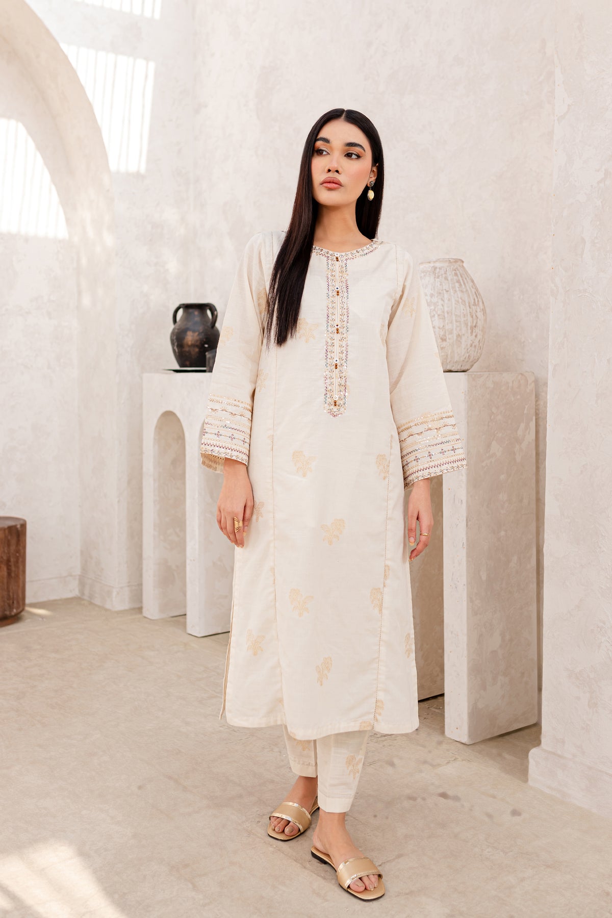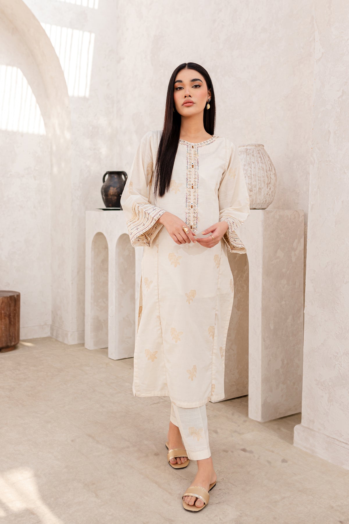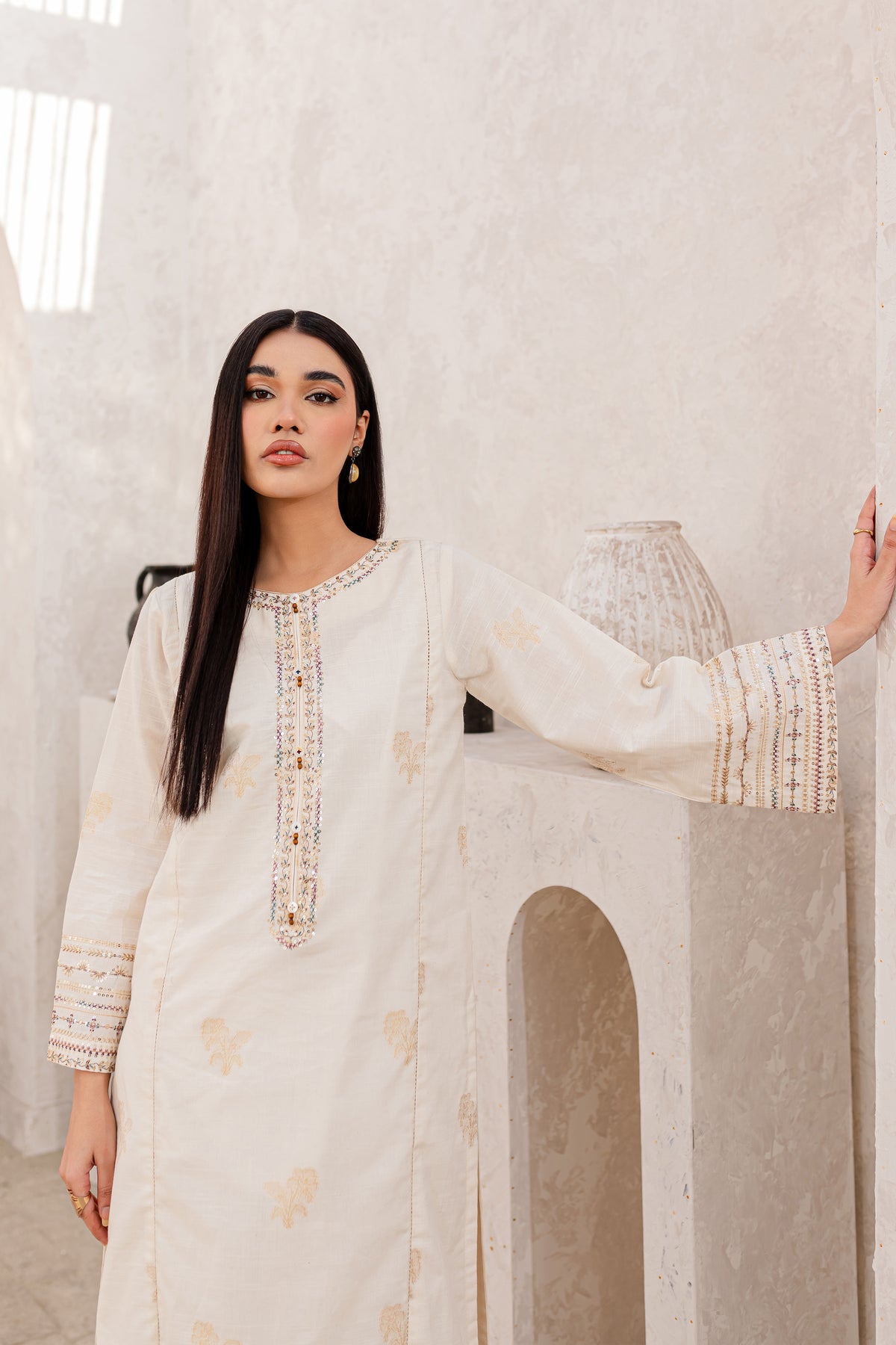 Experience an unparalleled comfort with finely woven yarn-dyed jacquard in the shades of off-white. Beautifully designed paneled shirt features an embroidered neckline with button embellishments. Loose fit sleeves are adorned with intricately embroidered borders.
