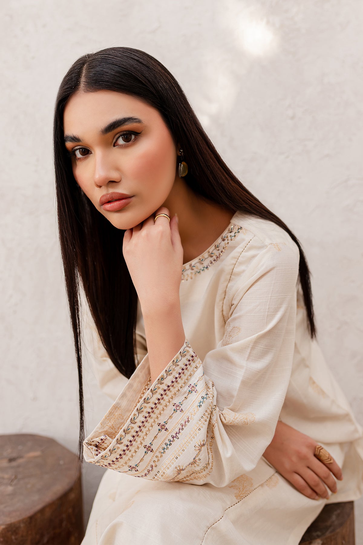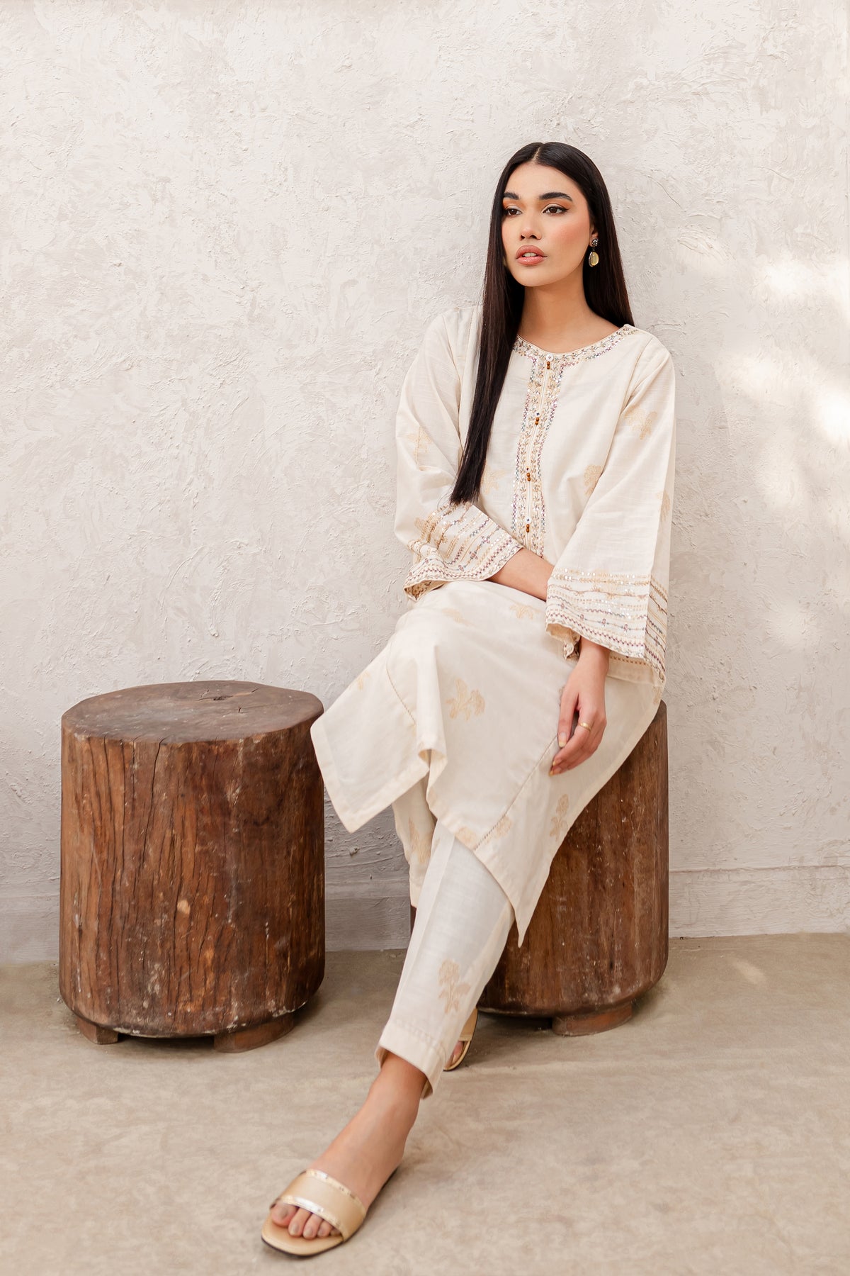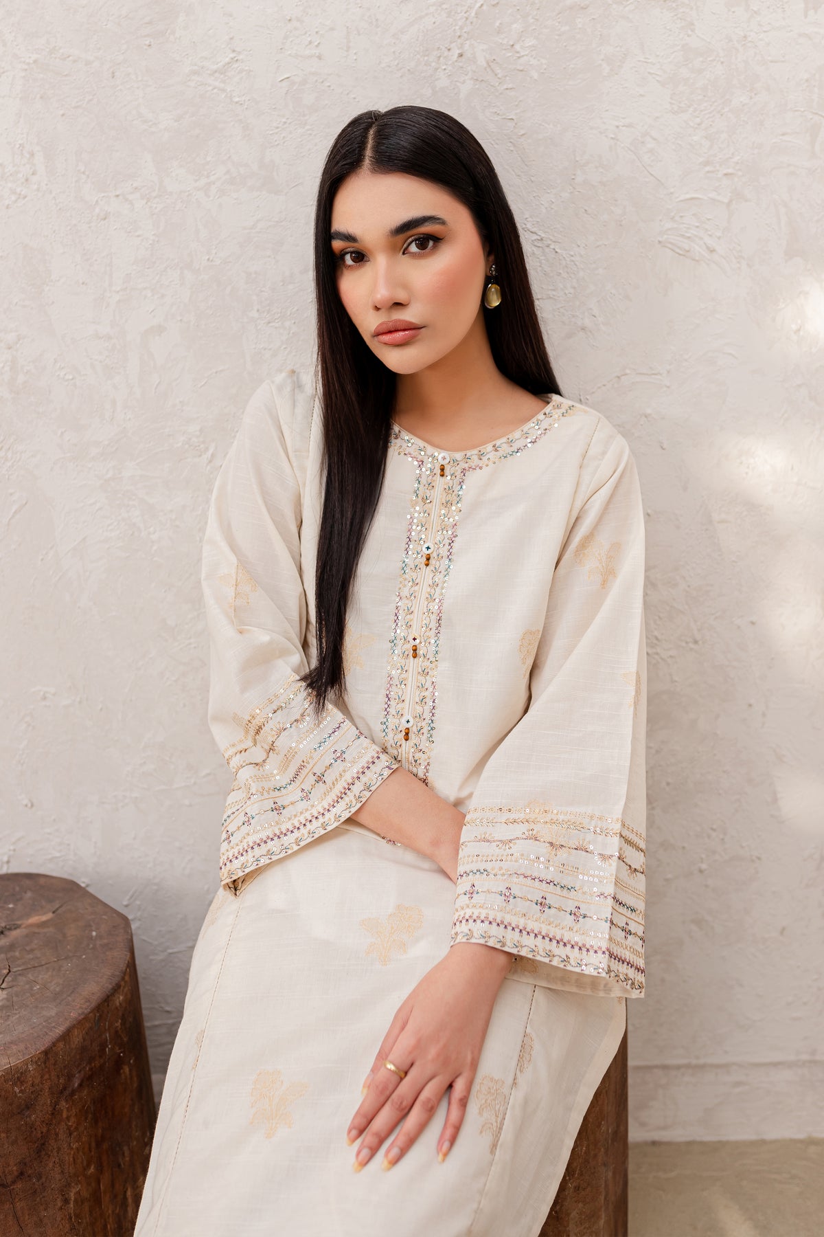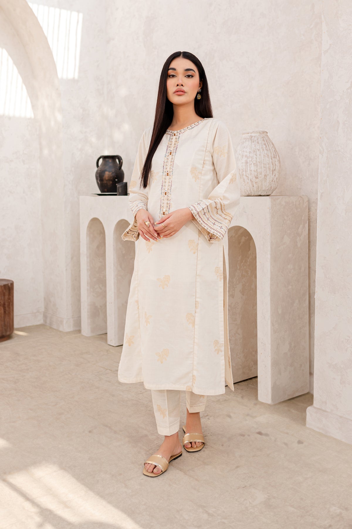 Experience an unparalleled comfort with finely woven yarn-dyed jacquard in the shades of off-white. Beautifully designed paneled shirt features an embroidered neckline with button embellishments. Loose fit sleeves are adorned with intricately embroidered borders.