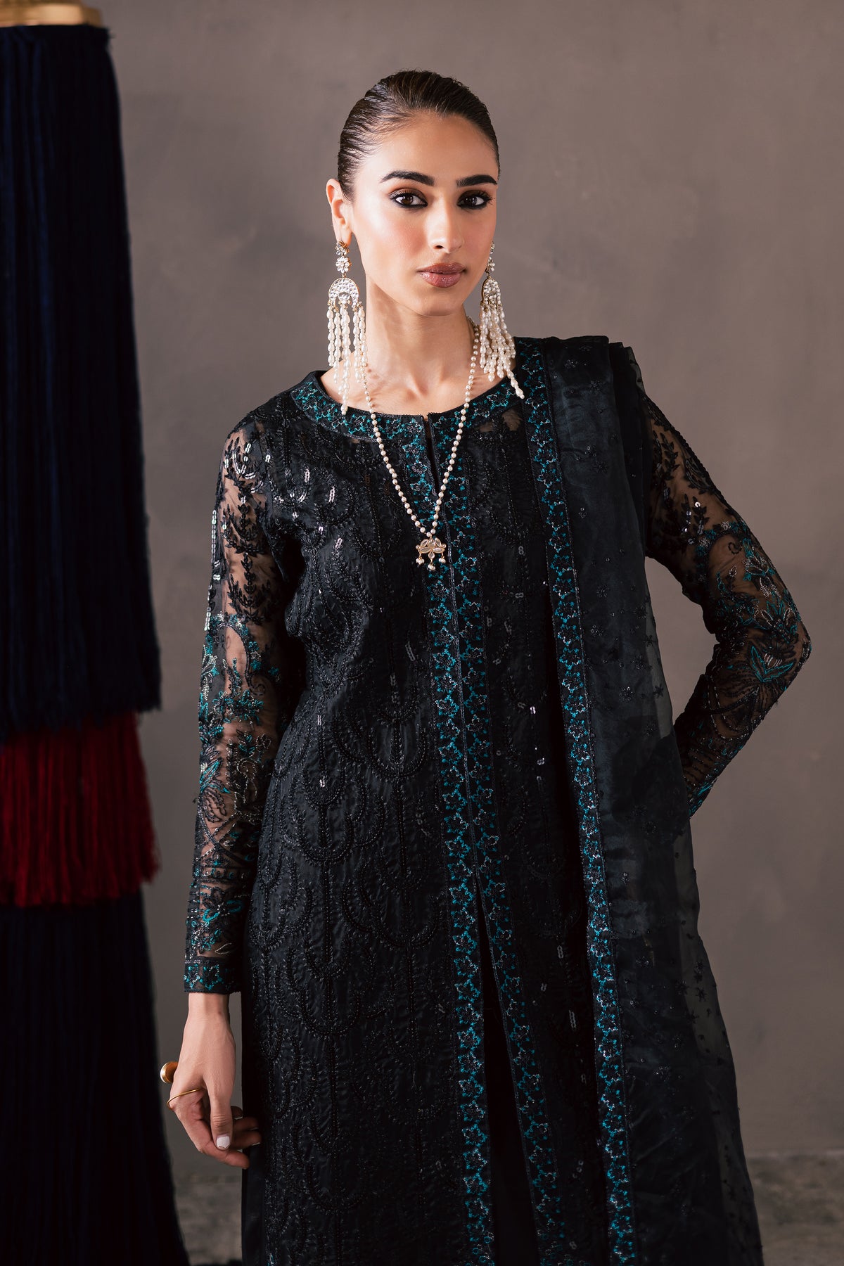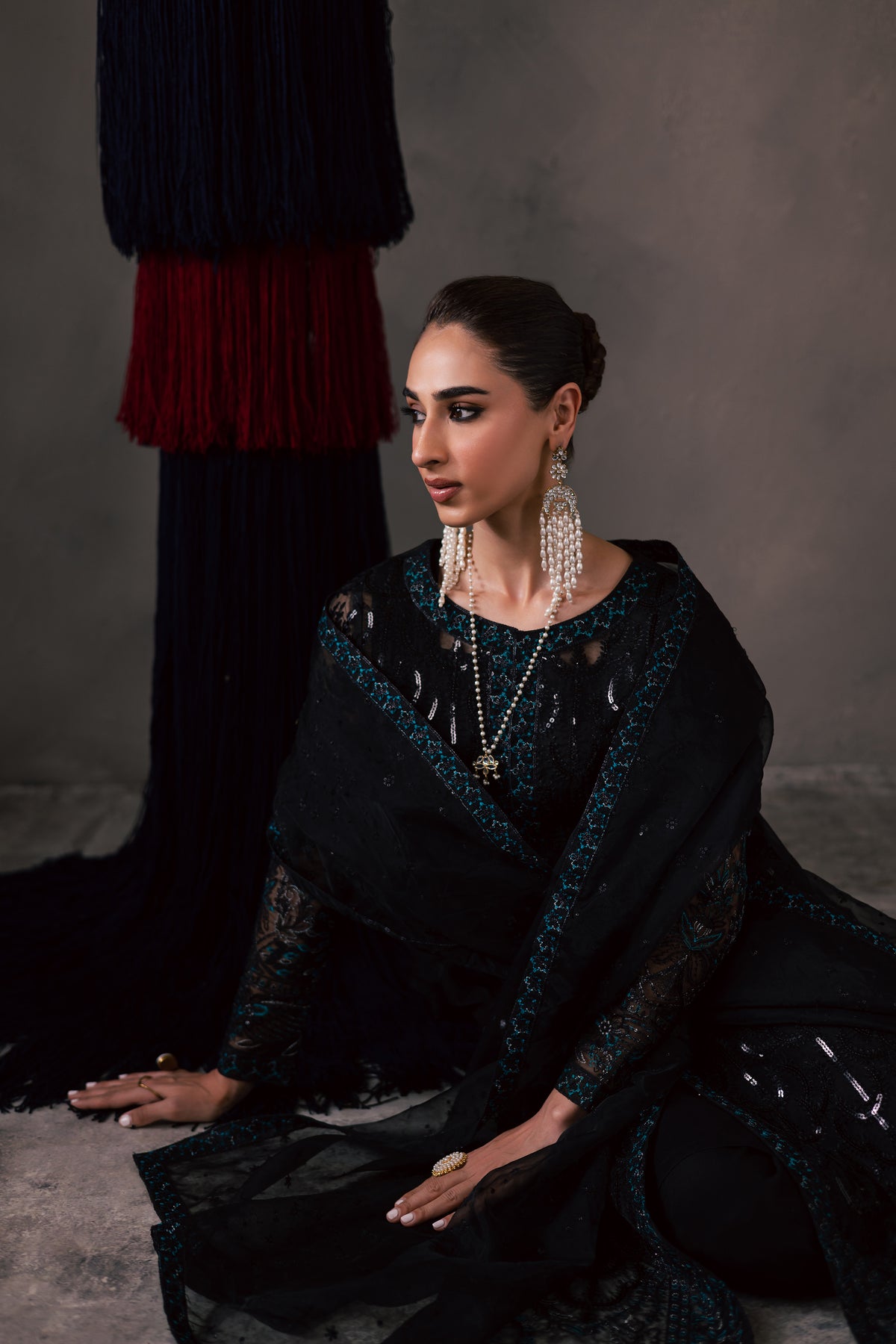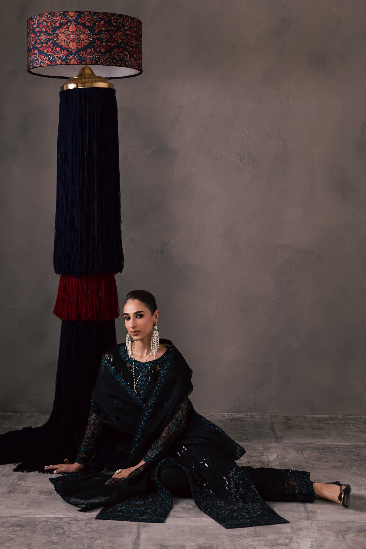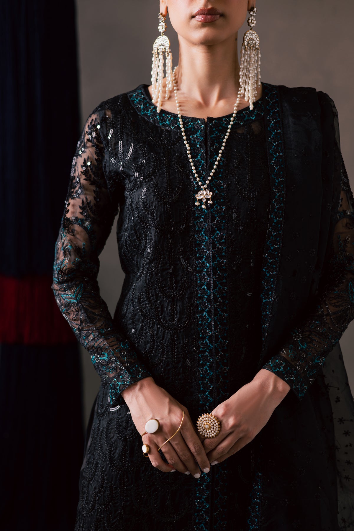 This striking ensemble features a black organza front-open shirt with an inner lining, richly adorned with intricate embroidery spread across the fabric. Teal threadwork adds a beautiful contrast and depth, enhancing the elegance of the design.