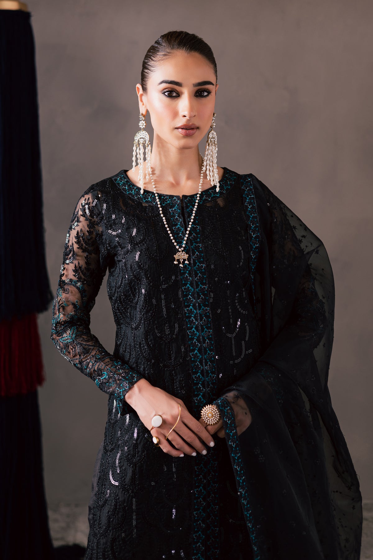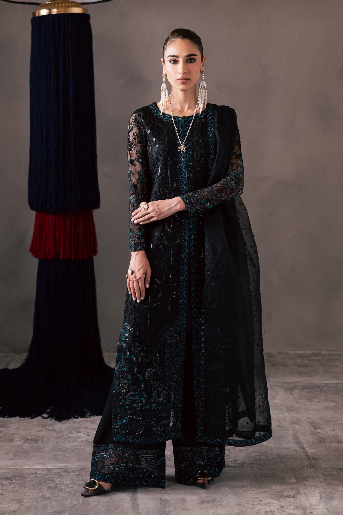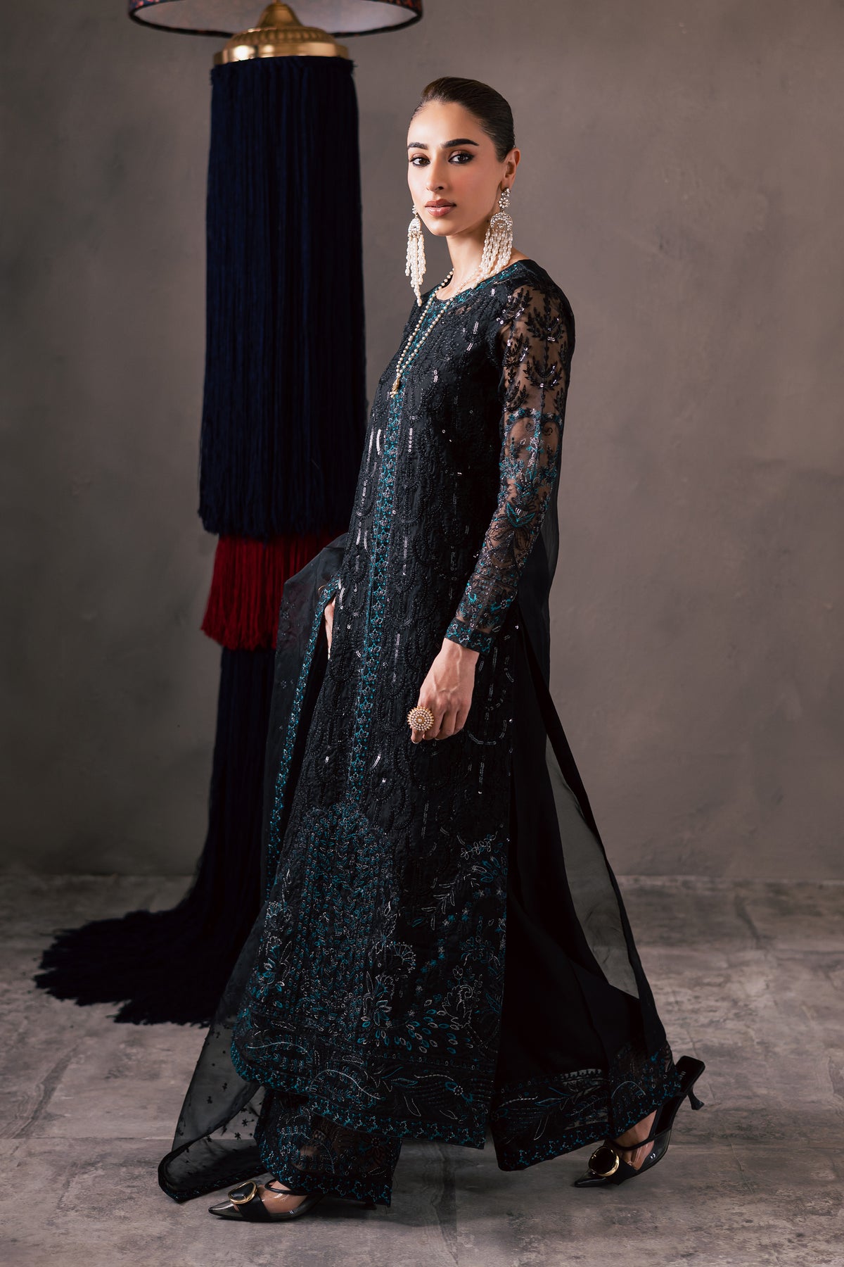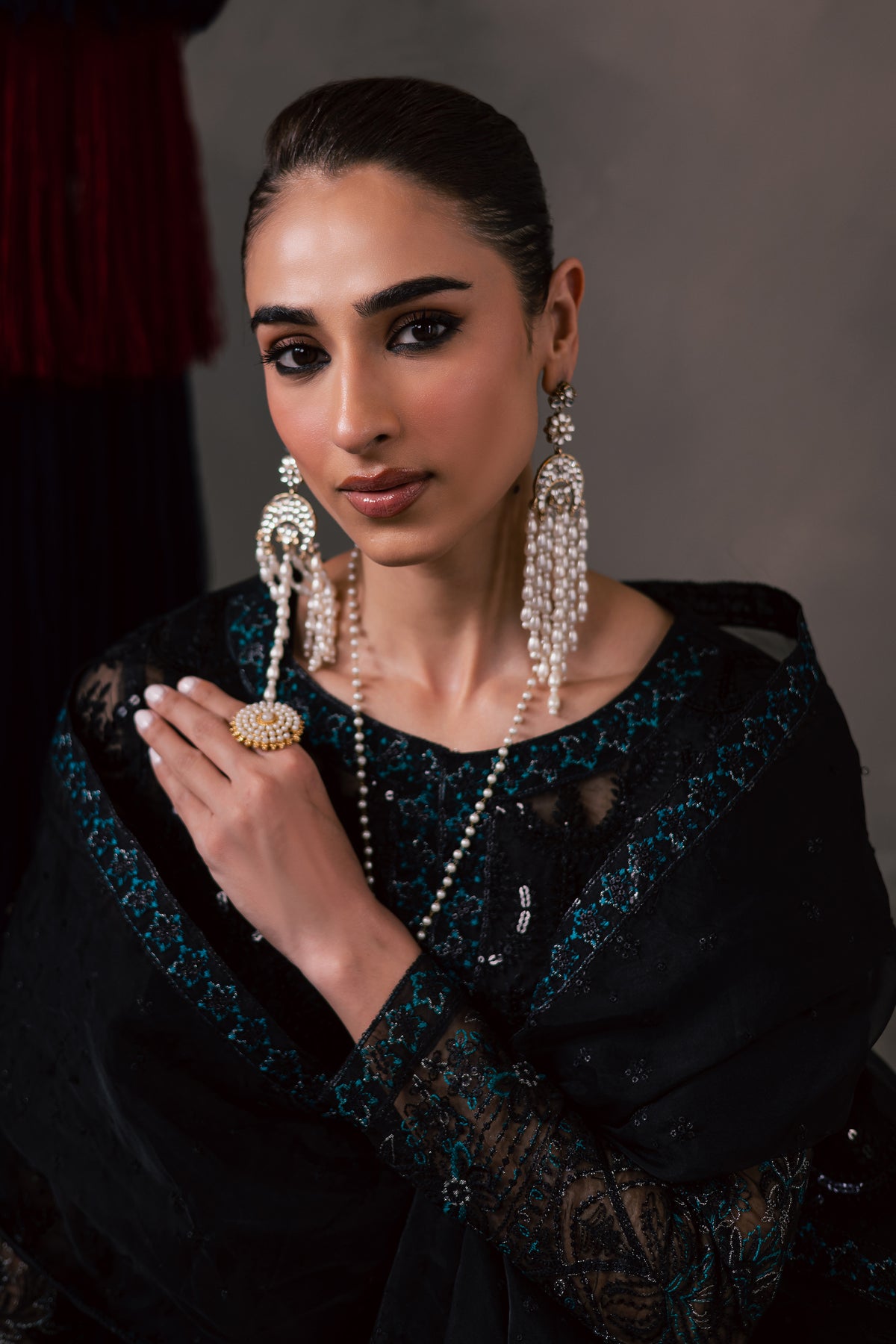This striking ensemble features a black organza front-open shirt with an inner lining, richly adorned with intricate embroidery spread across the fabric. Teal threadwork adds a beautiful contrast and depth, enhancing the elegance of the design.