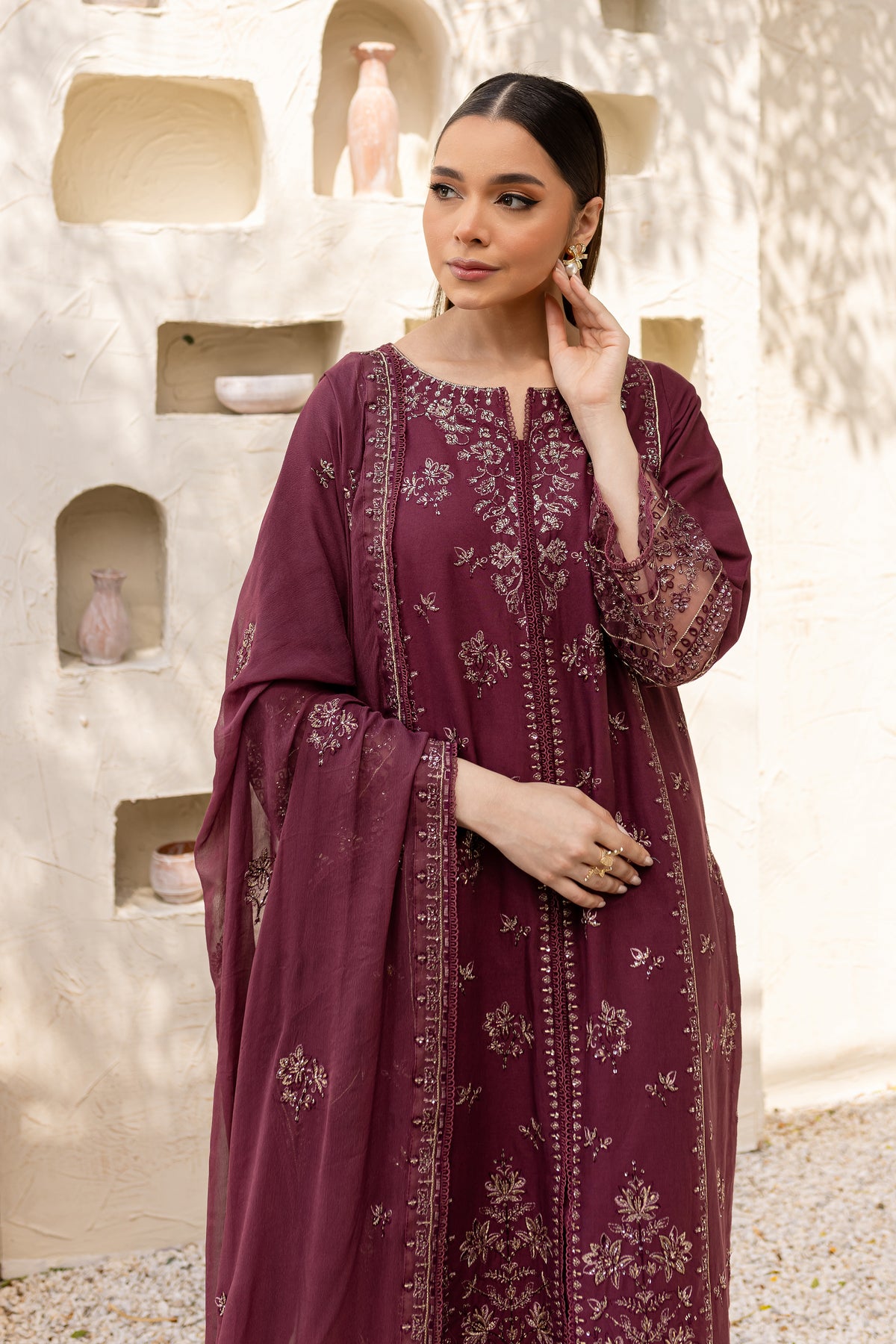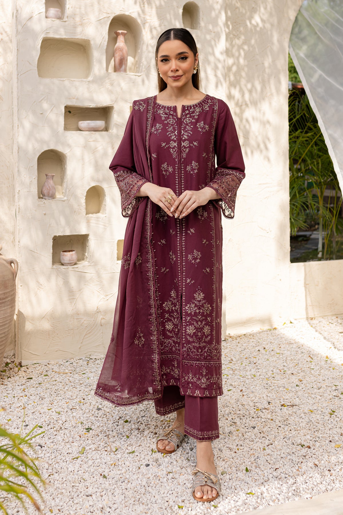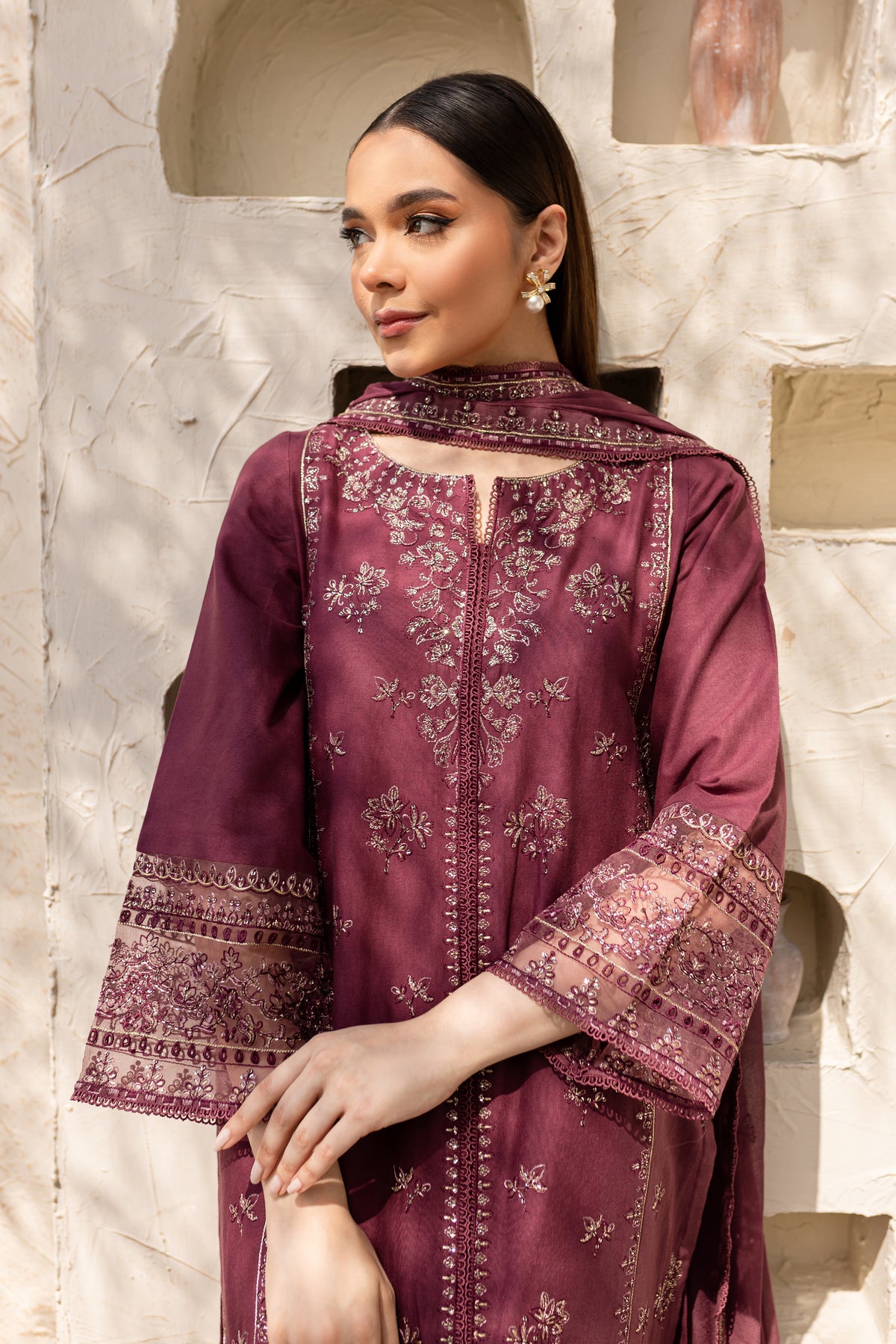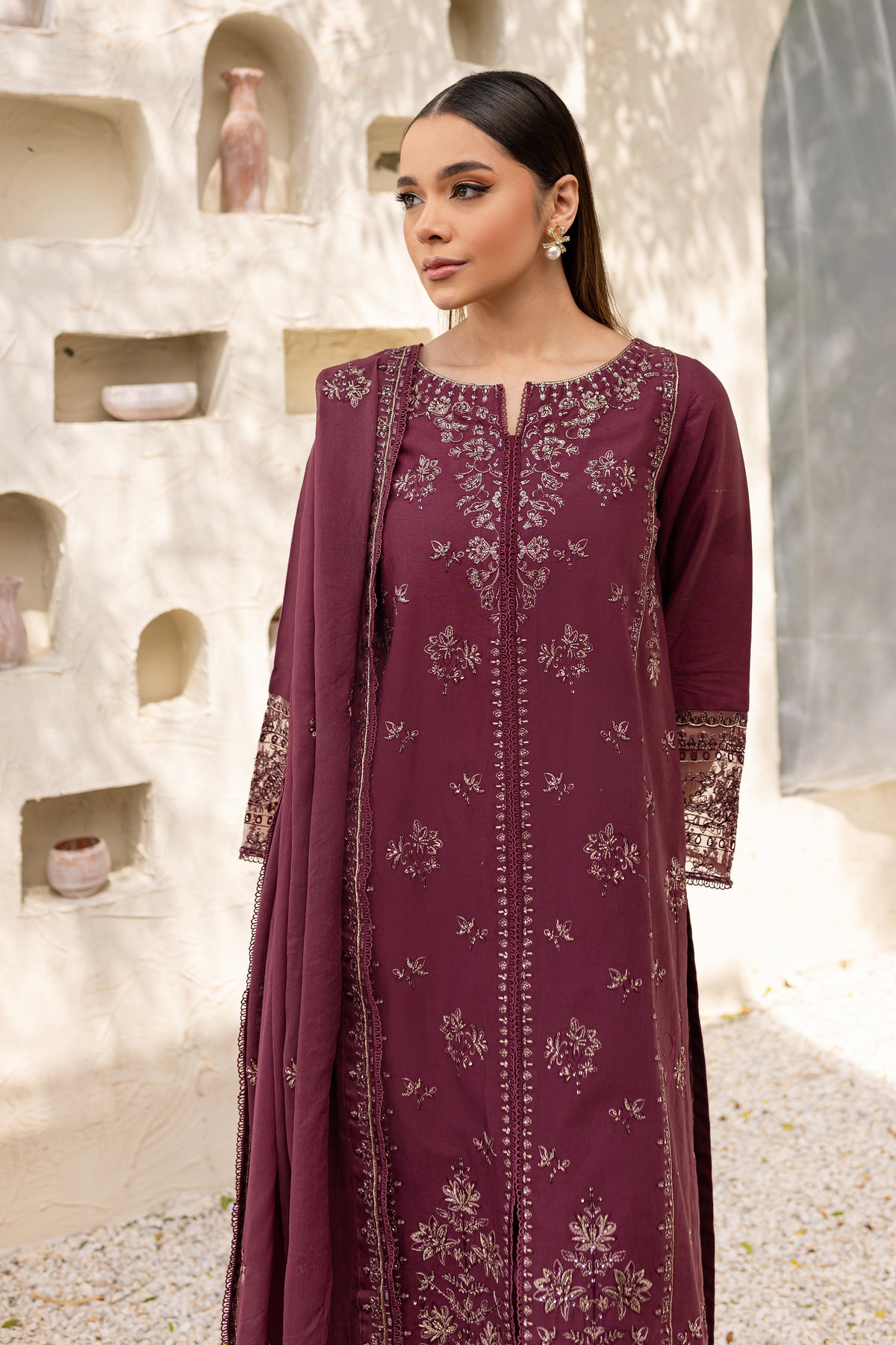 Mauve Paragon is an exquisite ensemble in mauve khaddar, comprising a long shirt with a side slit that offers a modern silhouette. The shirt is adorned with intricate embroidery, showcasing fine craftsmanship.