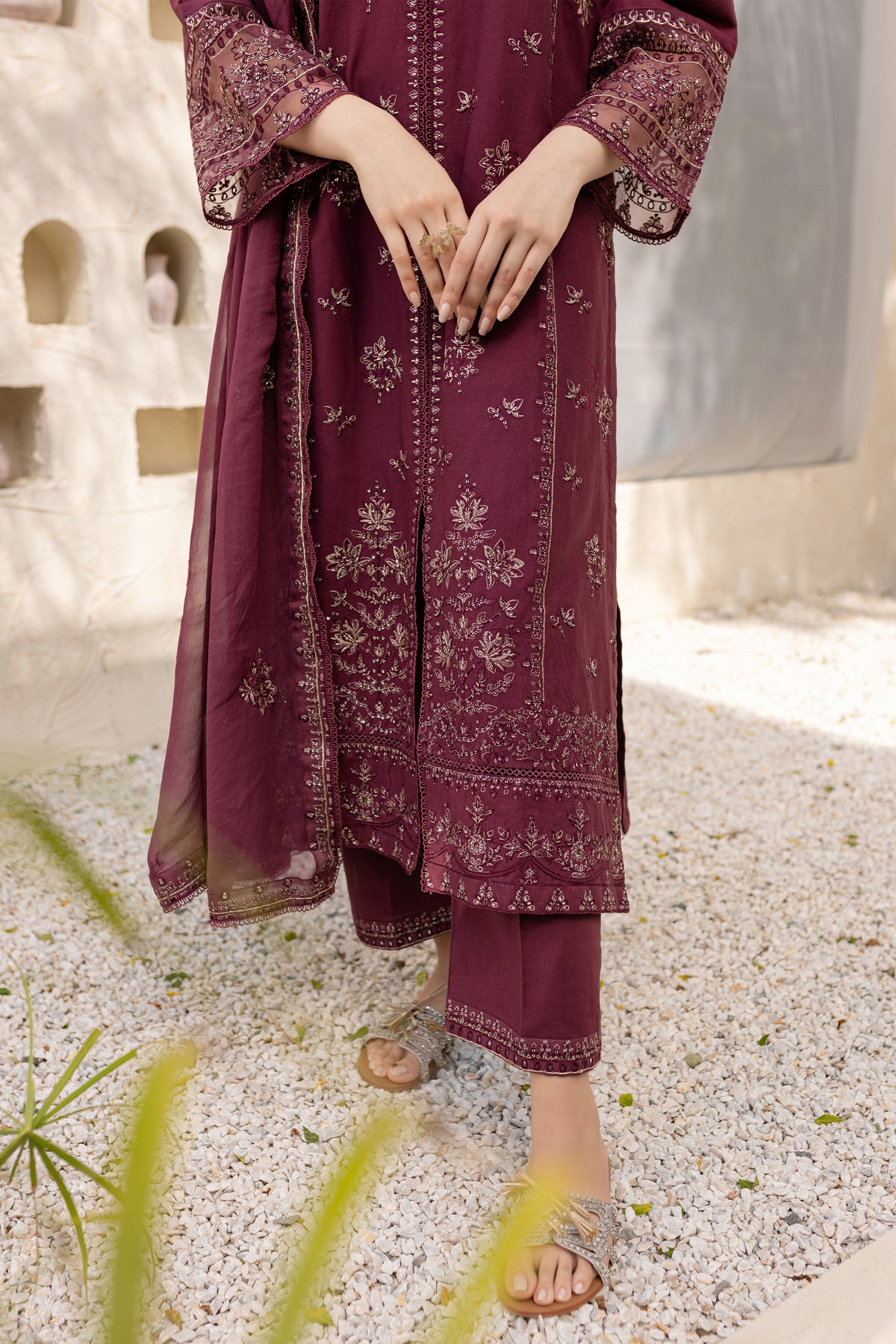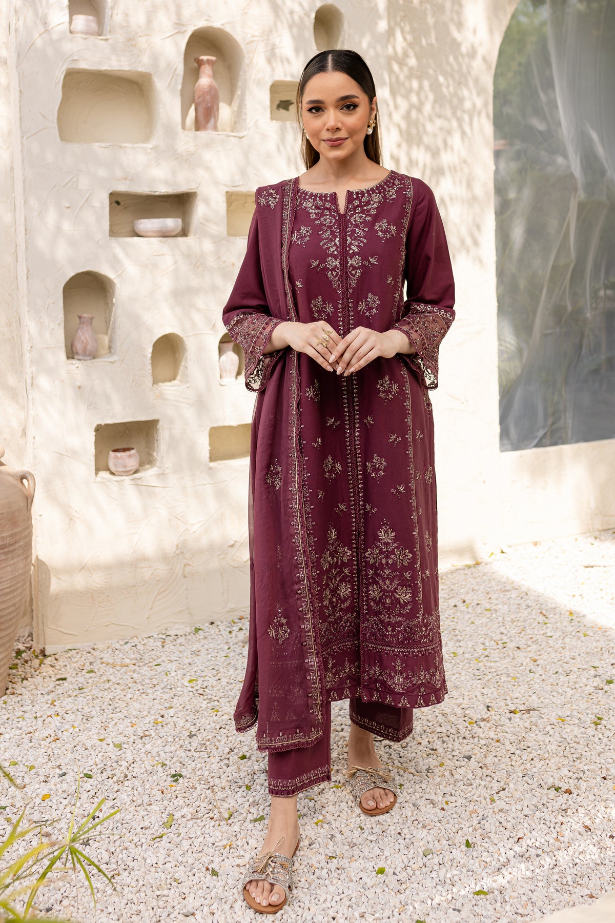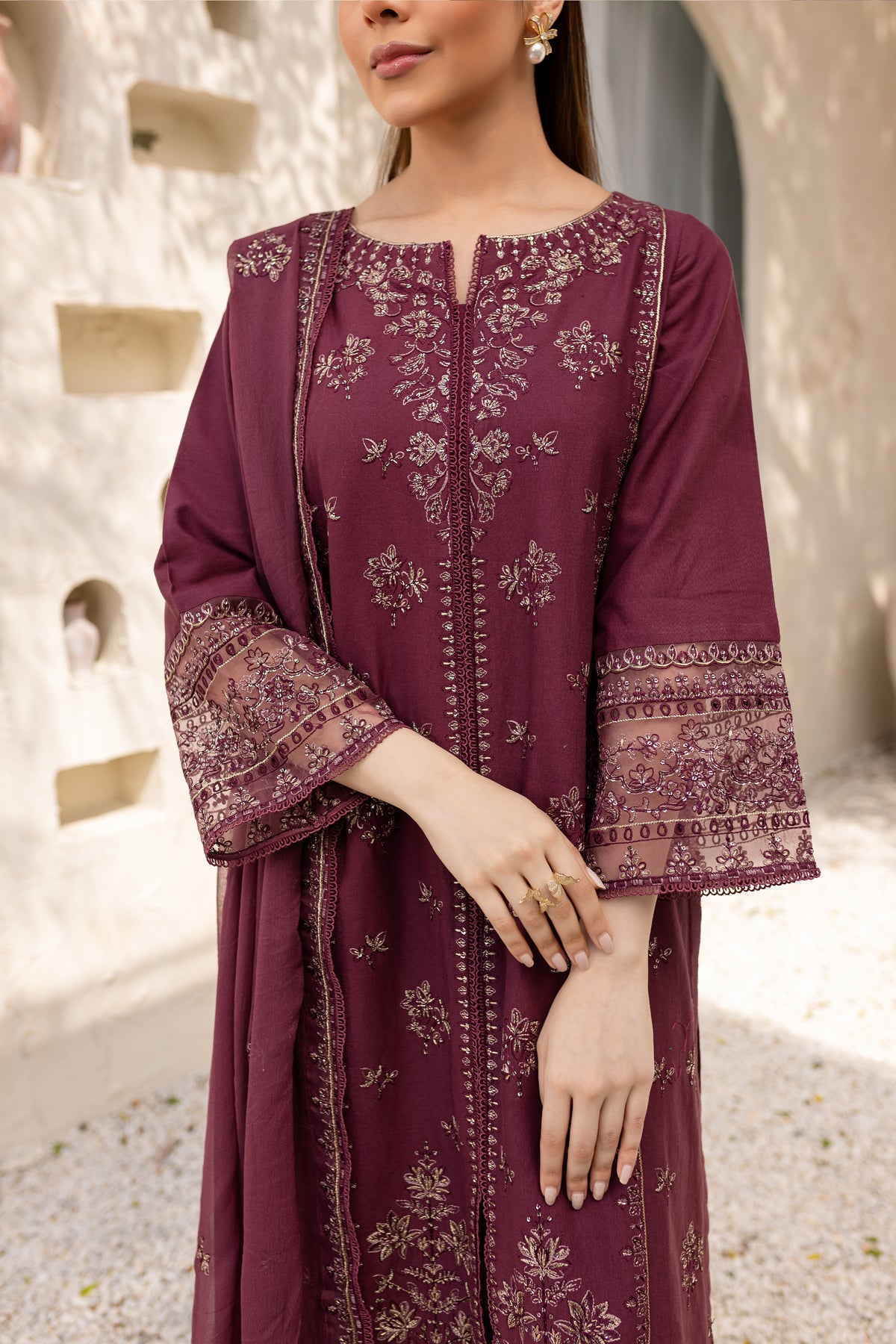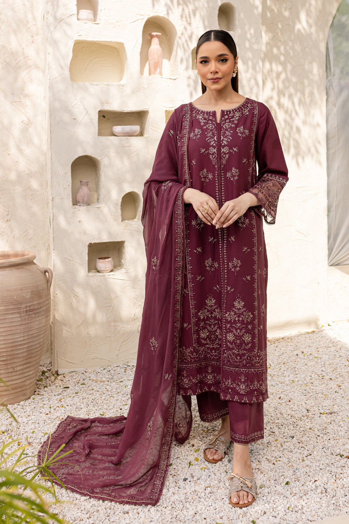 Mauve Paragon is an exquisite ensemble in mauve khaddar, comprising a long shirt with a side slit that offers a modern silhouette. The shirt is adorned with intricate embroidery, showcasing fine craftsmanship.