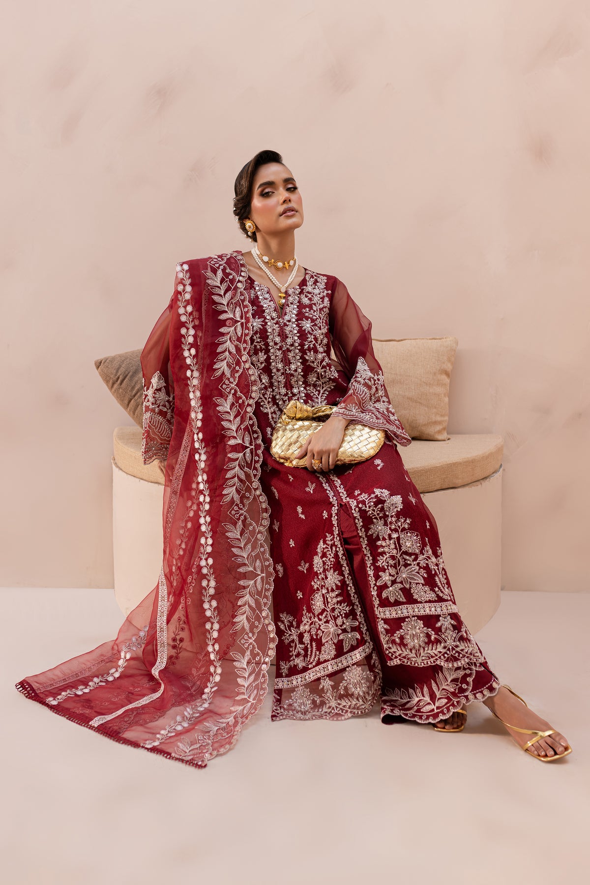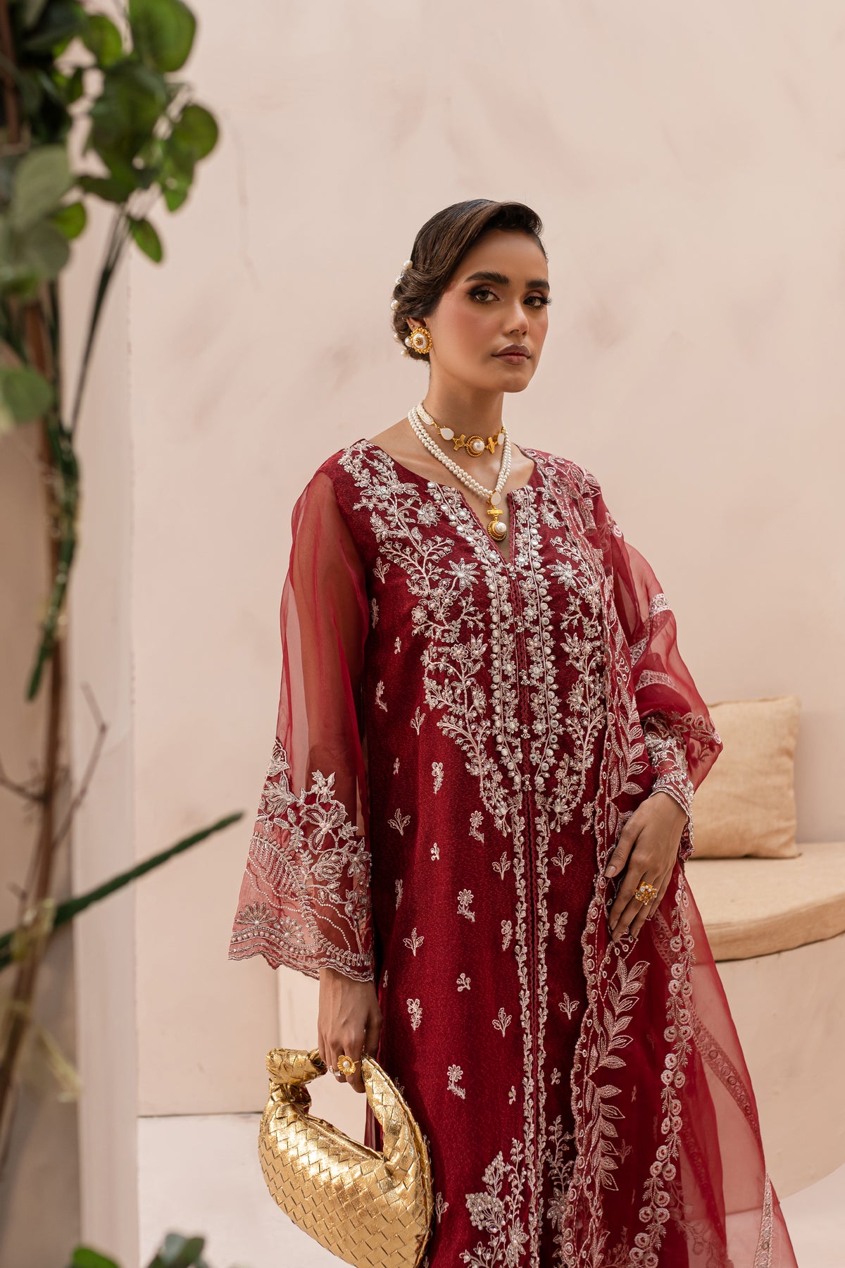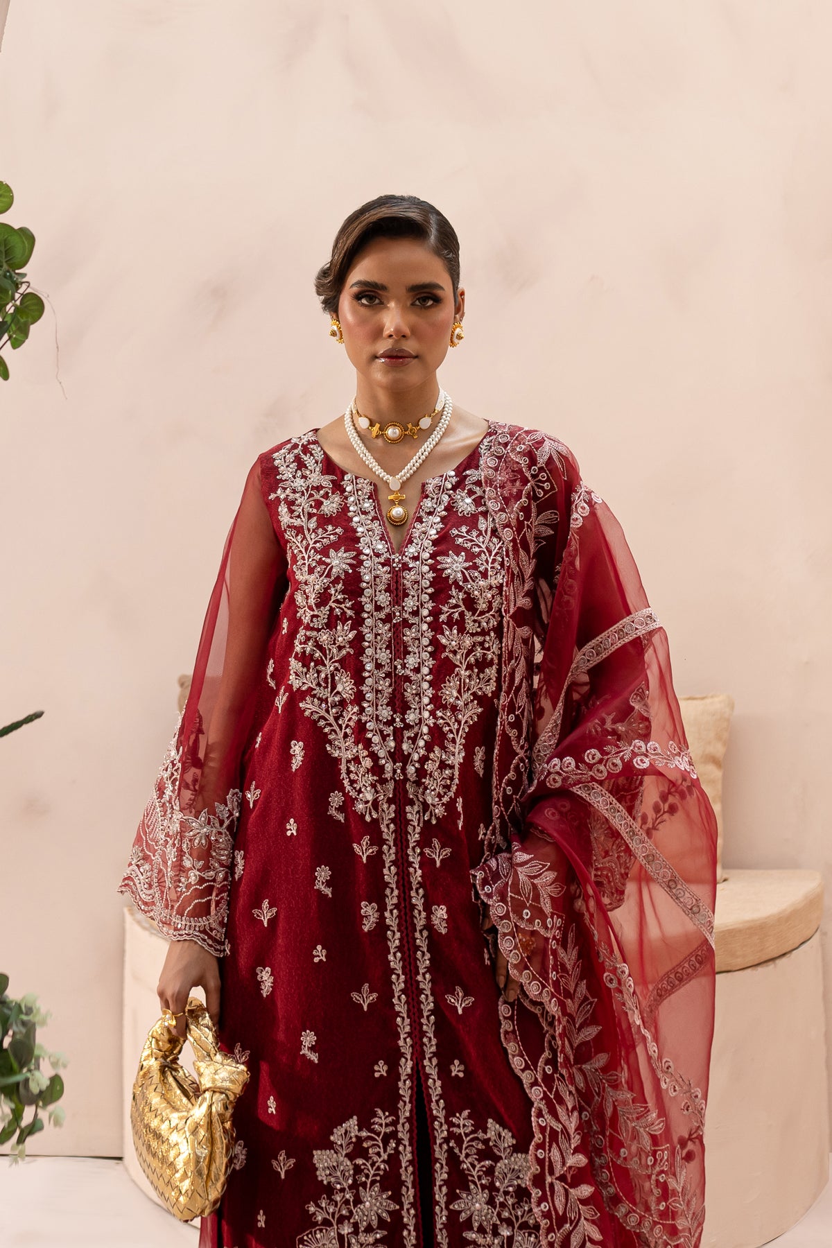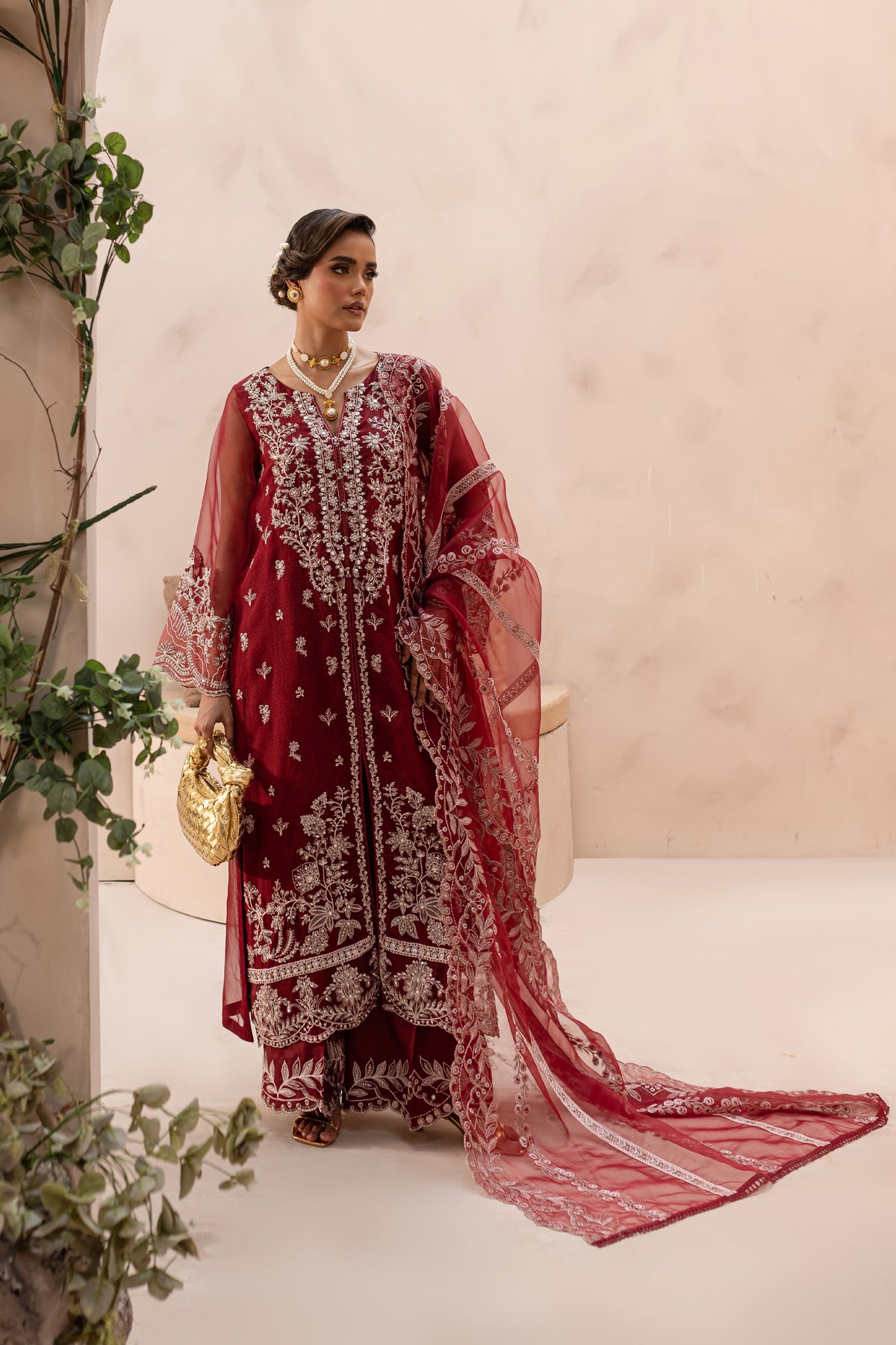The dupatta, with organza jacquard borders and a plain organza center, features detailed embroidery in the middle, rounding out this elegant look with a perfect balance of structure and flow.