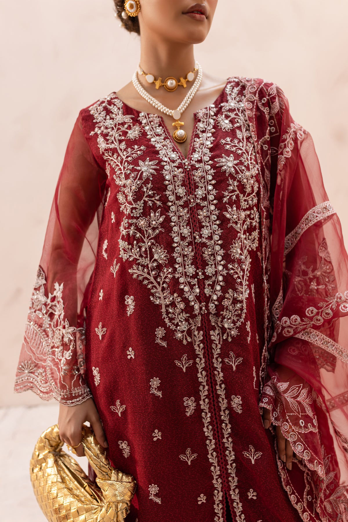 Introducing the regal maroon masterpiece - the shirt crafted from organza slub features a front-open style with intricate thread and sequin embroidery. Hand-applied embellishments of crystals, beads, kat daana, and pearls enhance the shirt’s luxurious appeal creating a stunning balance of texture and shine. The organza sleeves are equally enchanting embellished and embroidered to perfection.