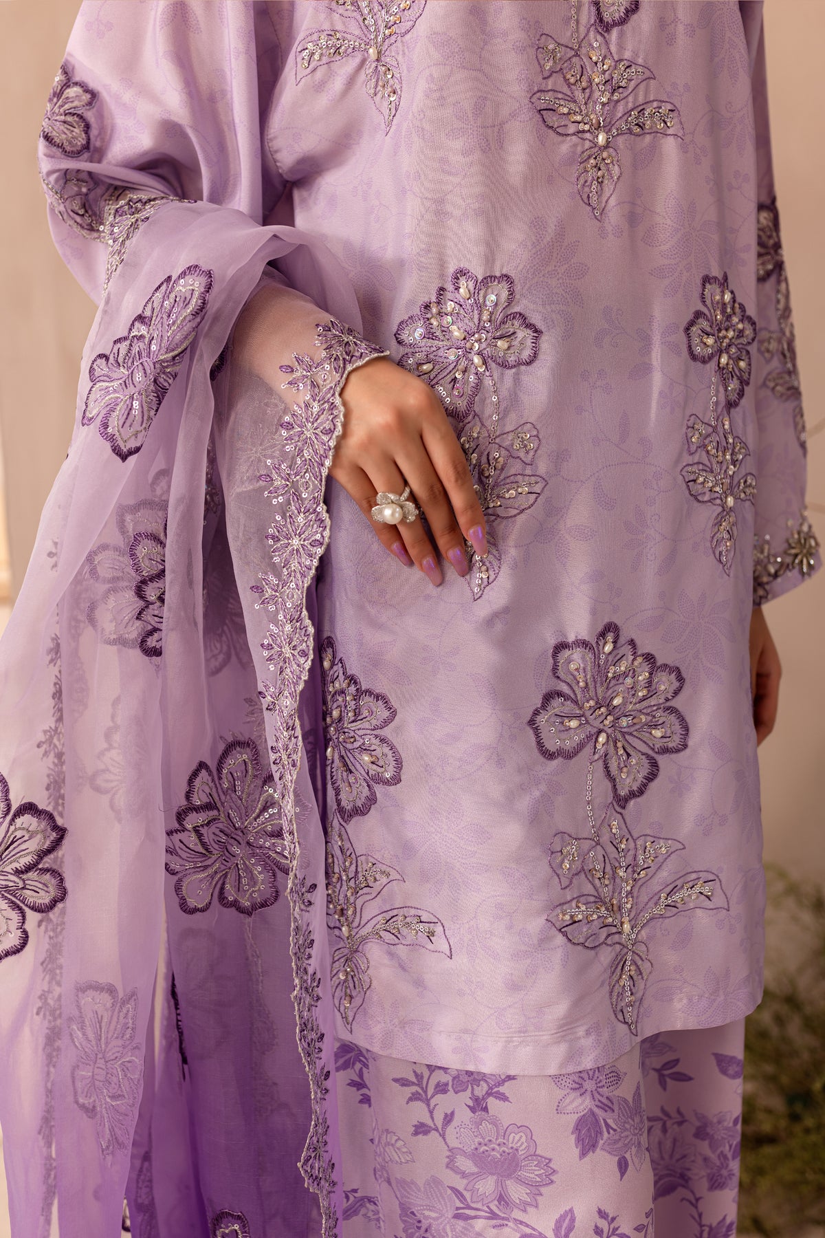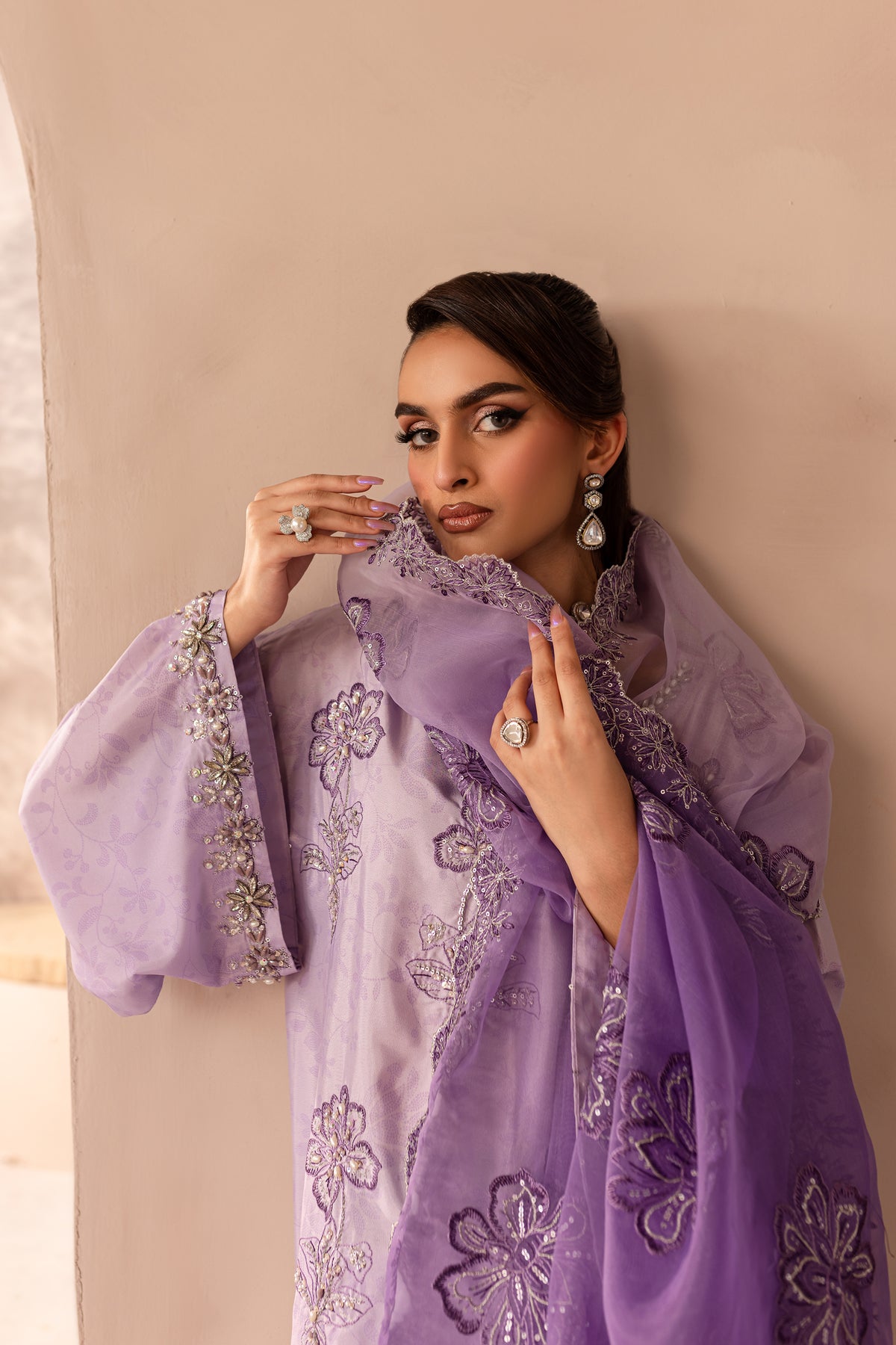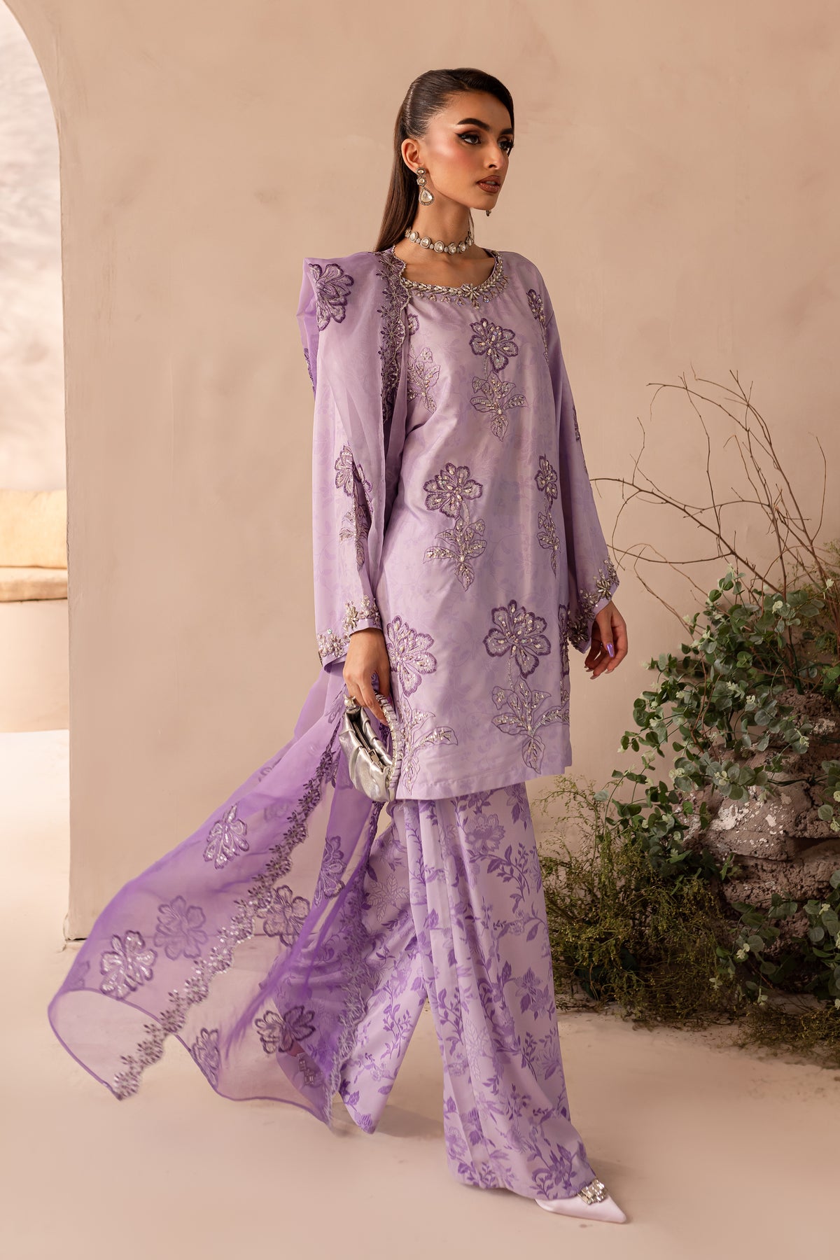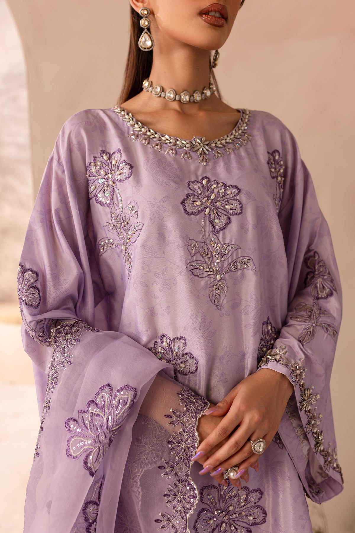 Step into the world of elegance with a stunning formal outfit in a delicate lilac hue. The shirt is crafted from glorious crepe, featuring intricate prints that lend a subtle charm. Further embellished with exquisite thread, sequins, and tilla embroidery enhanced by hand-applied details of pearls, beads, and sequins. The neckline stands out with a bold, chunky design adding an extra layer of sophistication.