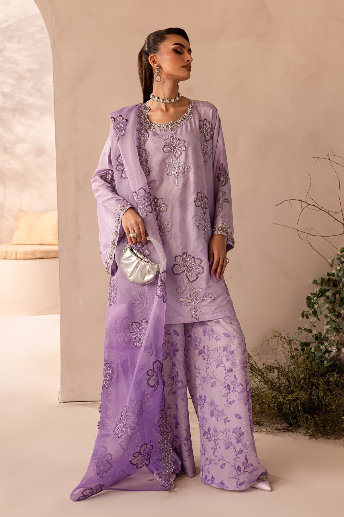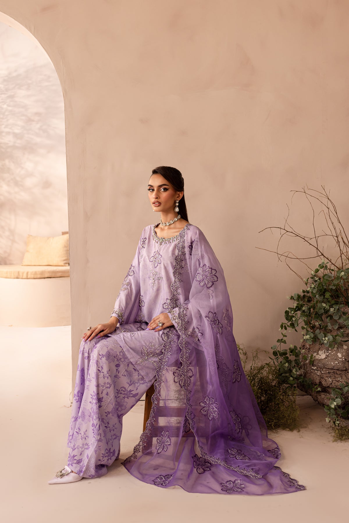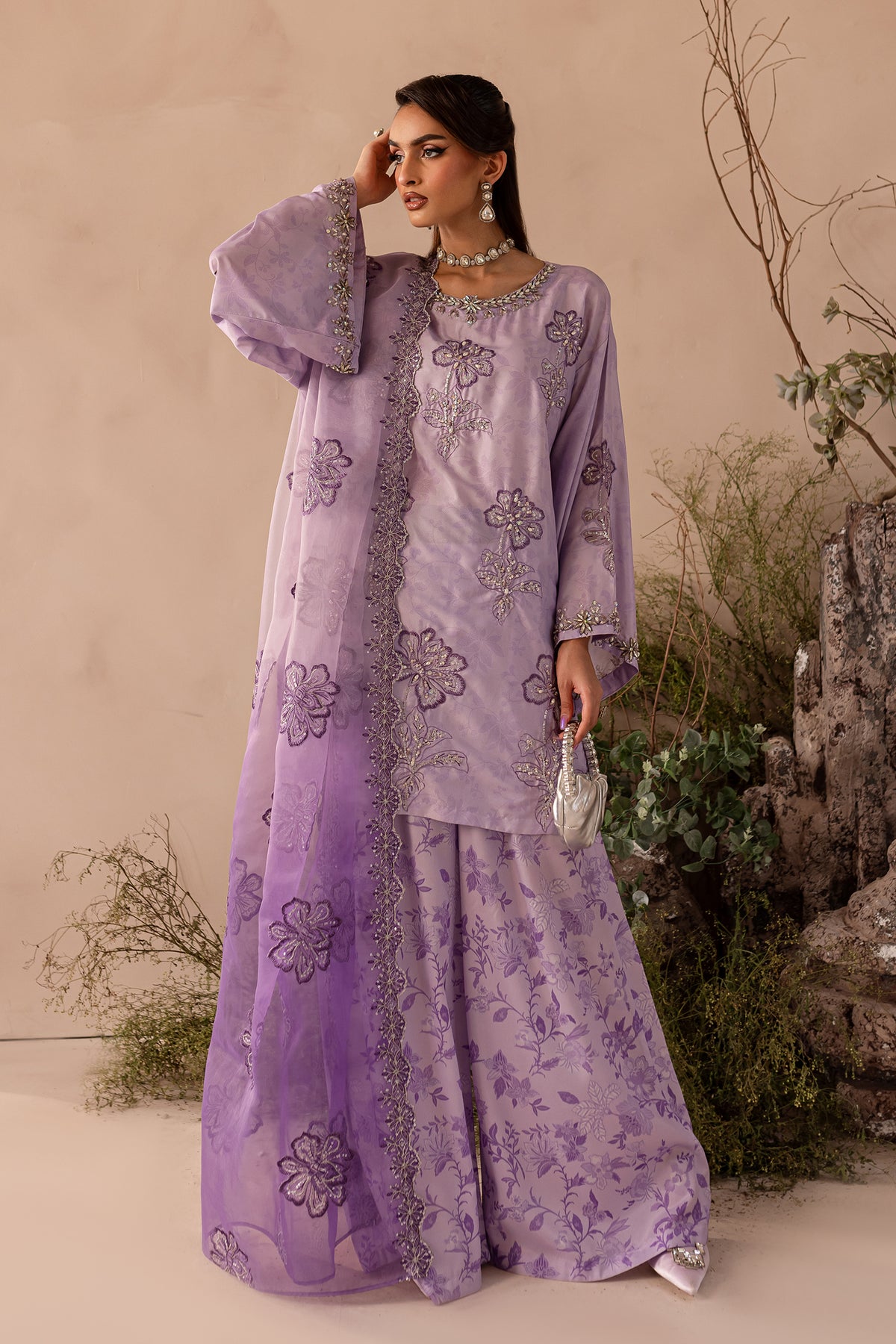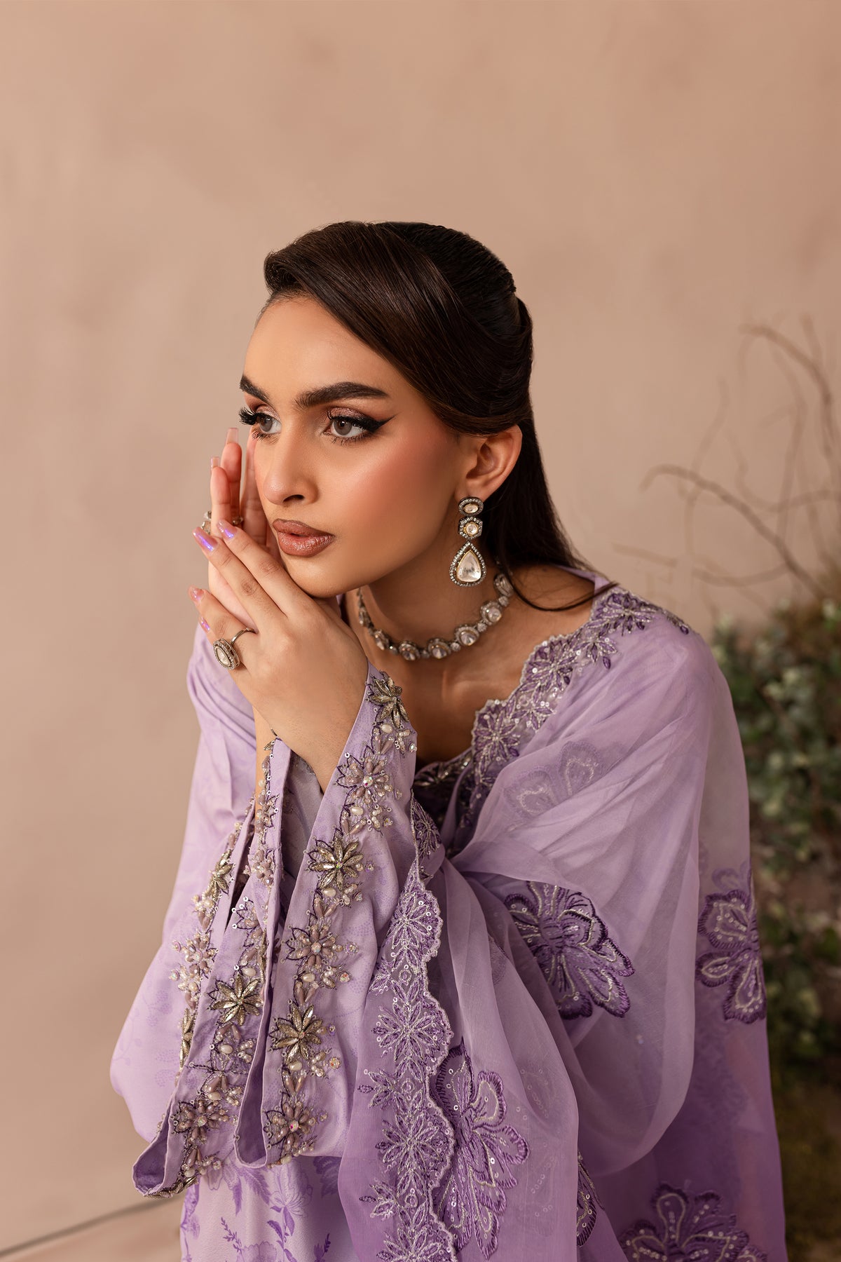 Step into the world of elegance with a stunning formal outfit in a delicate lilac hue. The shirt is crafted from glorious crepe, featuring intricate prints that lend a subtle charm. Further embellished with exquisite thread, sequins, and tilla embroidery enhanced by hand-applied details of pearls, beads, and sequins. The neckline stands out with a bold, chunky design adding an extra layer of sophistication.