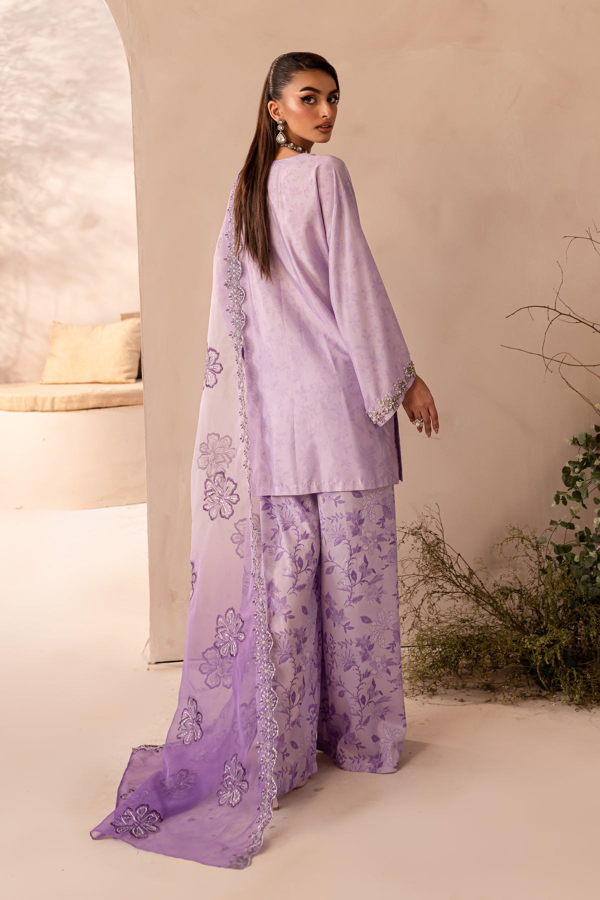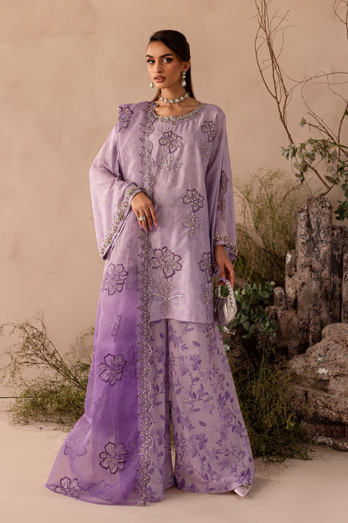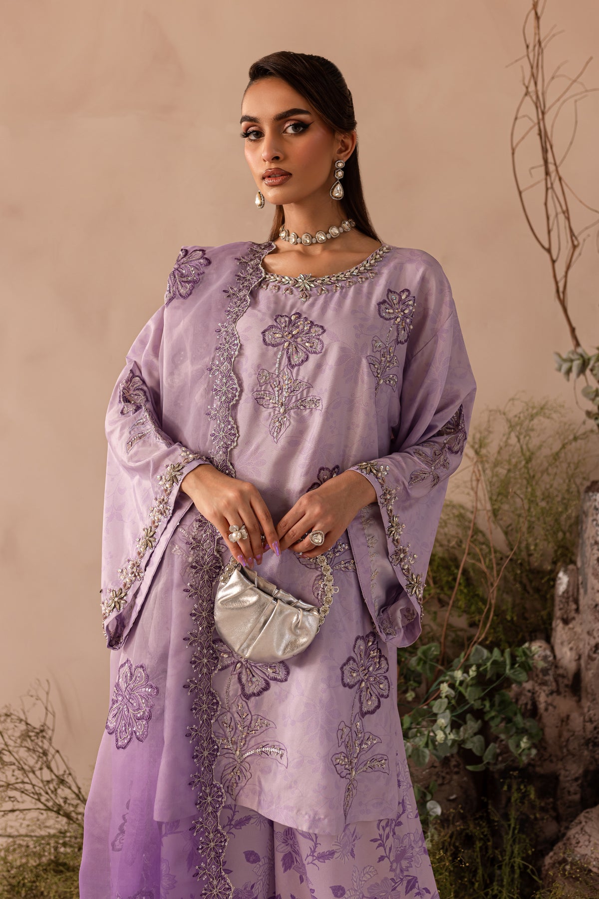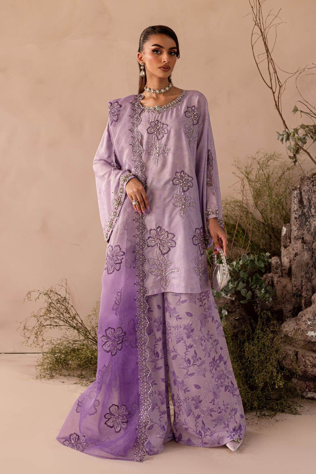 Step into the world of elegance with a stunning formal outfit in a delicate lilac hue. The shirt is crafted from glorious crepe, featuring intricate prints that lend a subtle charm. Further embellished with exquisite thread, sequins, and tilla embroidery enhanced by hand-applied details of pearls, beads, and sequins. The neckline stands out with a bold, chunky design adding an extra layer of sophistication.