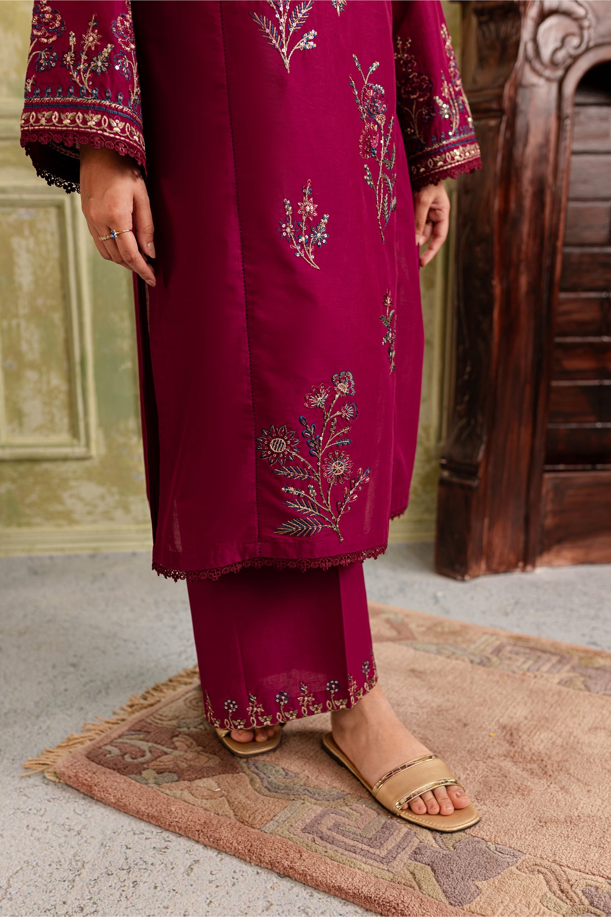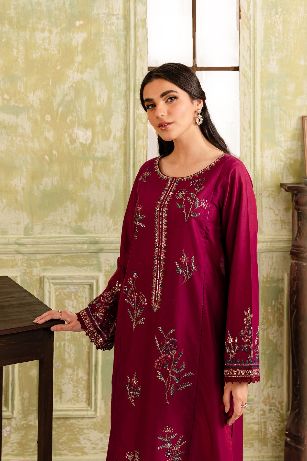 This summer season, create an iconic look with our finest quality Pima lawn in the shades of burgundy. Exquisitely designed paneled shirt features intricate embroidery at neckline enhanced with composed embroidery on center panel. Noteworthy details include embroidery at sleeves and lace finish at shirt hem and sleeves.