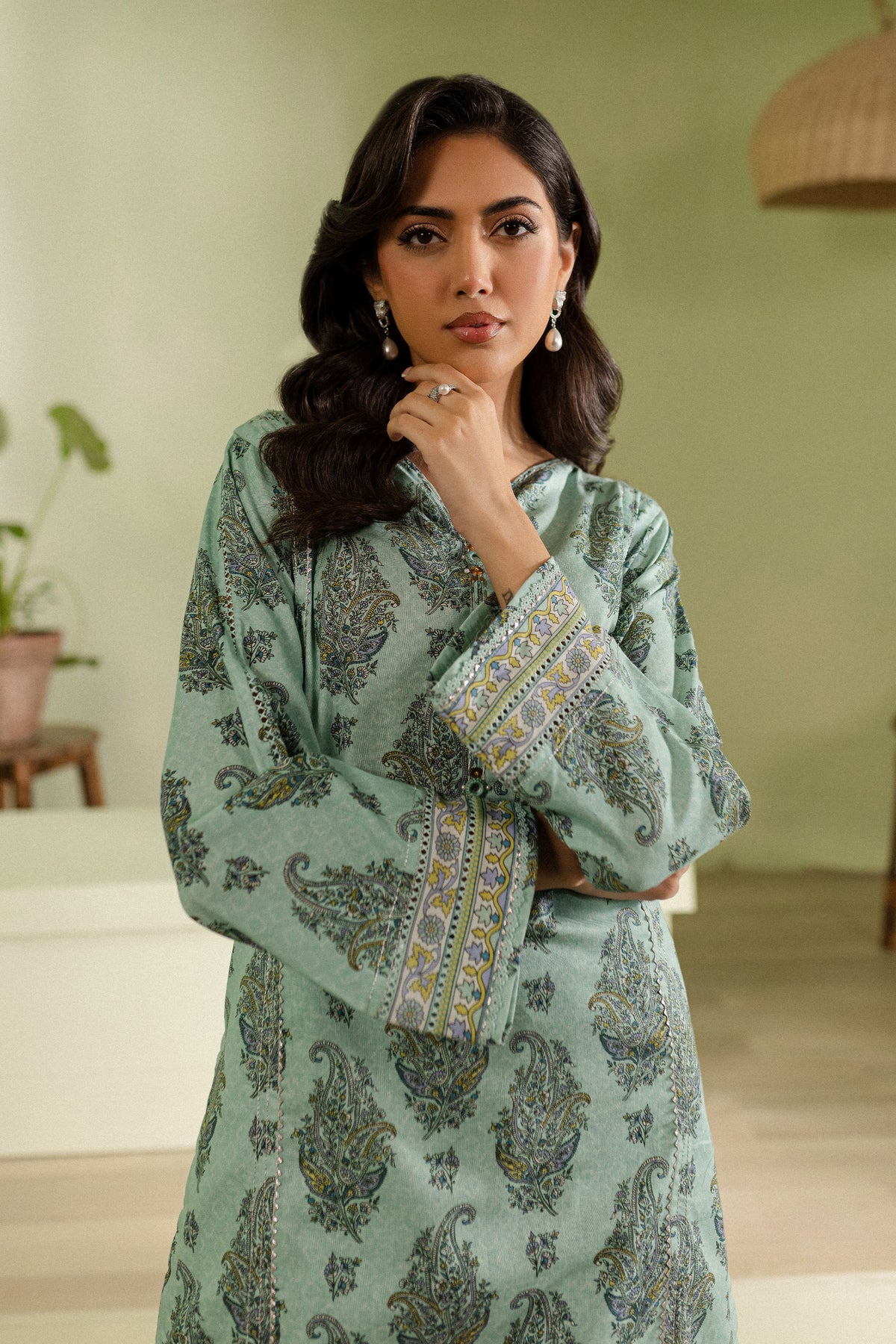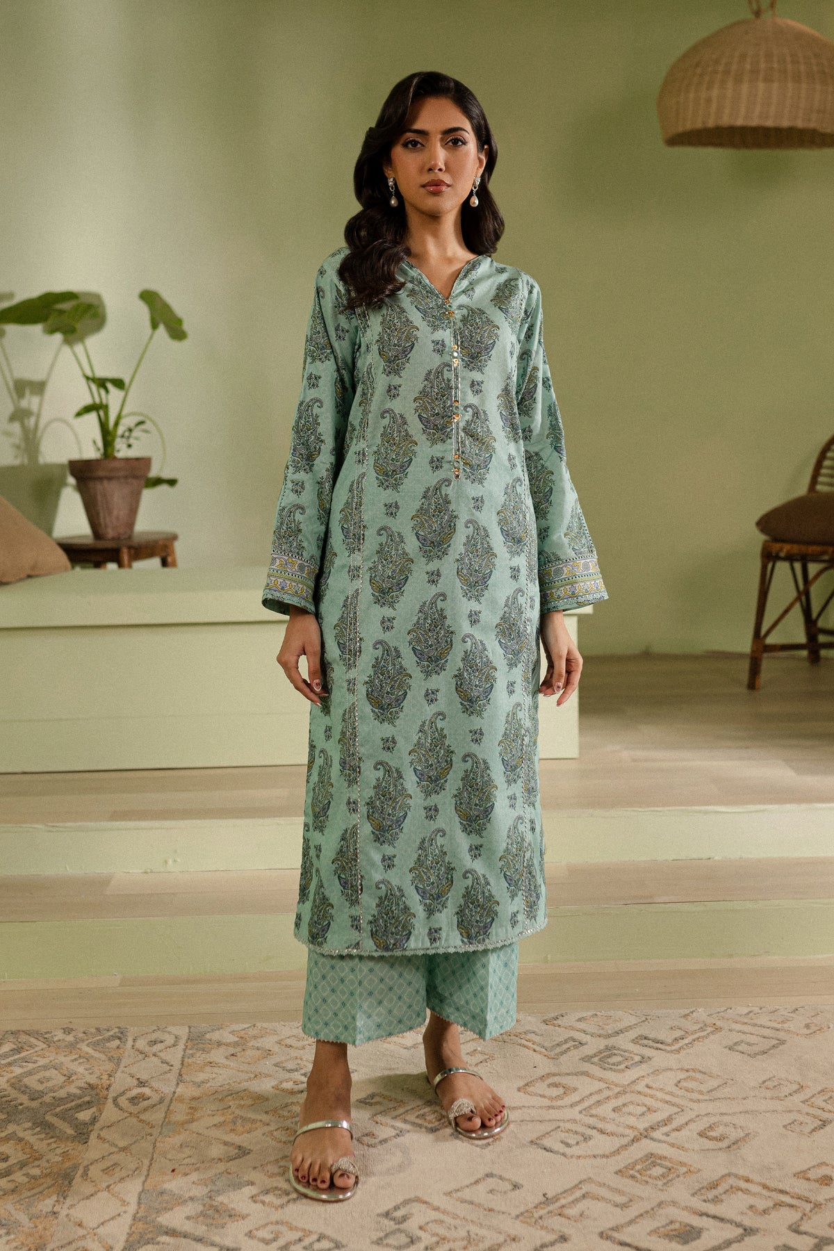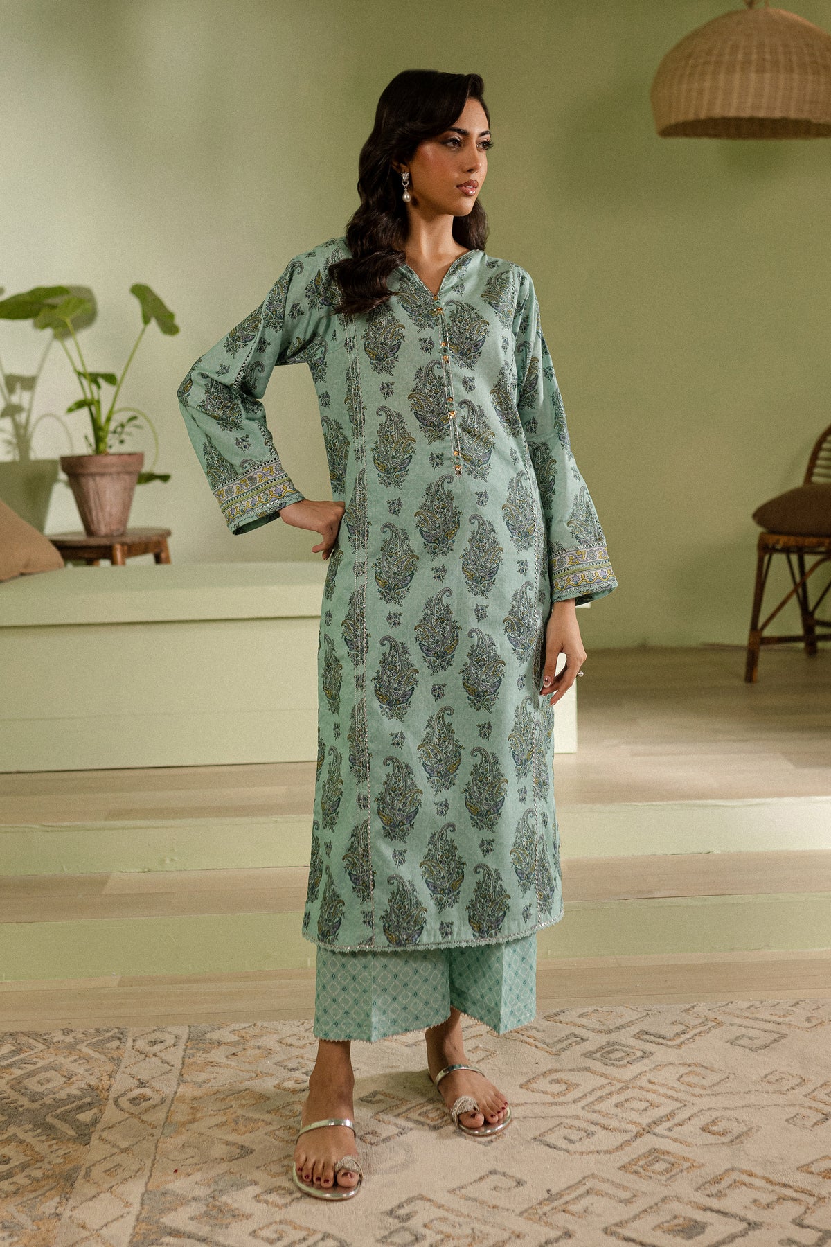 Made from premium khaddar, this sky blue two-piece set features intricate details and exquisite craftsmanship. The paneled shirt is adorned with tilla stitches and samosa lace at the panel joins, while the neckline is highlighted with tilla embellishments and a fancy collage. Double lace finishing and printed borders joined with seerhi lace add further depth.