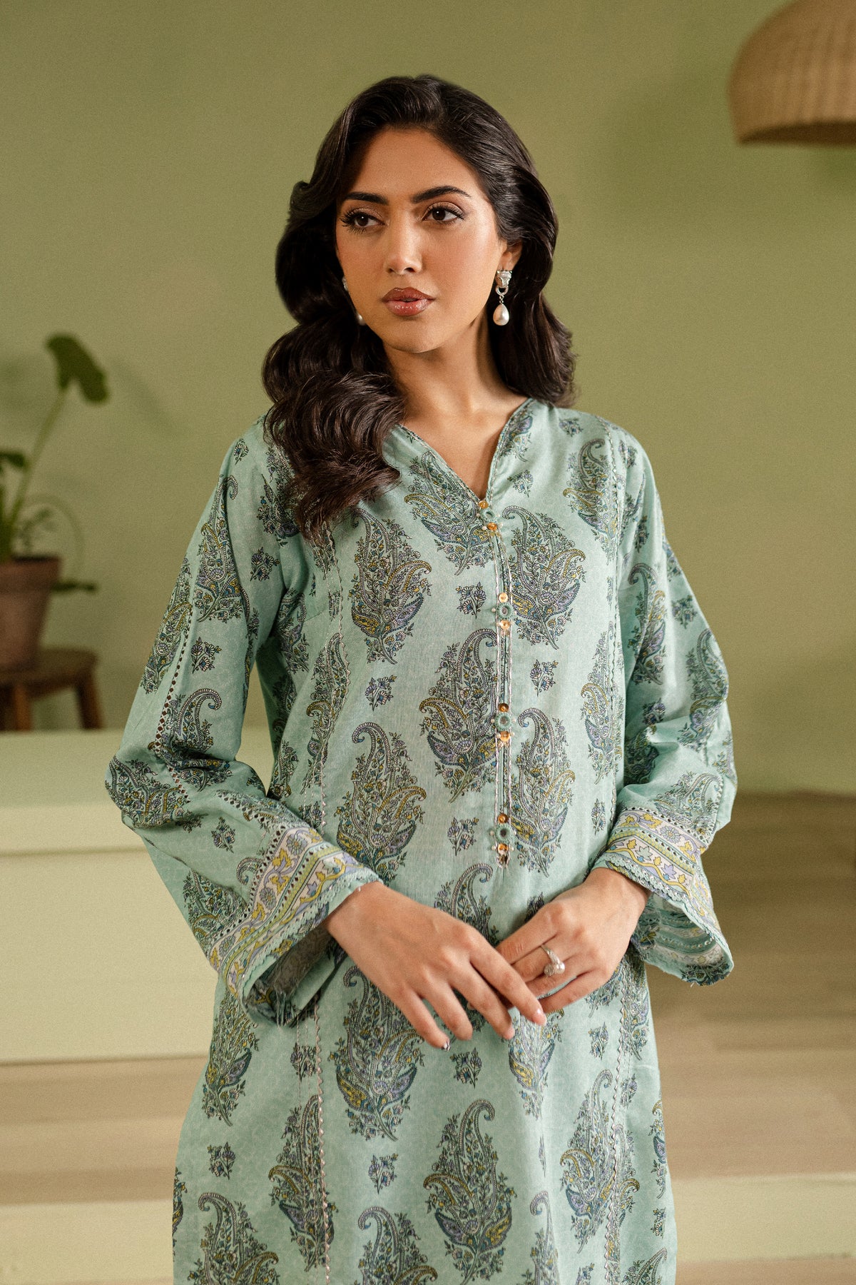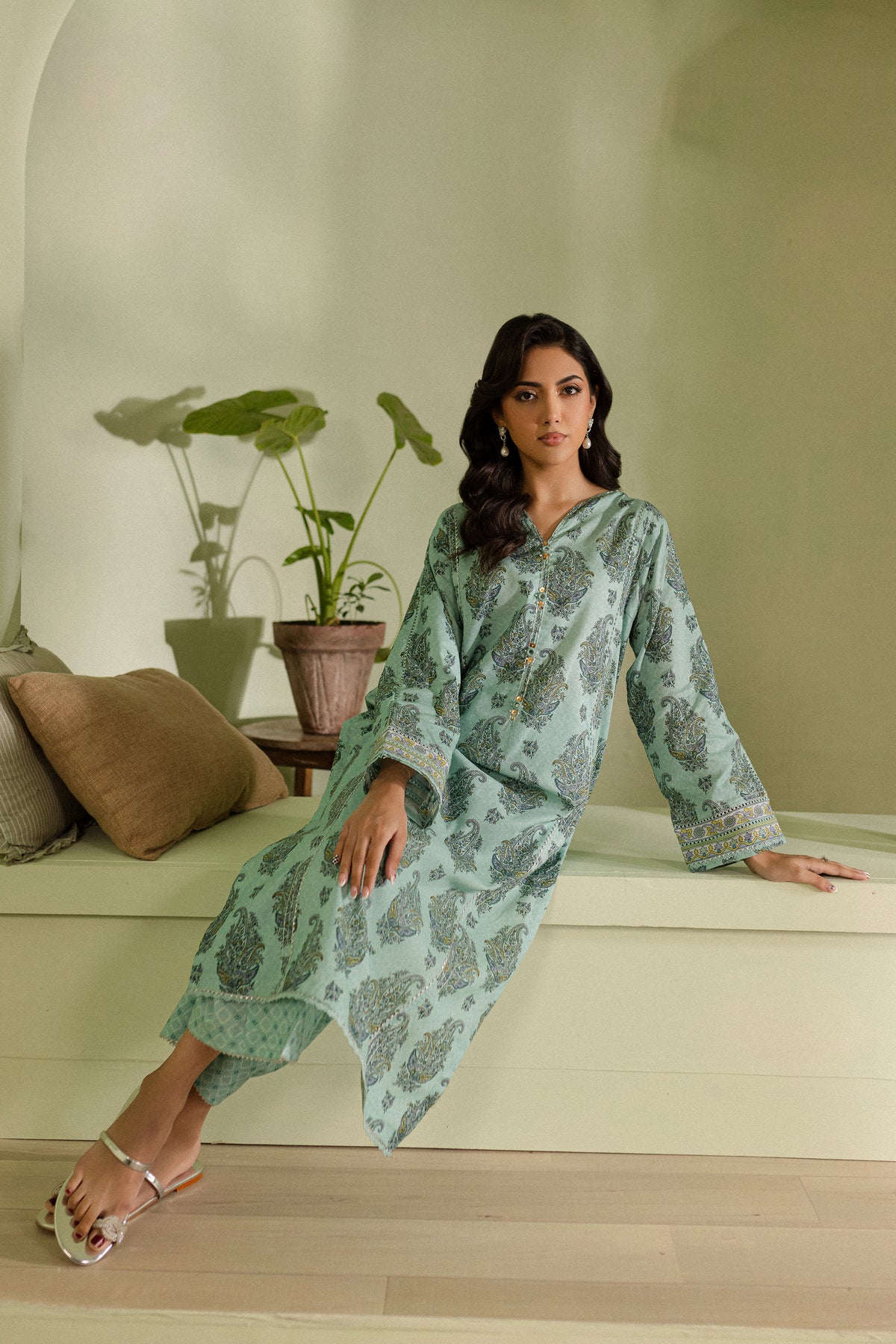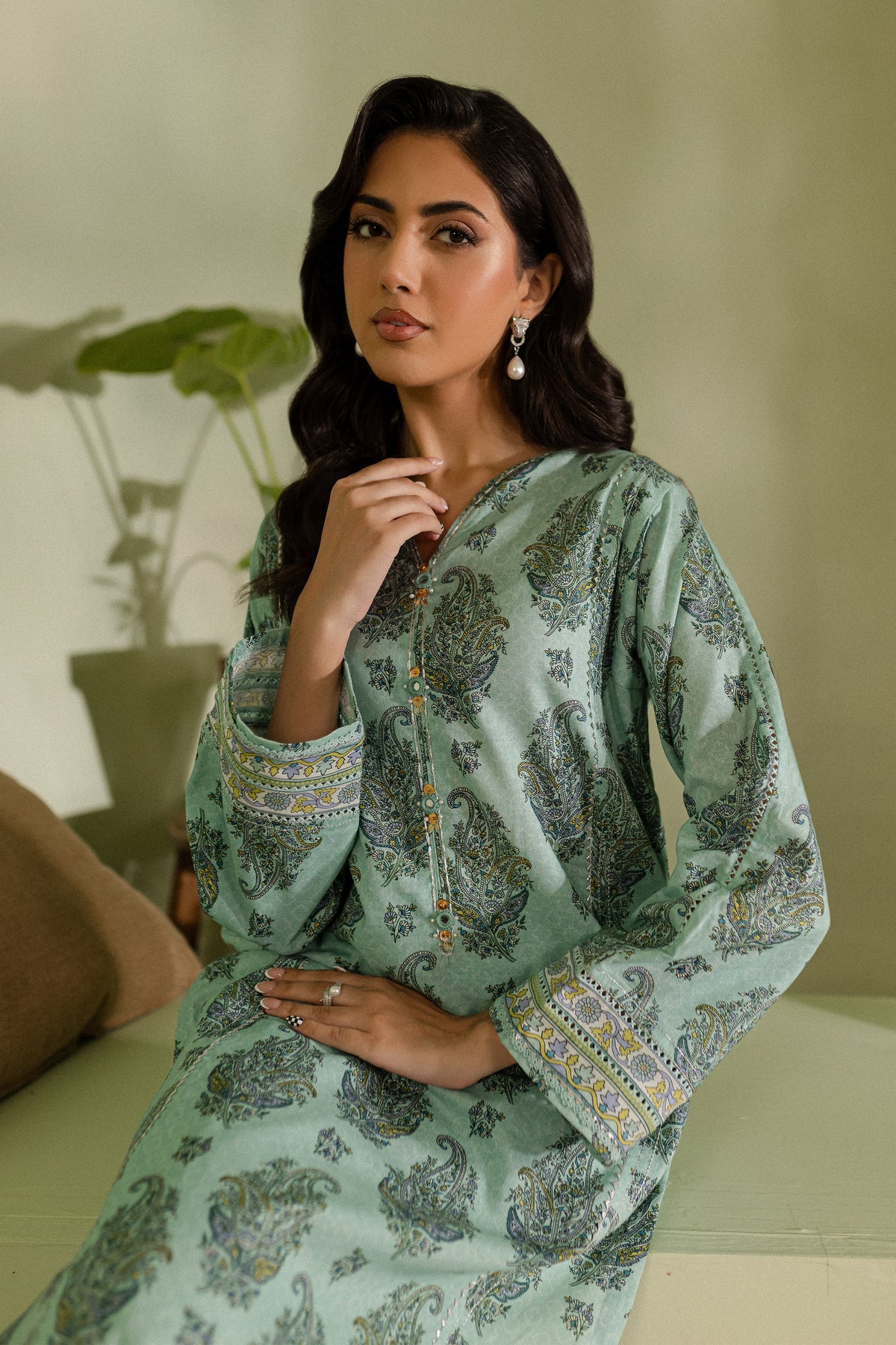 Made from premium khaddar, this sky blue two-piece set features intricate details and exquisite craftsmanship. The paneled shirt is adorned with tilla stitches and samosa lace at the panel joins, while the neckline is highlighted with tilla embellishments and a fancy collage. Double lace finishing and printed borders joined with seerhi lace add further depth.