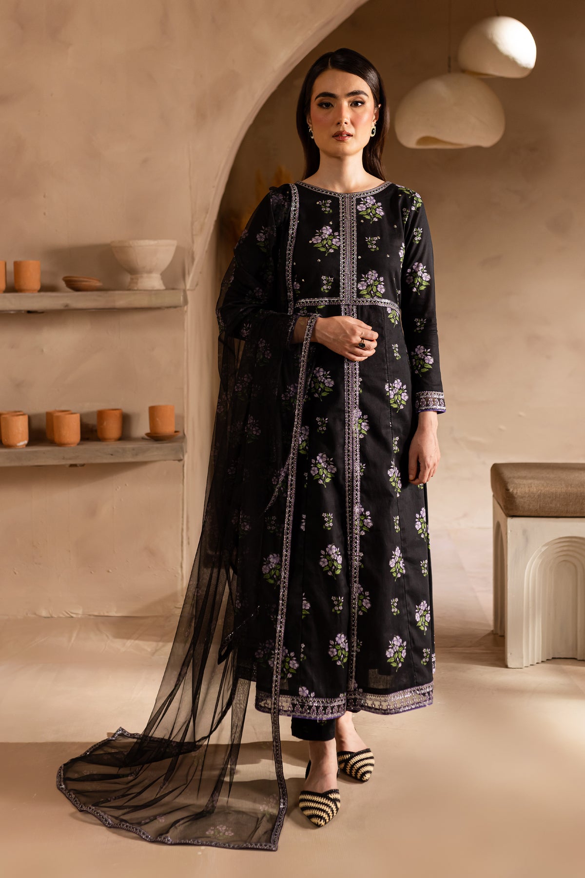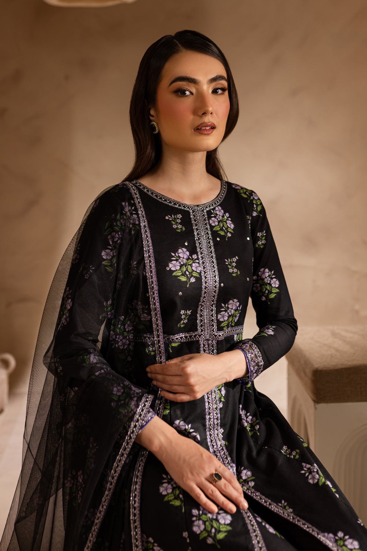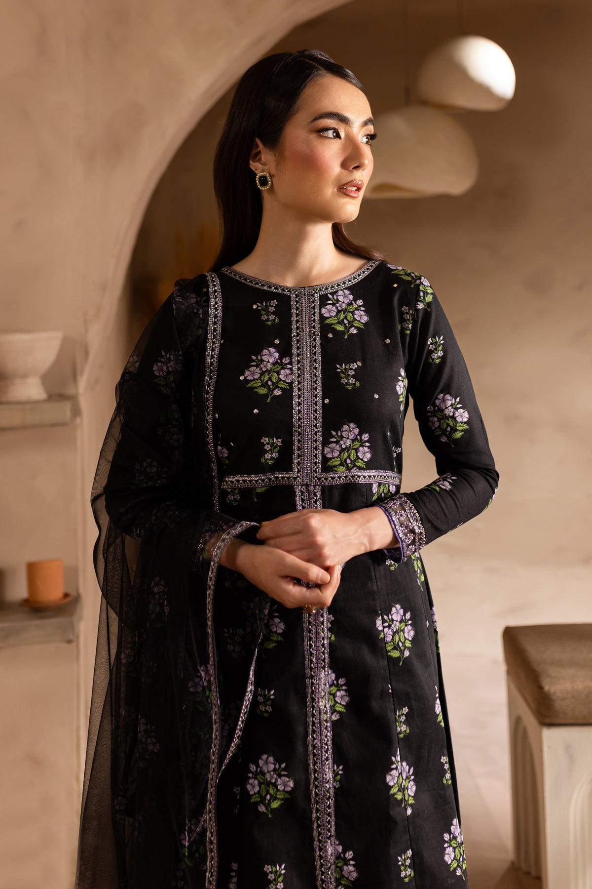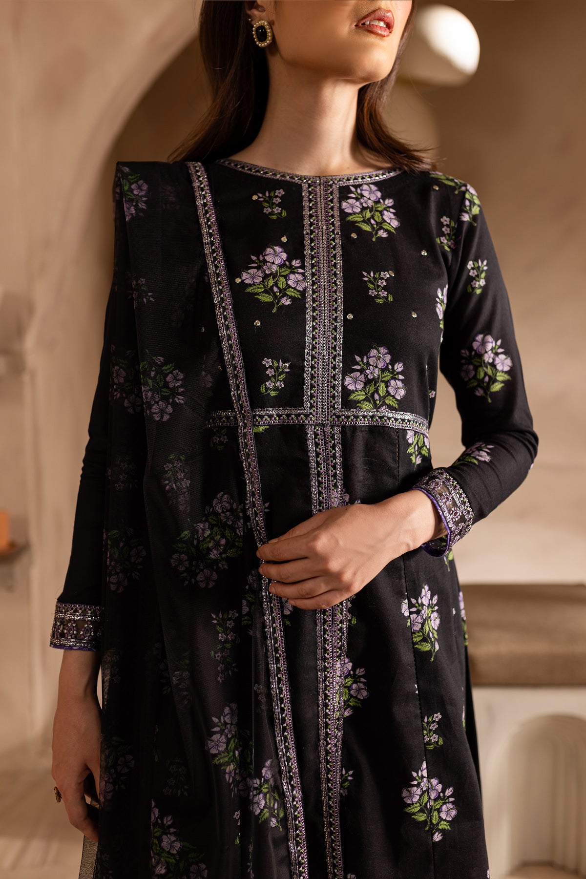 The classic black ensemble in the most comfortable khaddar fabric is a must-have for this winter season. Beautifully printed outfit features a long length paneled frock with a slit down in the middle, enhanced with organza embroidered borders and mukesh spread on the yoke.