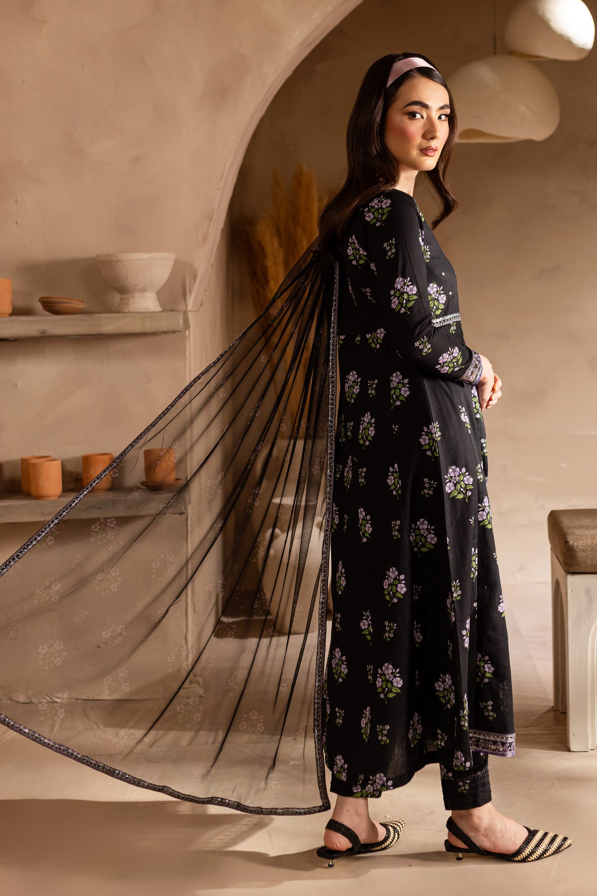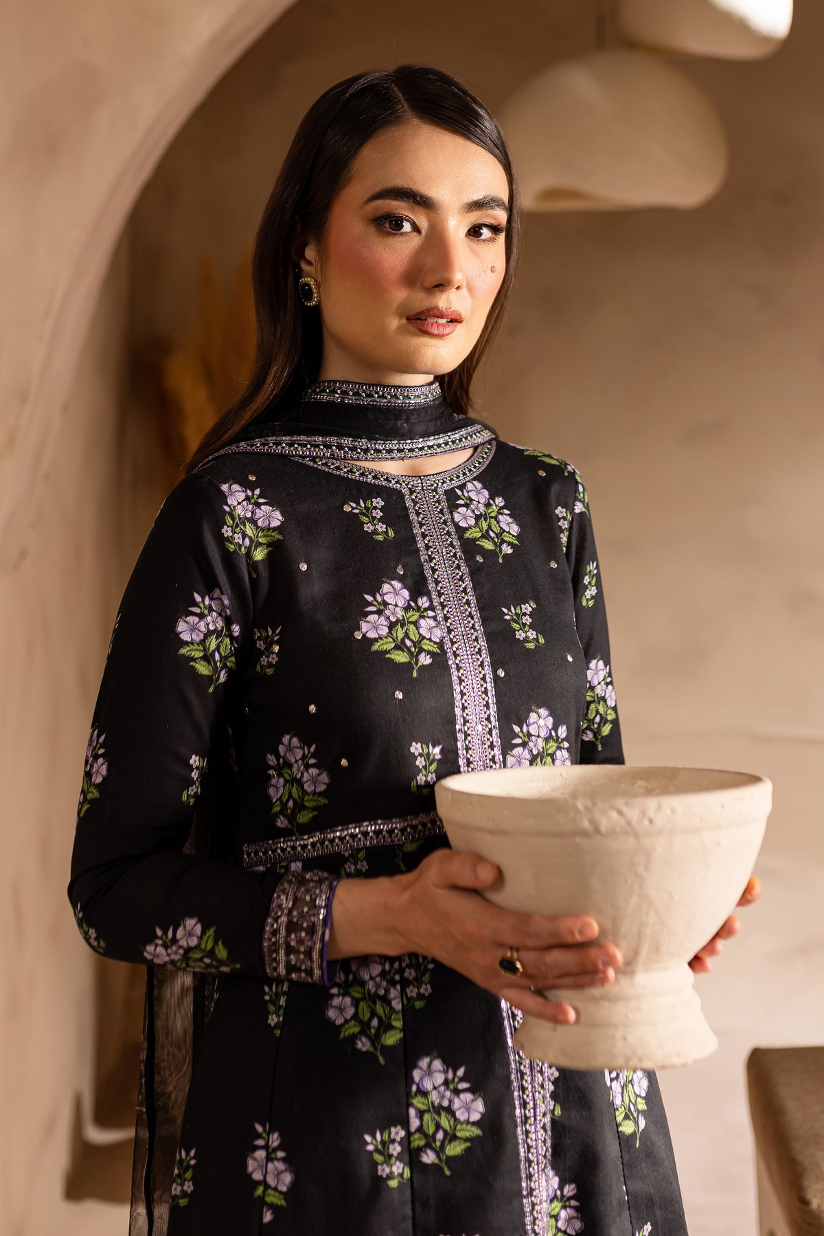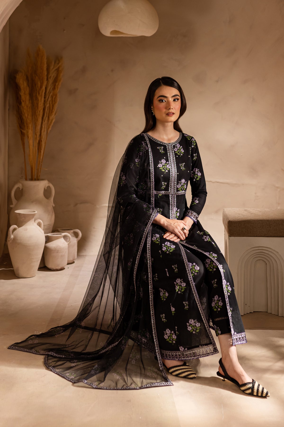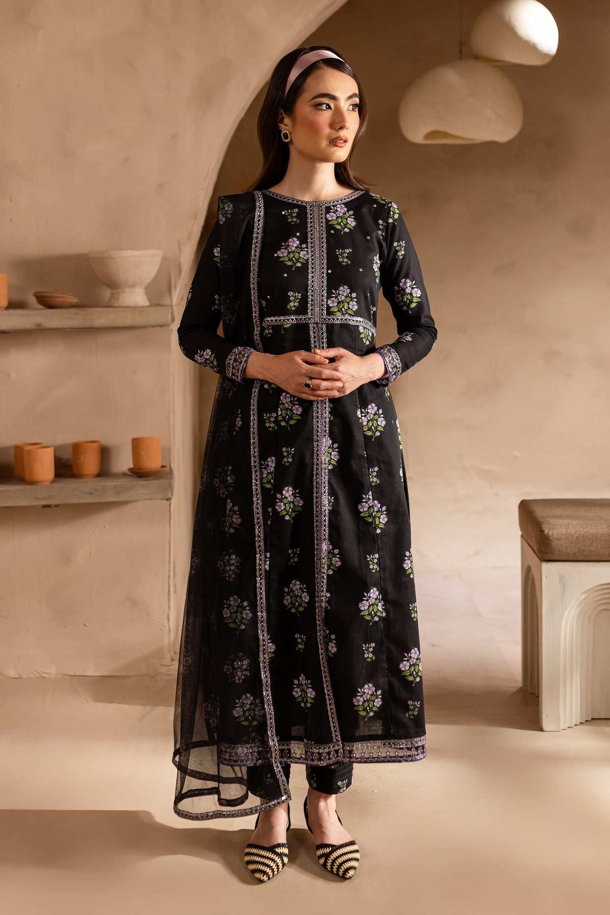 The classic black ensemble in the most comfortable khaddar fabric is a must-have for this winter season. Beautifully printed outfit features a long length paneled frock with a slit down in the middle, enhanced with organza embroidered borders and mukesh spread on the yoke.