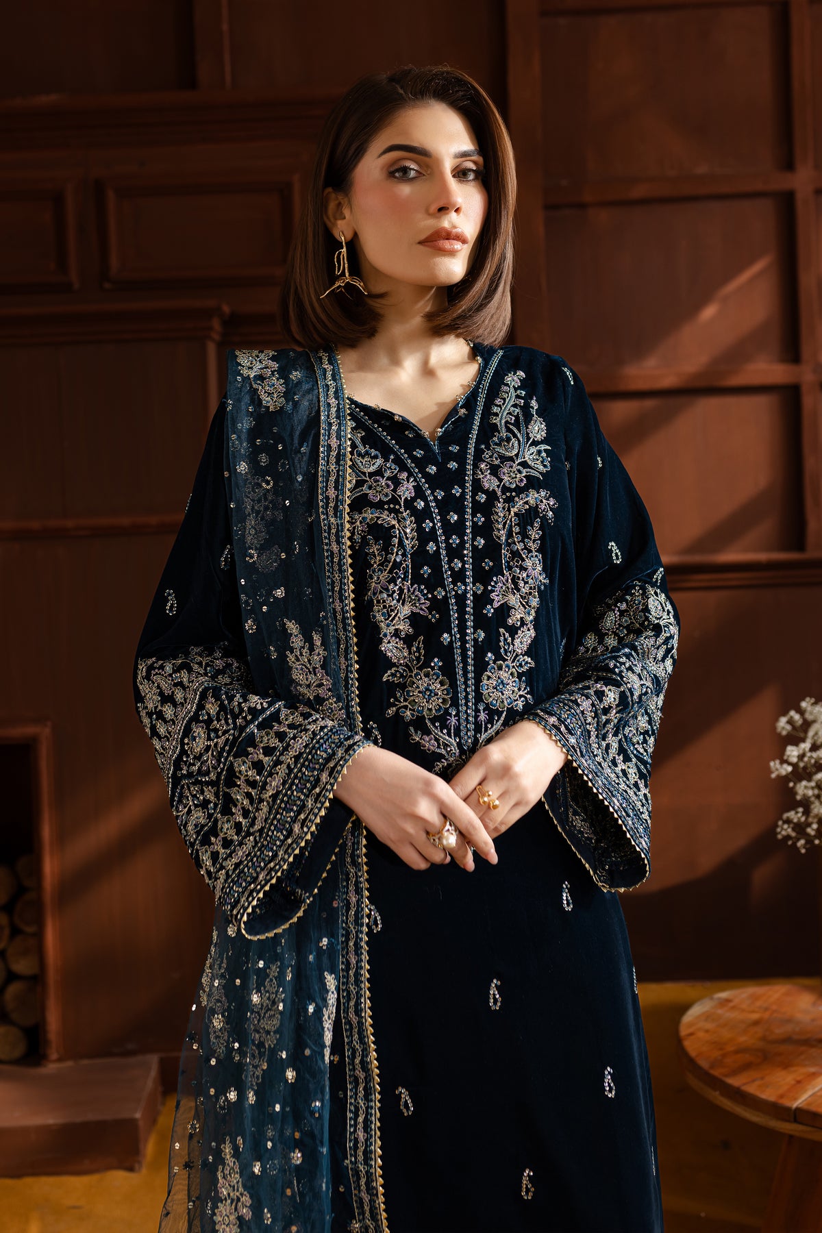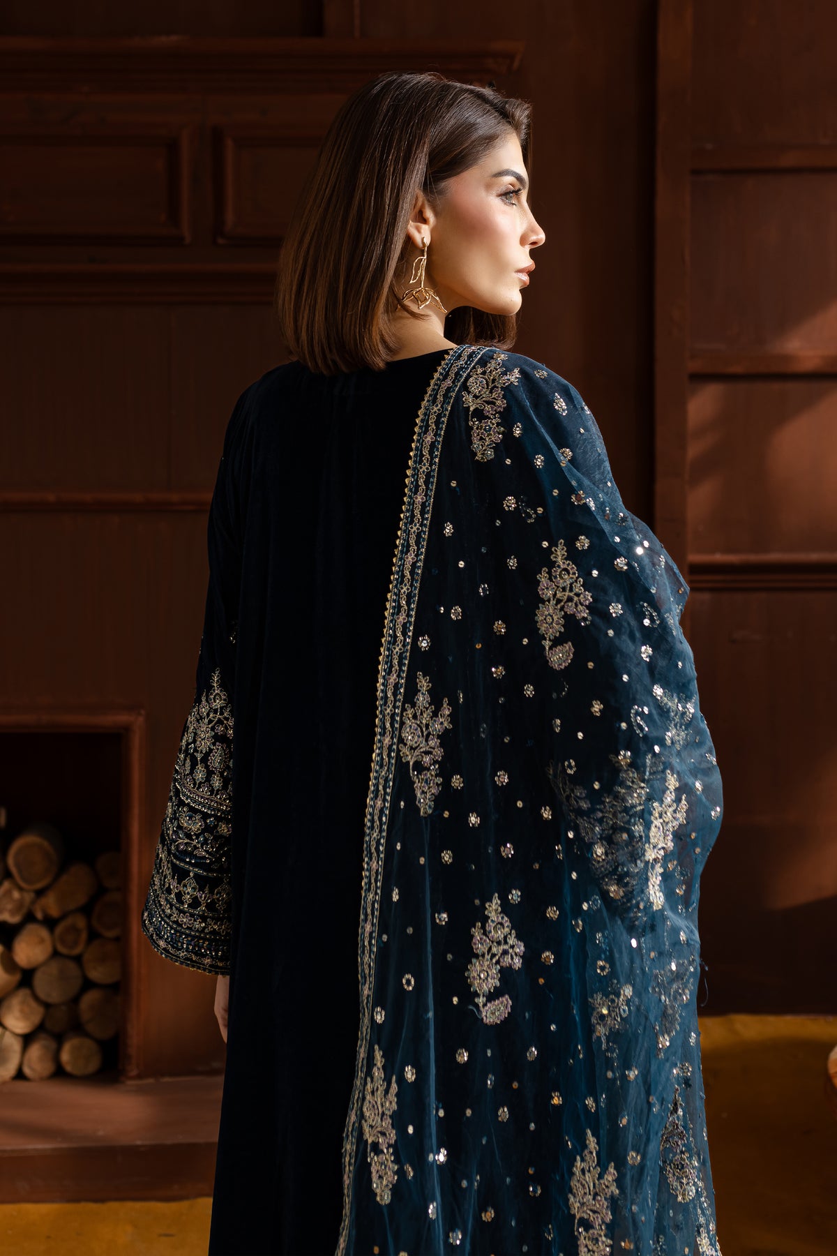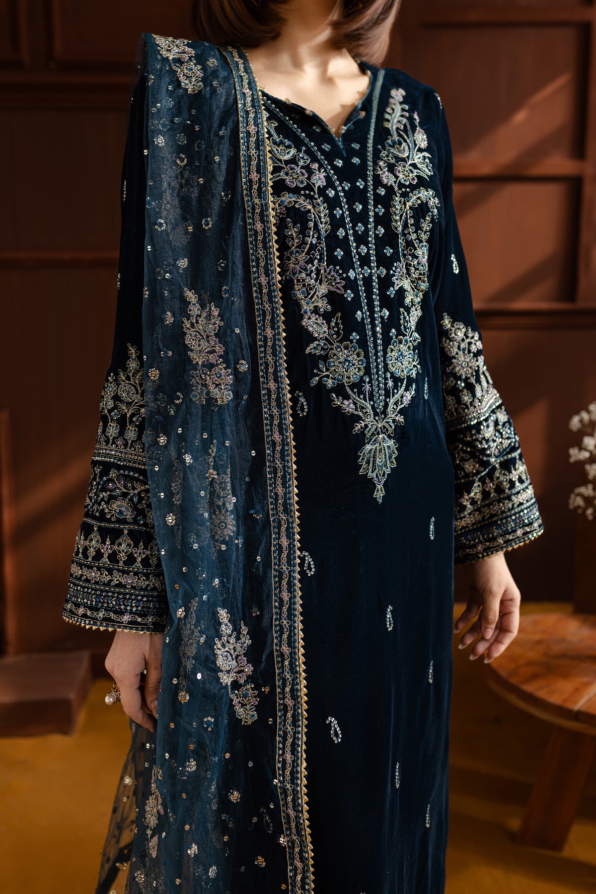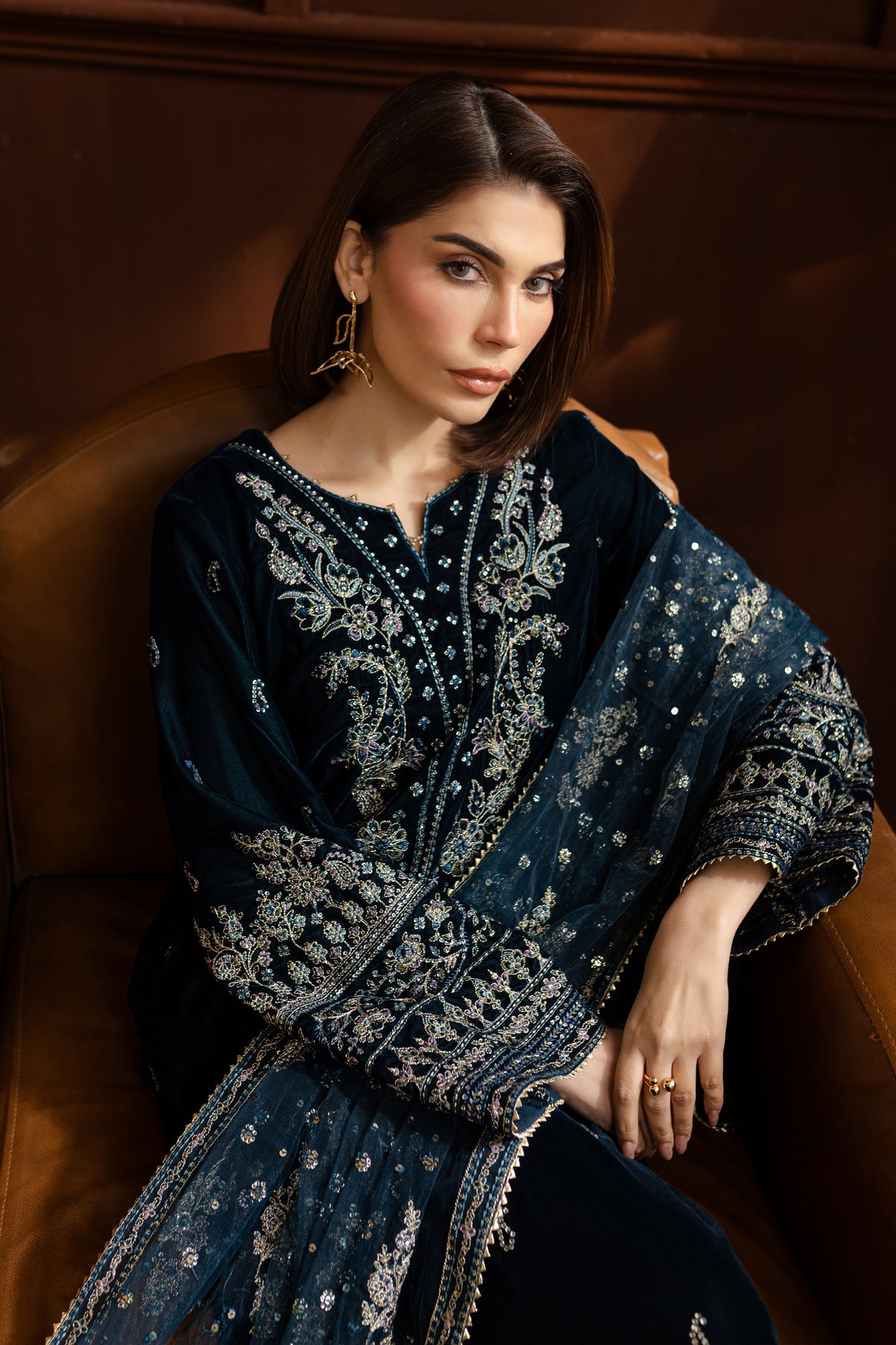 The Nausaiba 3Pc set features an opulent embroidered velvet shirt, beautifully adorned with intricate embroidered borders and flared embroidered sleeves for a dramatic effect. The shirt is further embellished with samosa lace and delicate crystals, adding a touch of glamour and sophistication to the design.