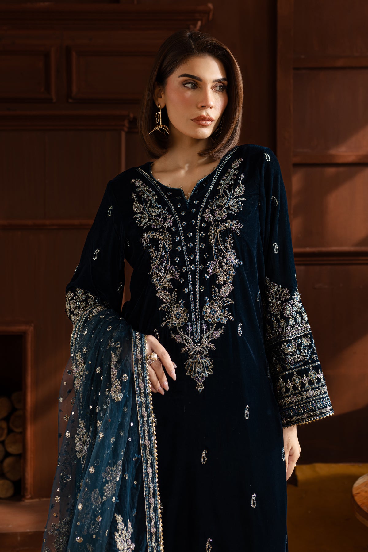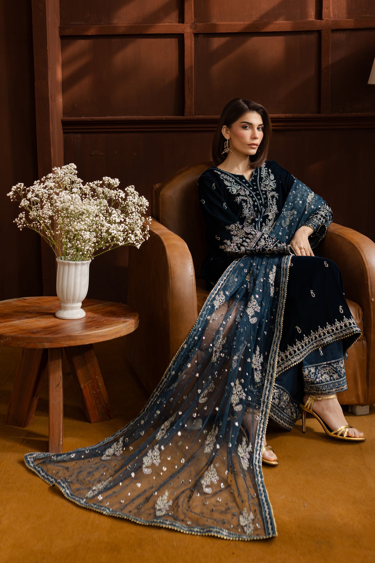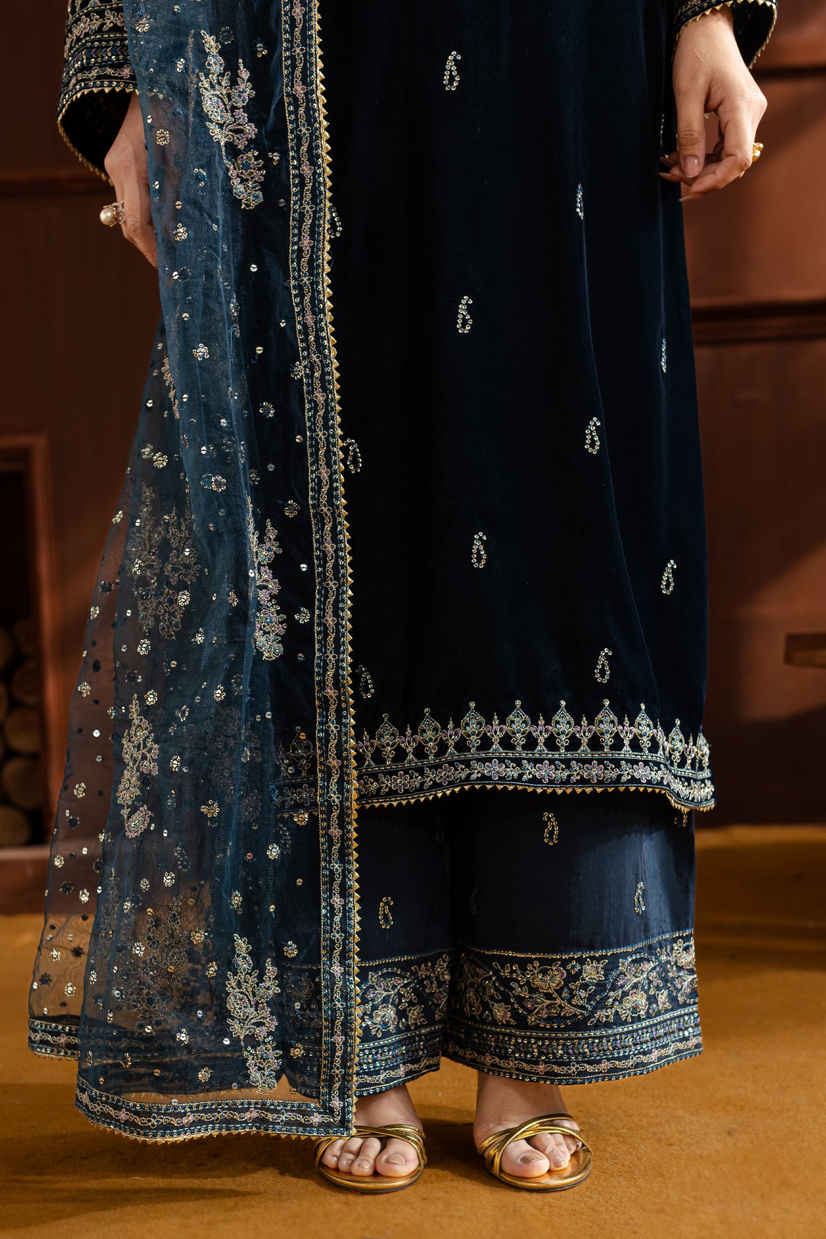 The Nausaiba 3Pc set features an opulent embroidered velvet shirt, beautifully adorned with intricate embroidered borders and flared embroidered sleeves for a dramatic effect. The shirt is further embellished with samosa lace and delicate crystals, adding a touch of glamour and sophistication to the design.