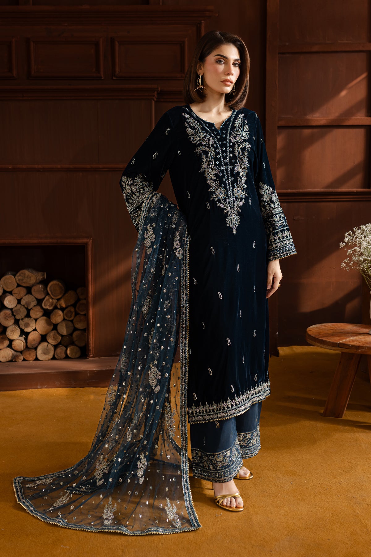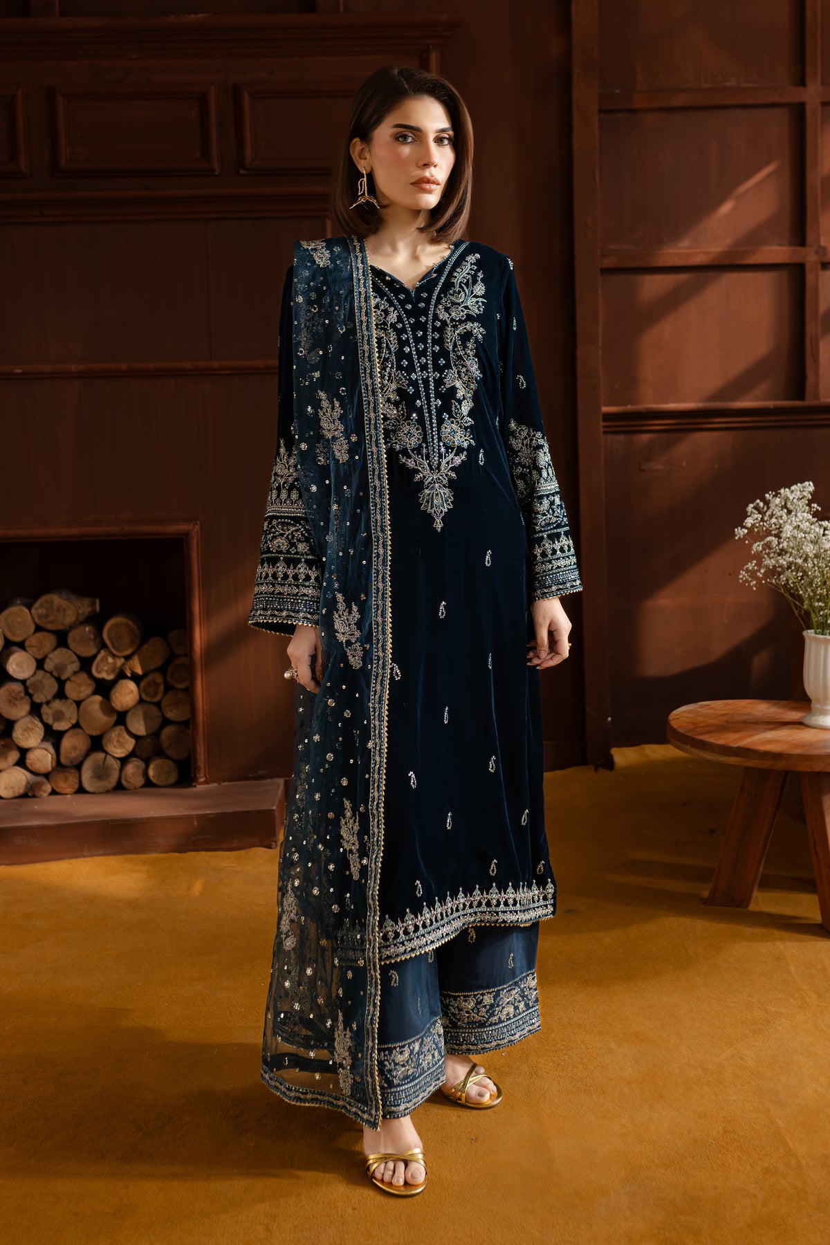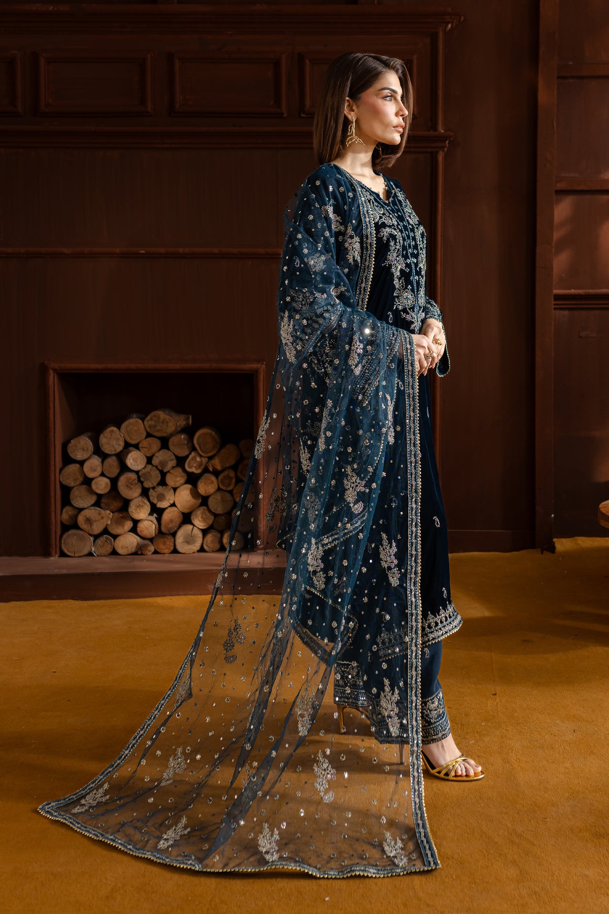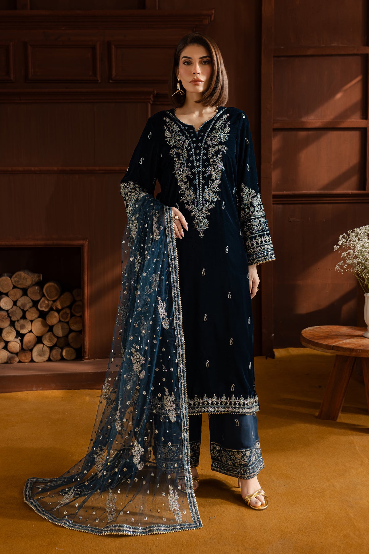 The Nausaiba 3Pc set features an opulent embroidered velvet shirt, beautifully adorned with intricate embroidered borders and flared embroidered sleeves for a dramatic effect. The shirt is further embellished with samosa lace and delicate crystals, adding a touch of glamour and sophistication to the design.