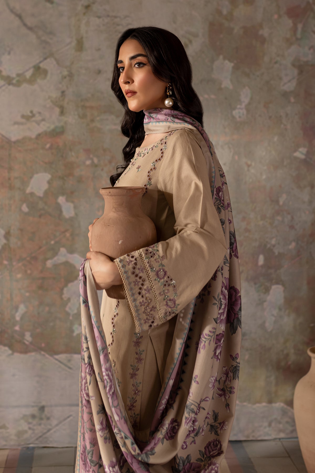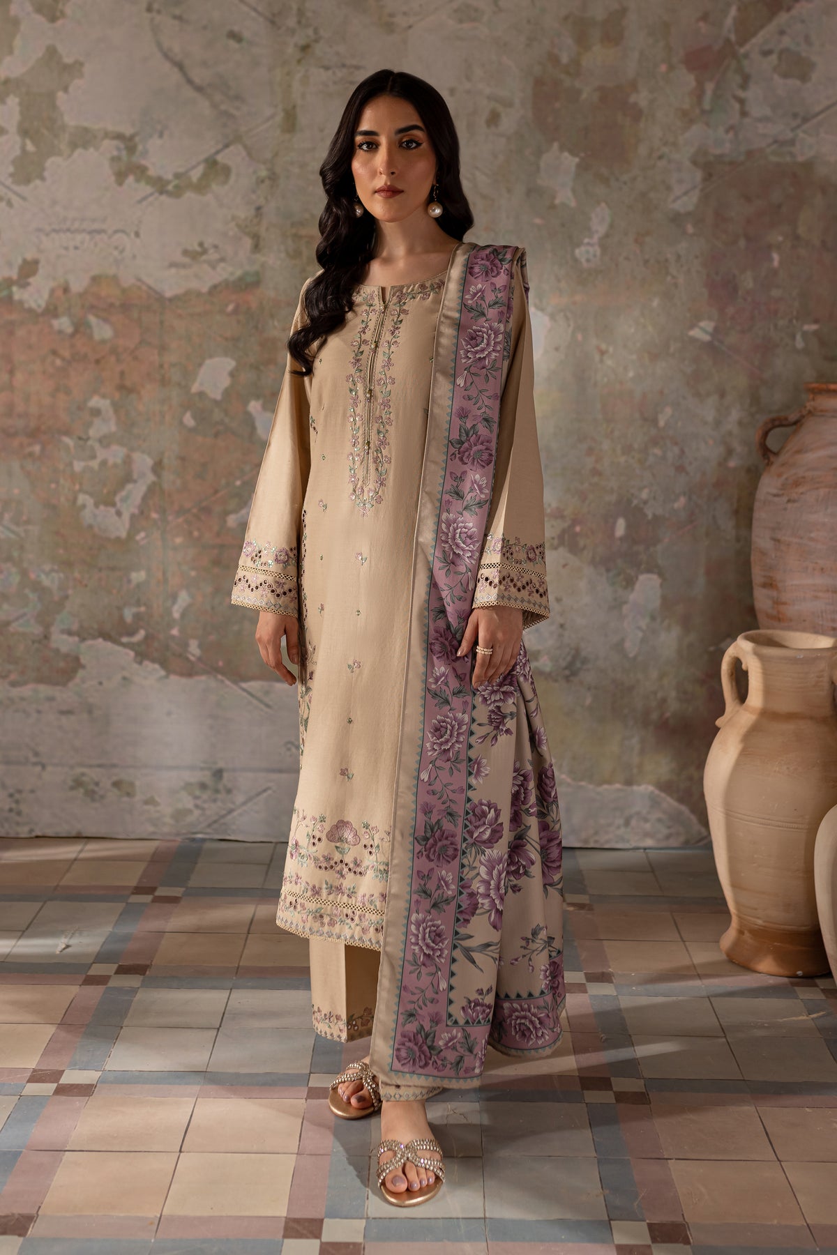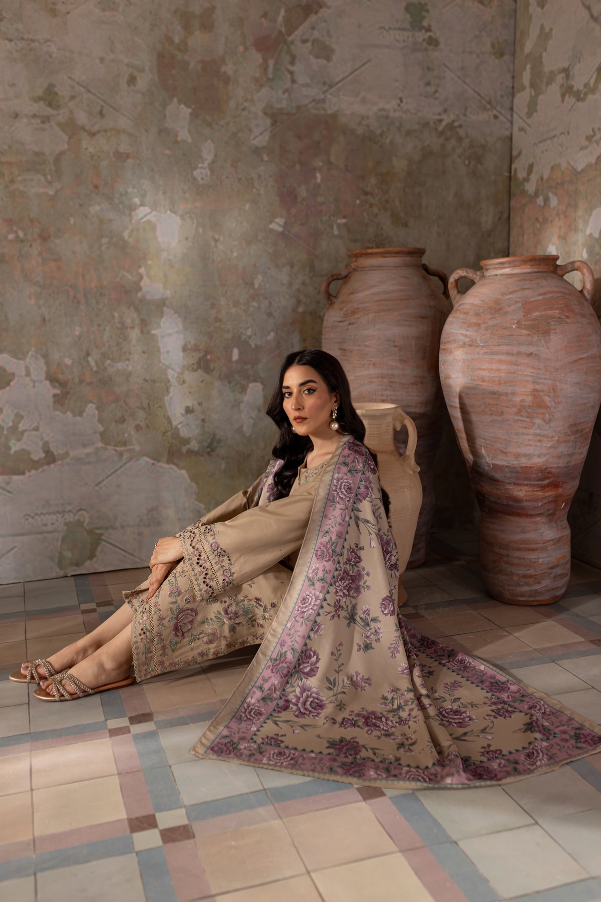 This is an elegant ensemble in warm beige khaddar. The shirt is fully embroidered with intricate patterns covering the front adding depth and texture. Finishing touches include delicate lace at the hem which enhances the sophistication of this look.