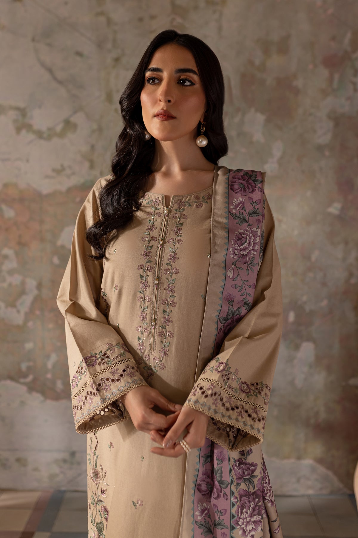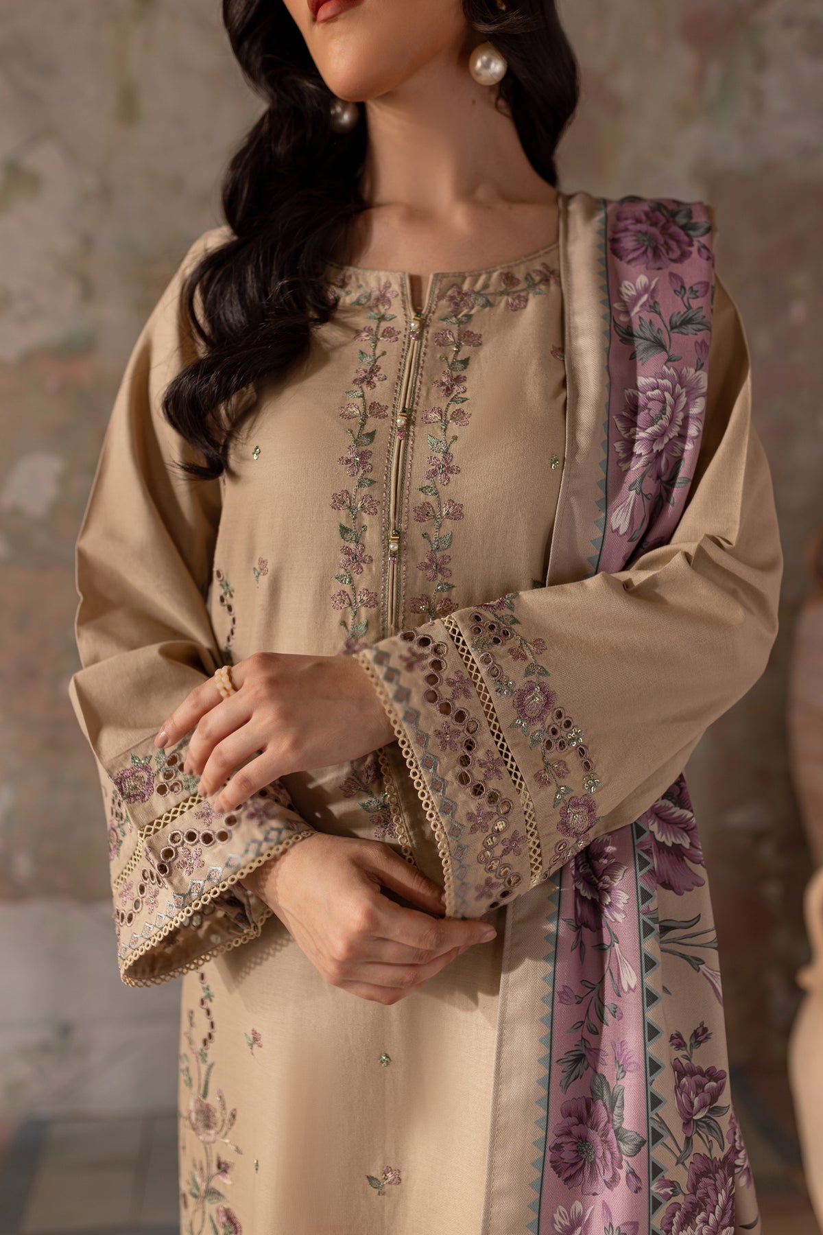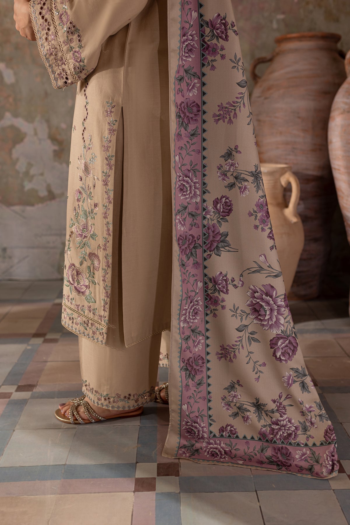 This is an elegant ensemble in warm beige khaddar. The shirt is fully embroidered with intricate patterns covering the front adding depth and texture. Finishing touches include delicate lace at the hem which enhances the sophistication of this look.