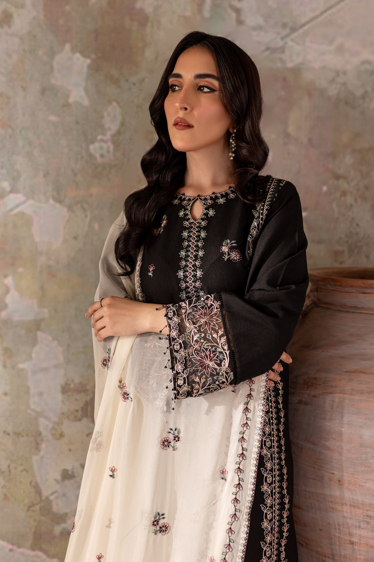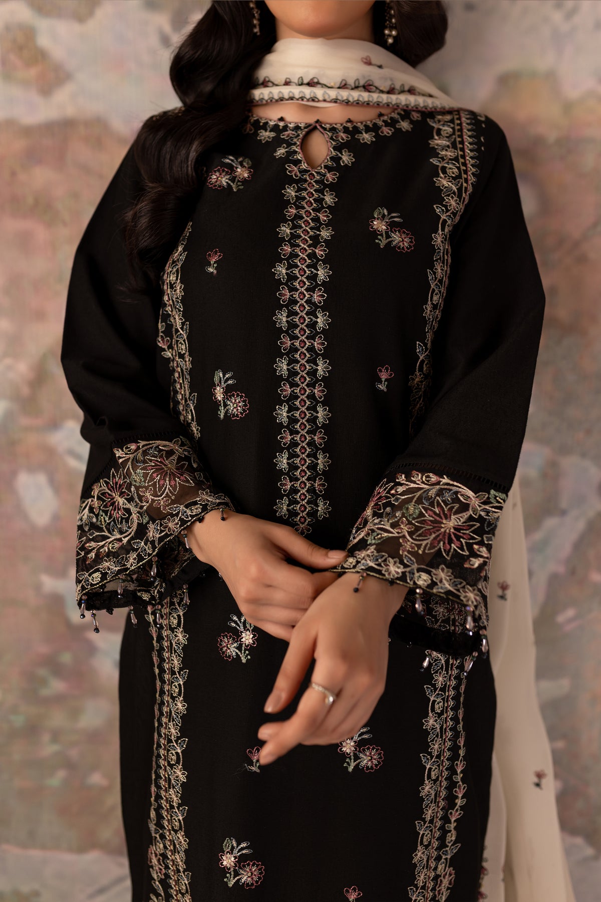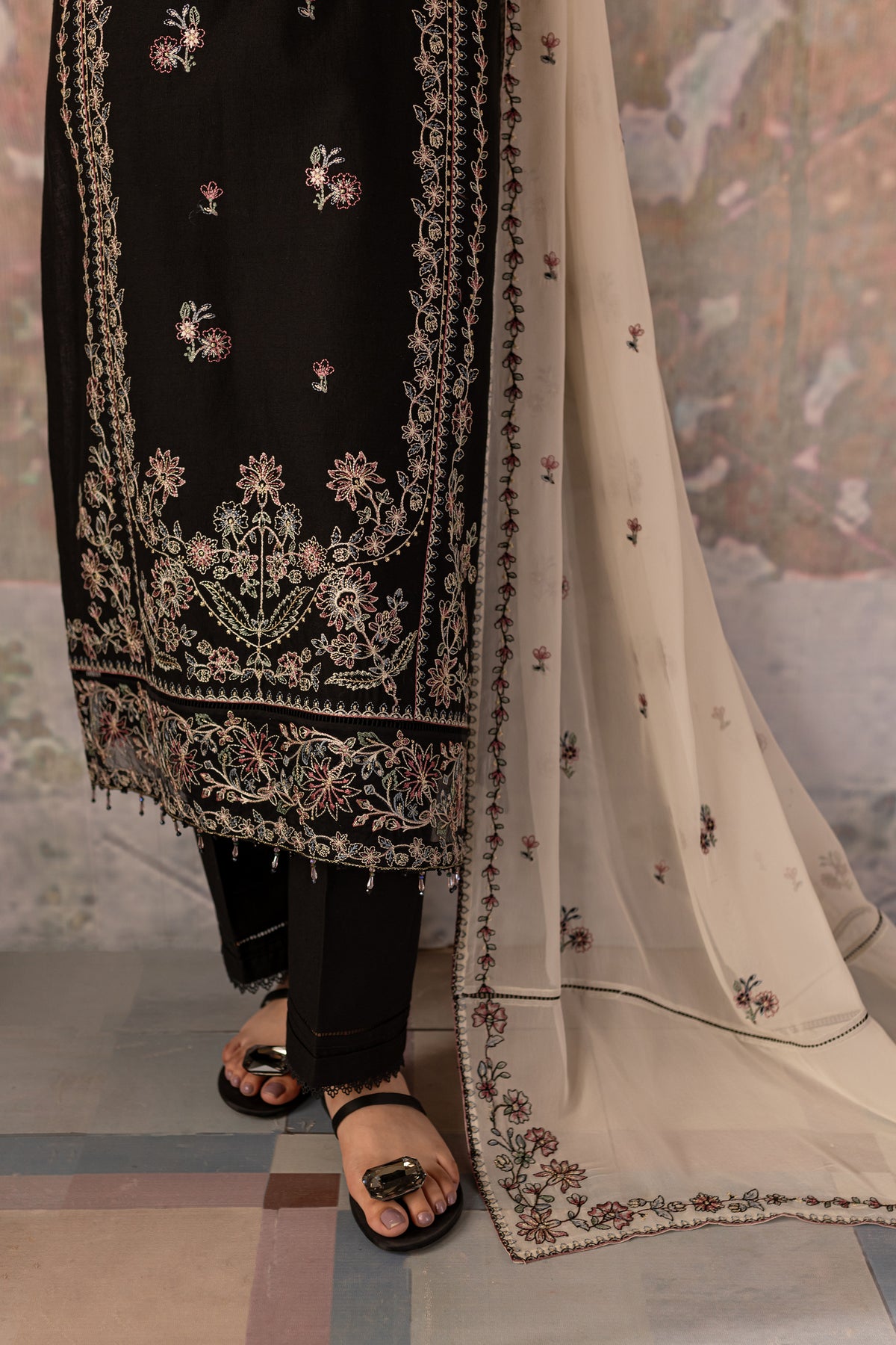 This ensemble is crafted from rich black karandi, giving it an air of elegance and poise. The shirt is fully embroidered with intricate paneling creating a luxurious and structured look. Organza embroidered borders add a soft contrast along the hem bringing an additional layer of refinement.