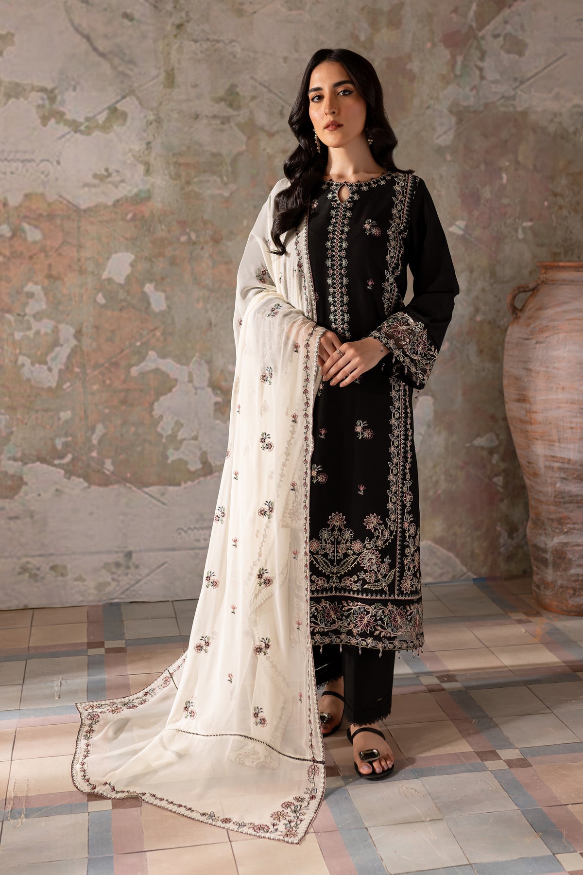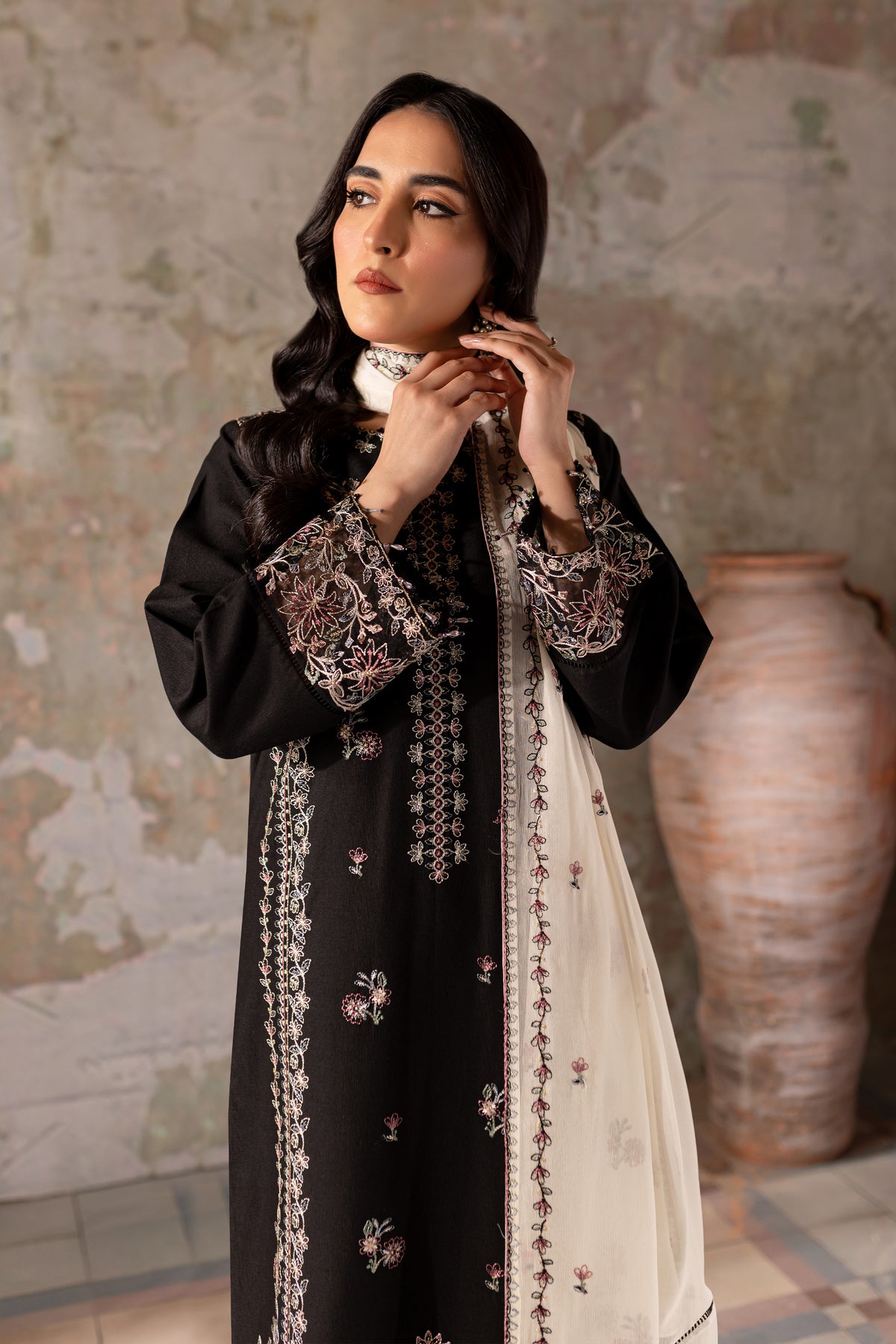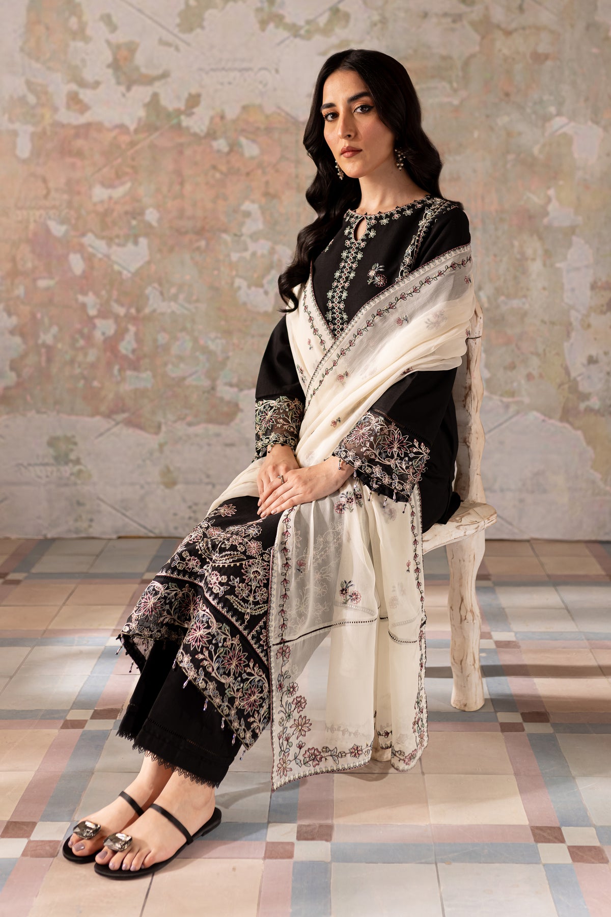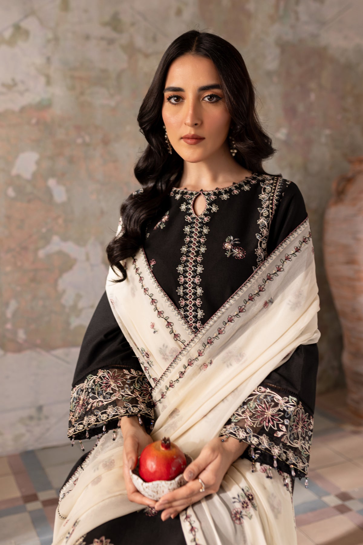 This ensemble is crafted from rich black karandi, giving it an air of elegance and poise. The shirt is fully embroidered with intricate paneling creating a luxurious and structured look. Organza embroidered borders add a soft contrast along the hem bringing an additional layer of refinement.