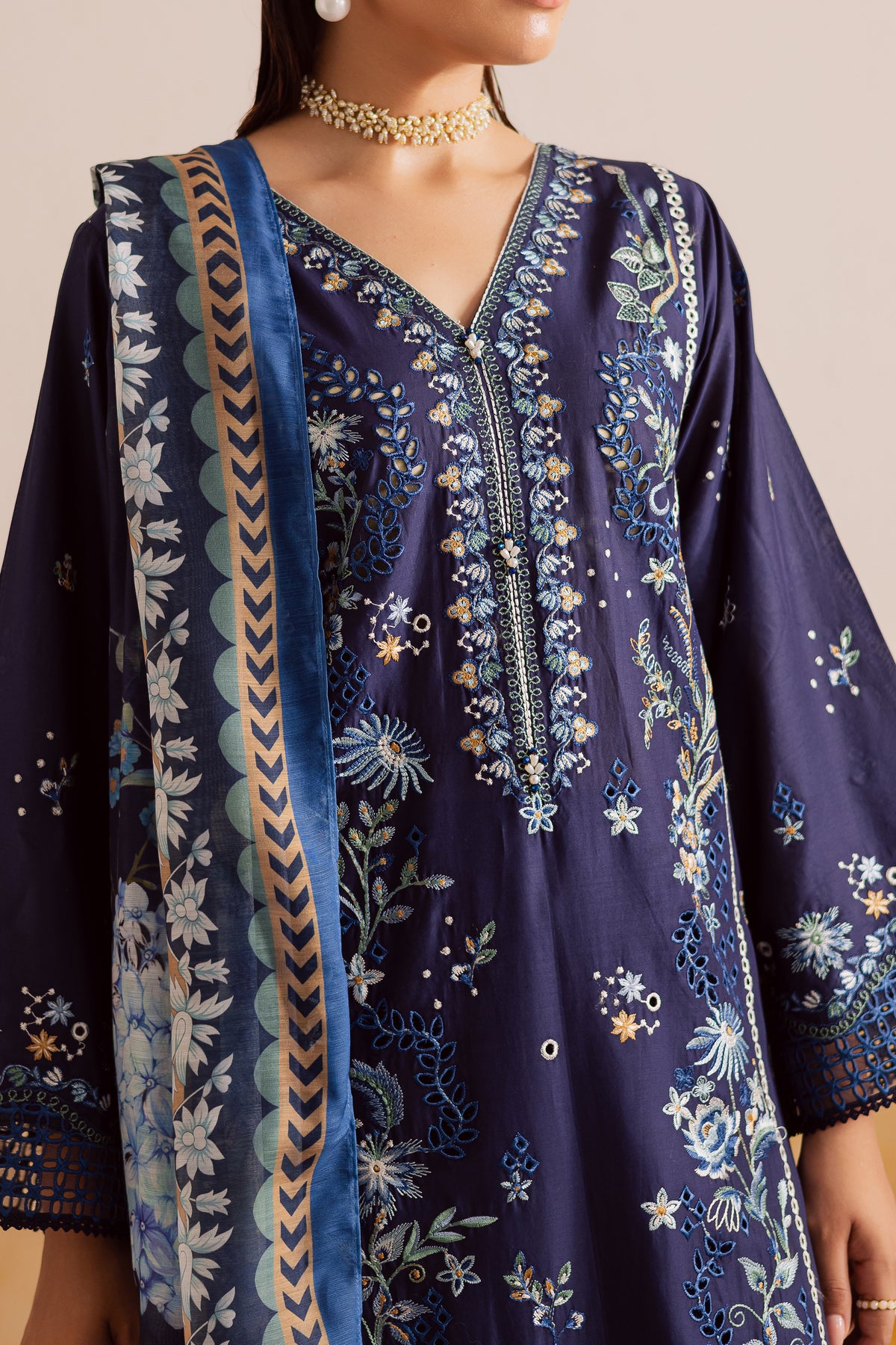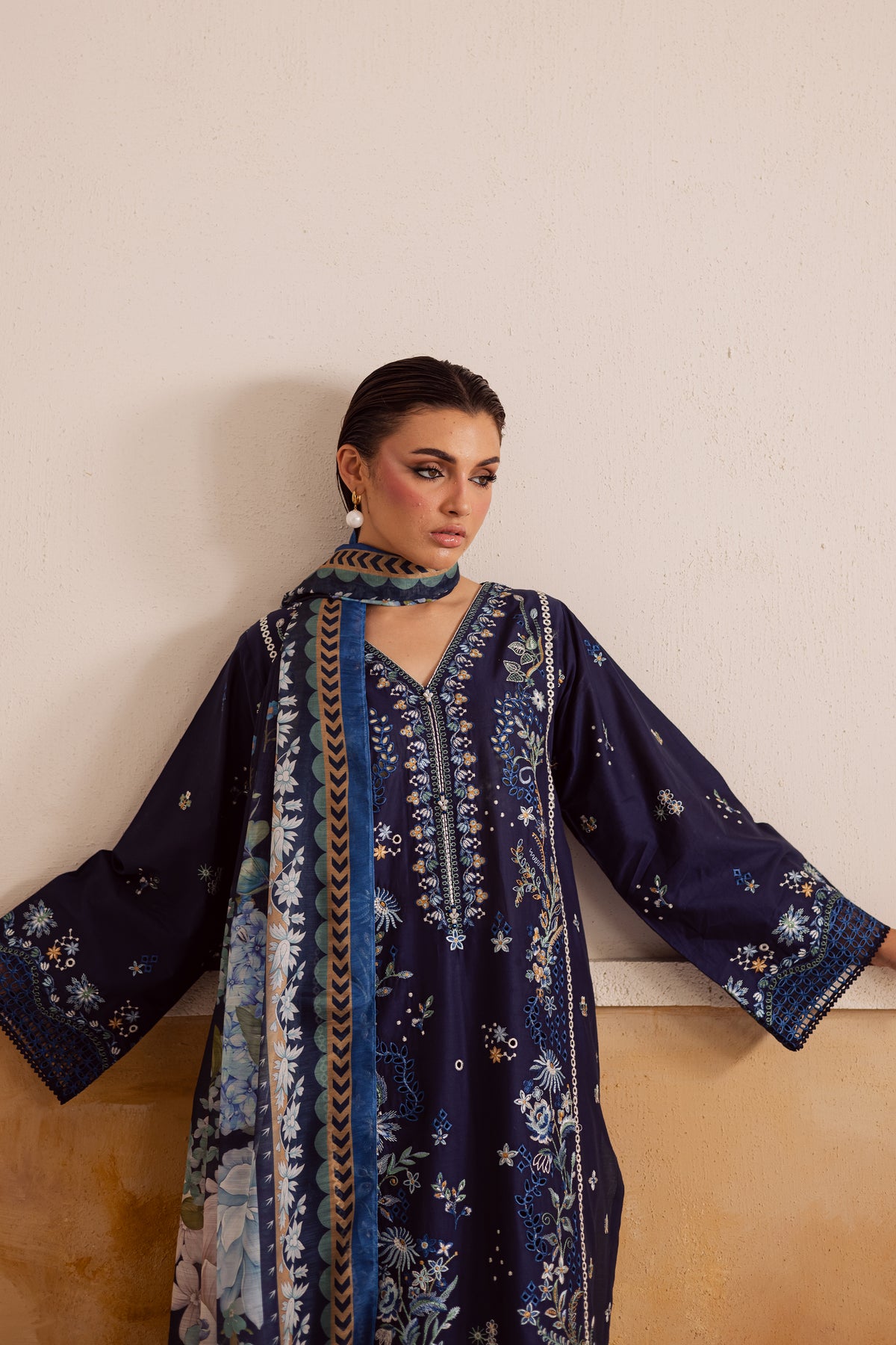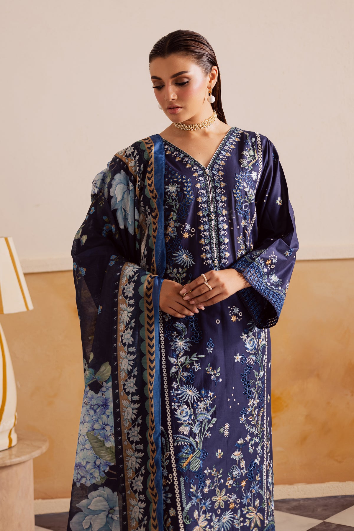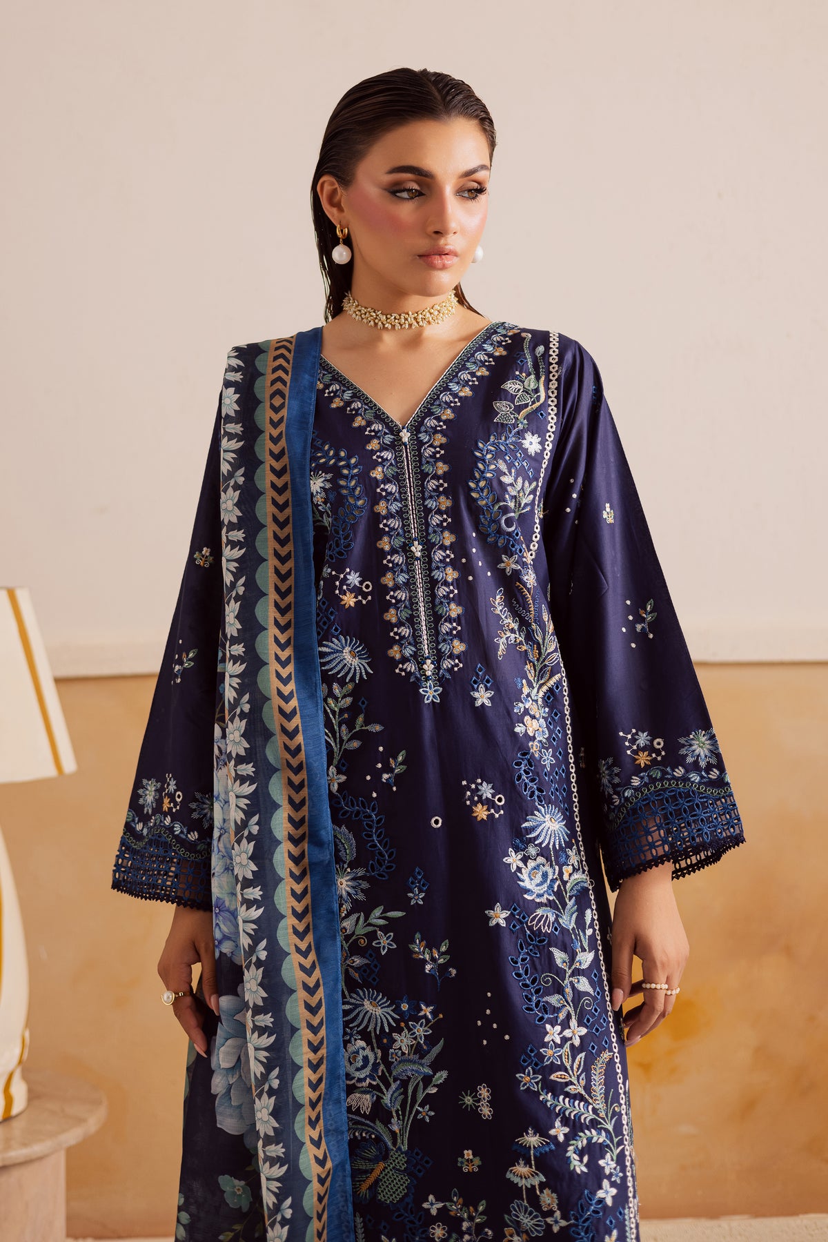A soft midnight blue paneled pima lawn shirt crafted from premium fabric, fully embroidered with intricate floral patterns and finished with an exquisite organza schiffli border. Delicate lace accents enhance the sleeves and hem, lending a romantic charm to the silhouette. The flowing panels create graceful movement, while the finely detailed embroidery adds depth and texture to the ensemble.