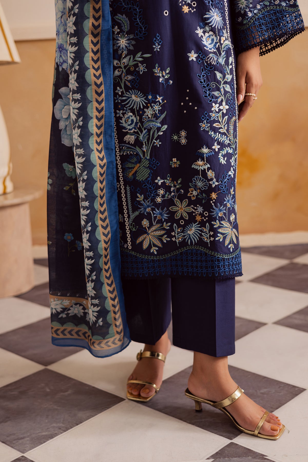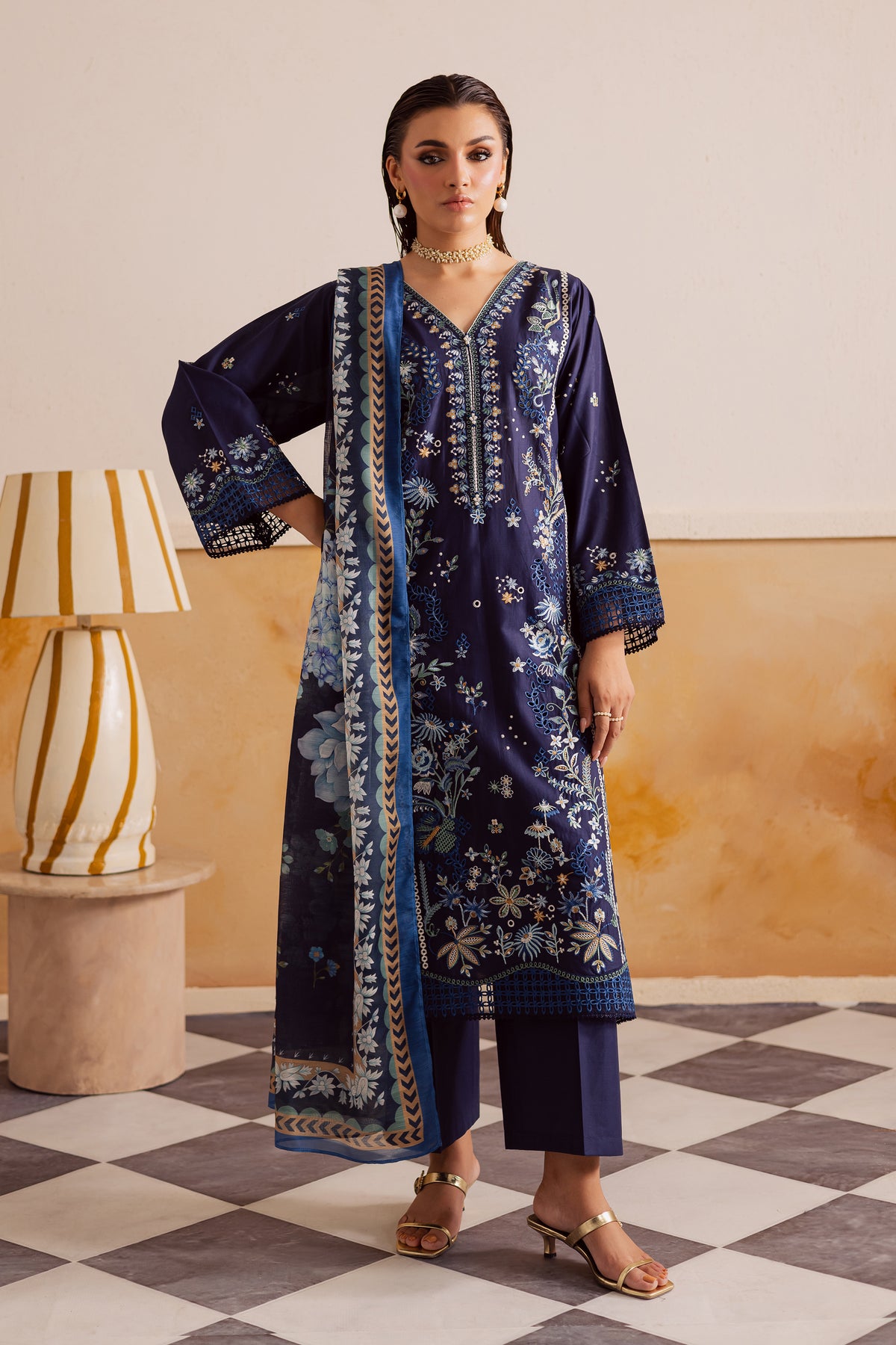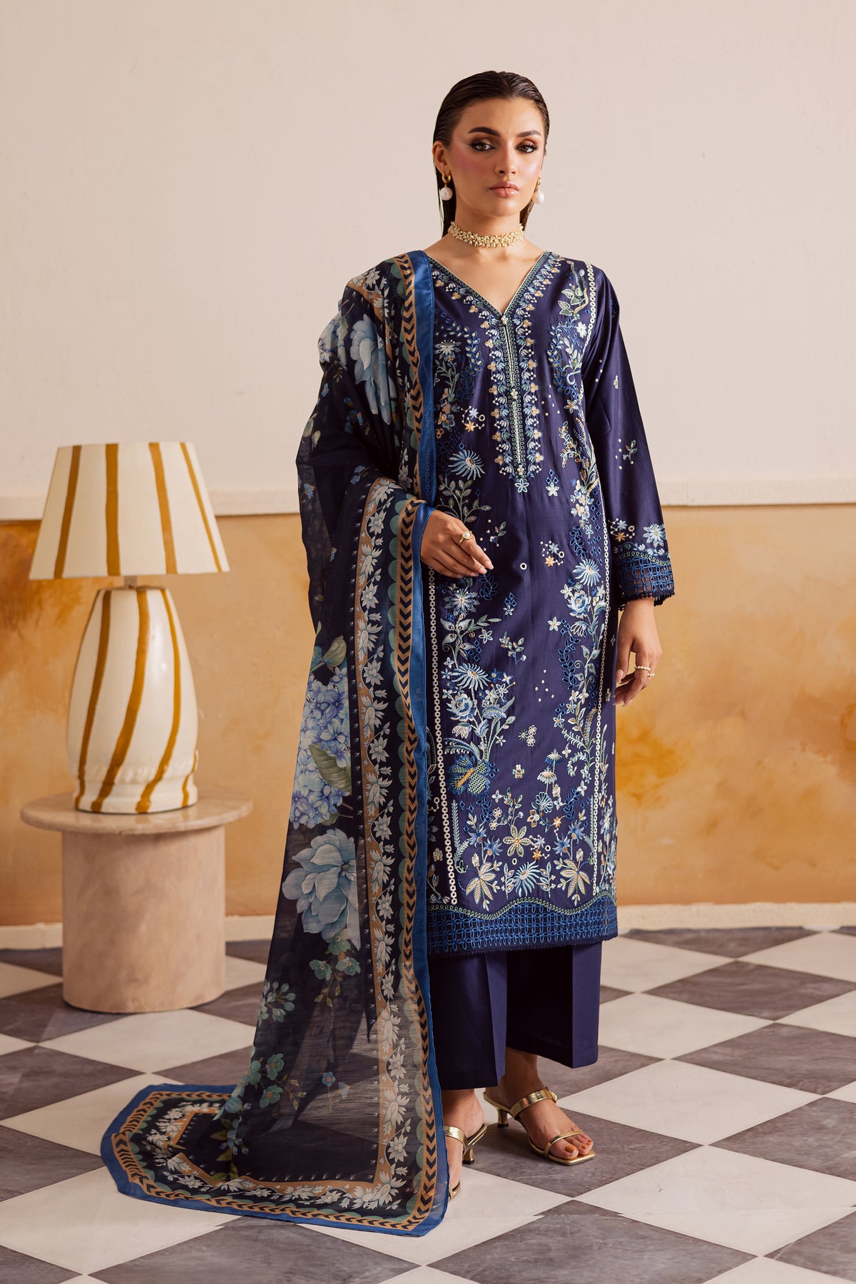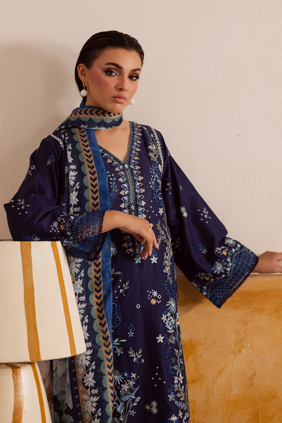 A soft midnight blue paneled pima lawn shirt crafted from premium fabric, fully embroidered with intricate floral patterns and finished with an exquisite organza schiffli border. Delicate lace accents enhance the sleeves and hem, lending a romantic charm to the silhouette. The flowing panels create graceful movement, while the finely detailed embroidery adds depth and texture to the ensemble.