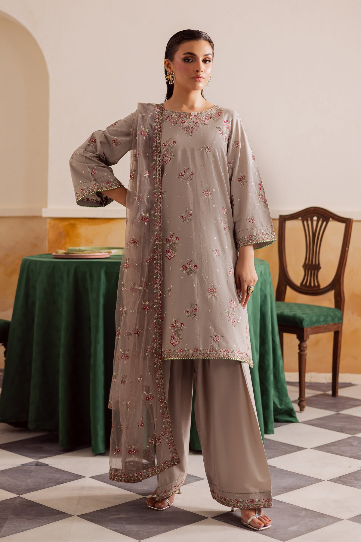 The outfit is finished with an embroidered net dupatta, adding a touch of ethereal grace through its sheer texture and intricate detailing - a perfect blend of simplicity and sophistication.