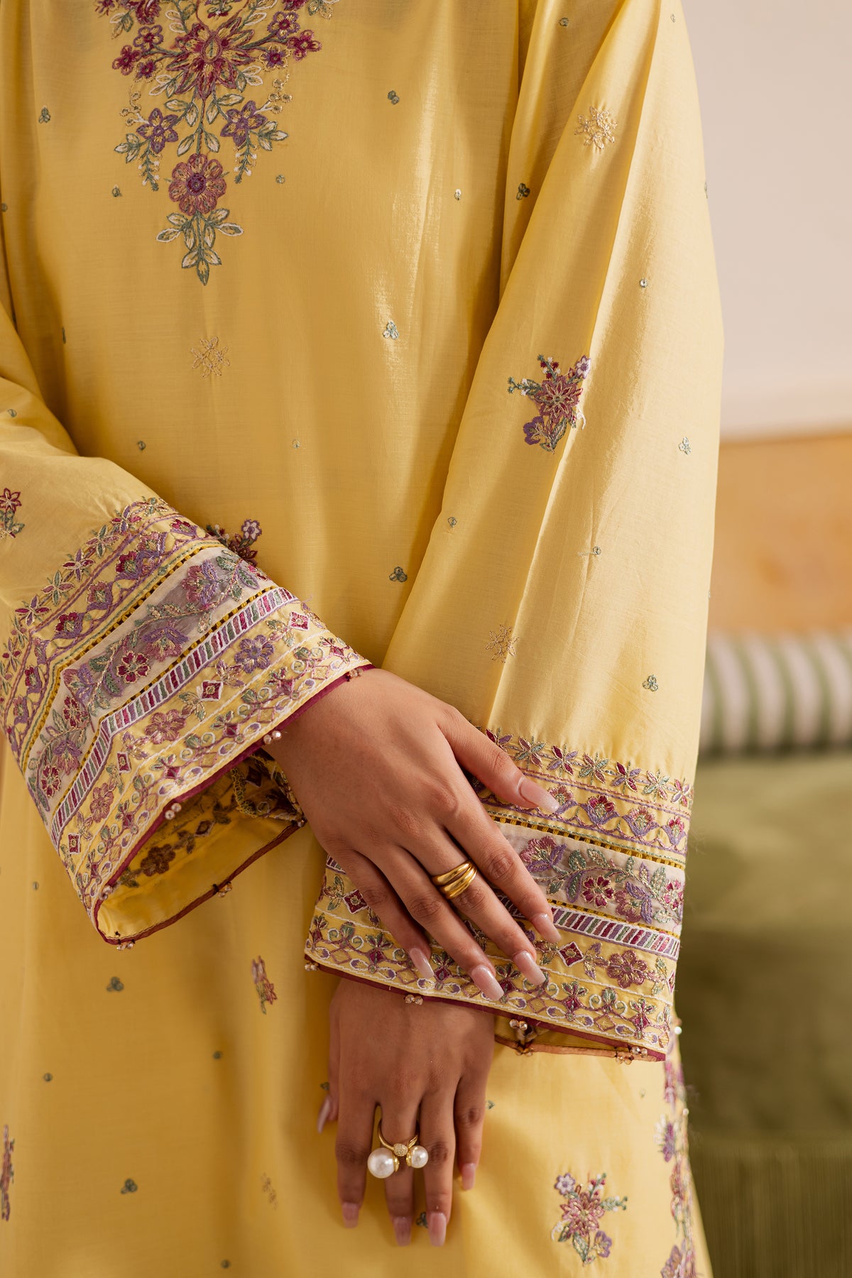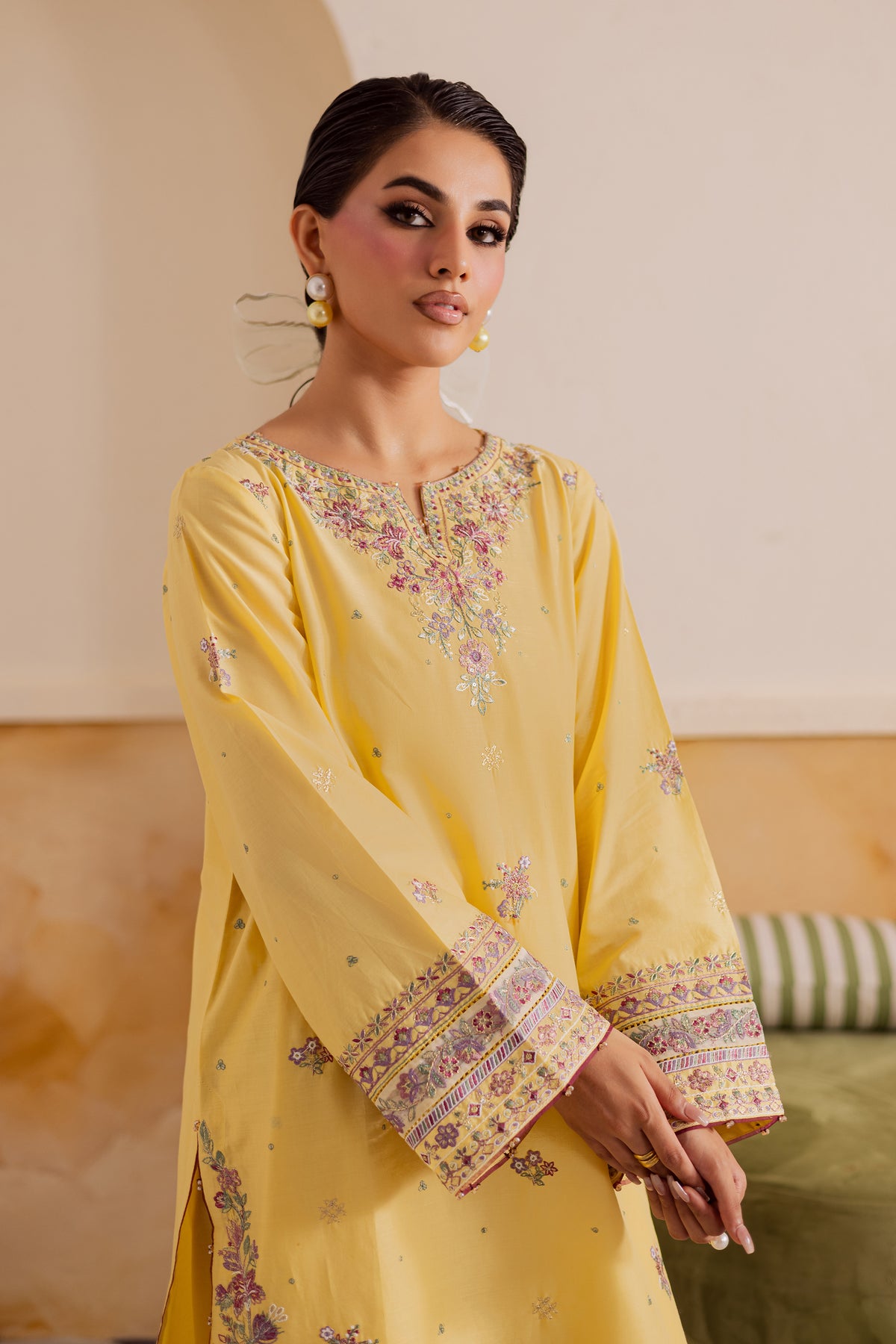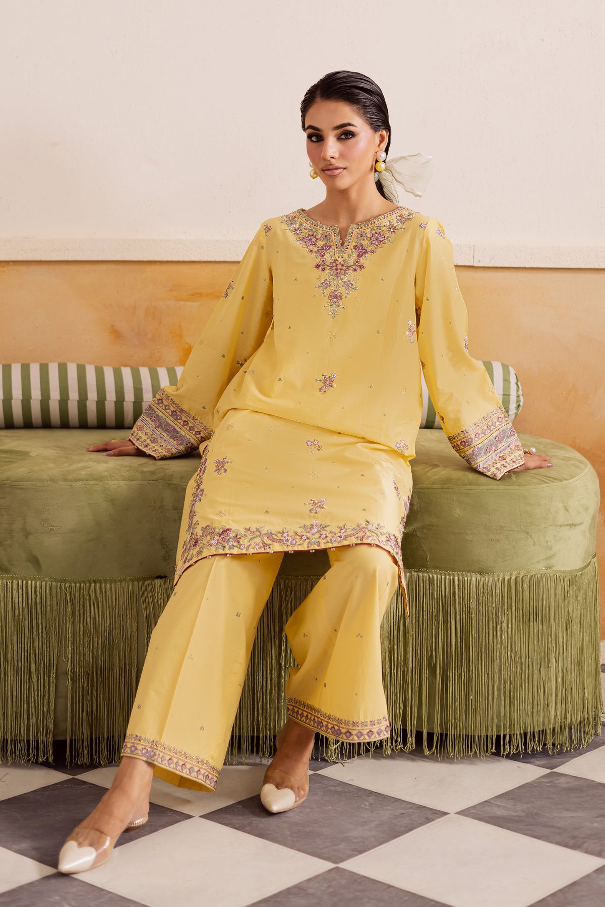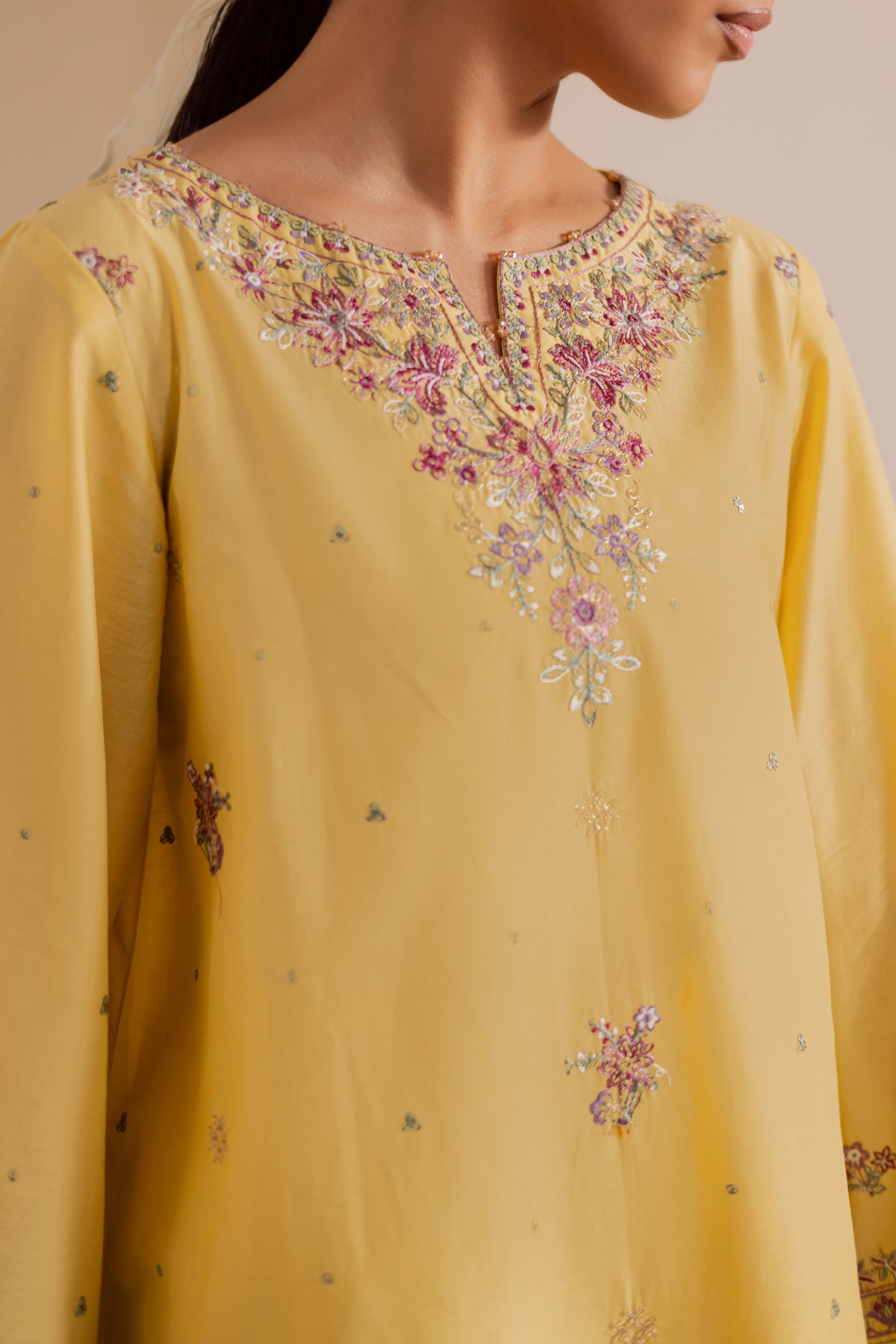 A chic short-length lemon yellow pima alwn shirt featuring an intricately embroidered composed hem and neckline, enhanced with organza contrast piping along the sides. The piping is delicately finished with colored bead accents, adding a playful yet refined touch to the overall design.