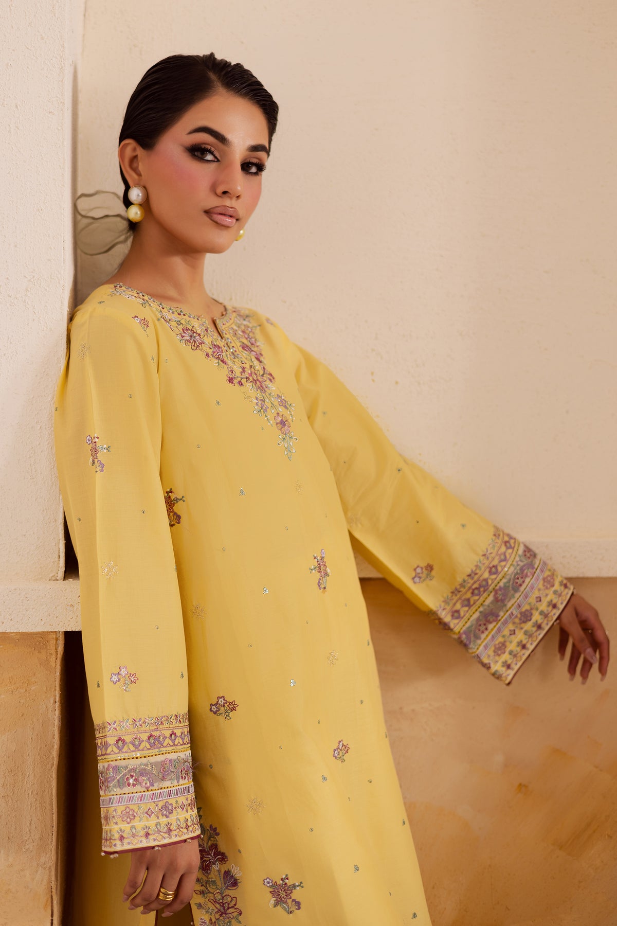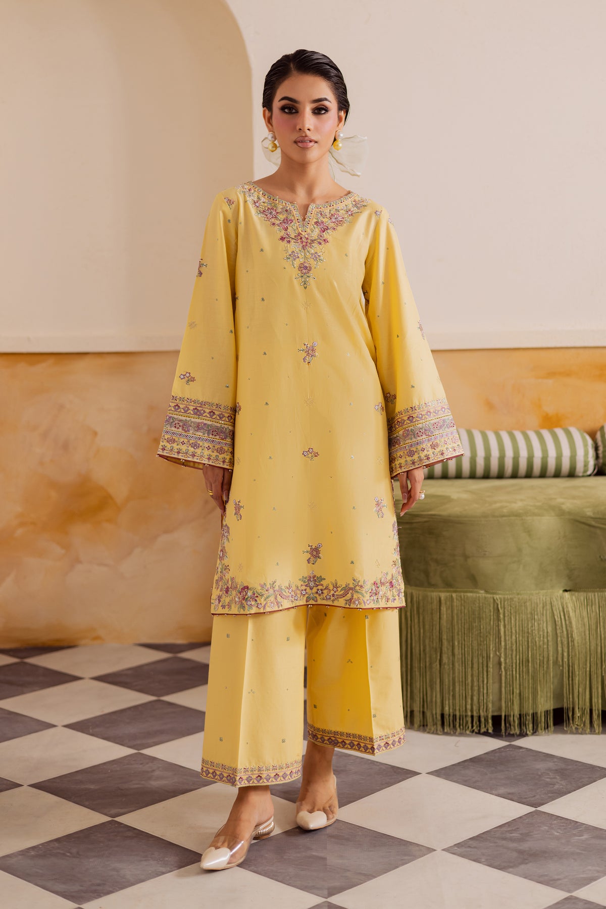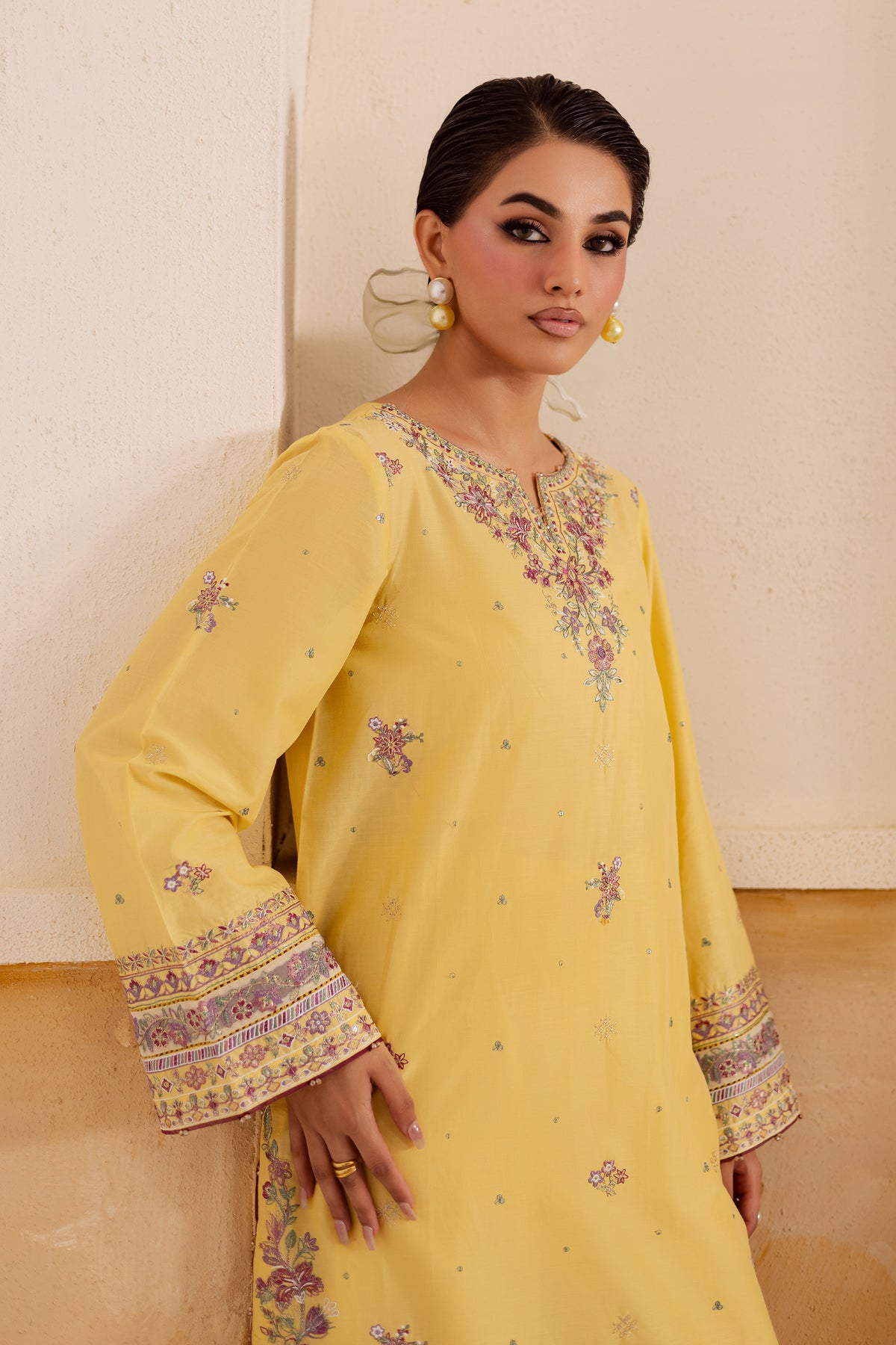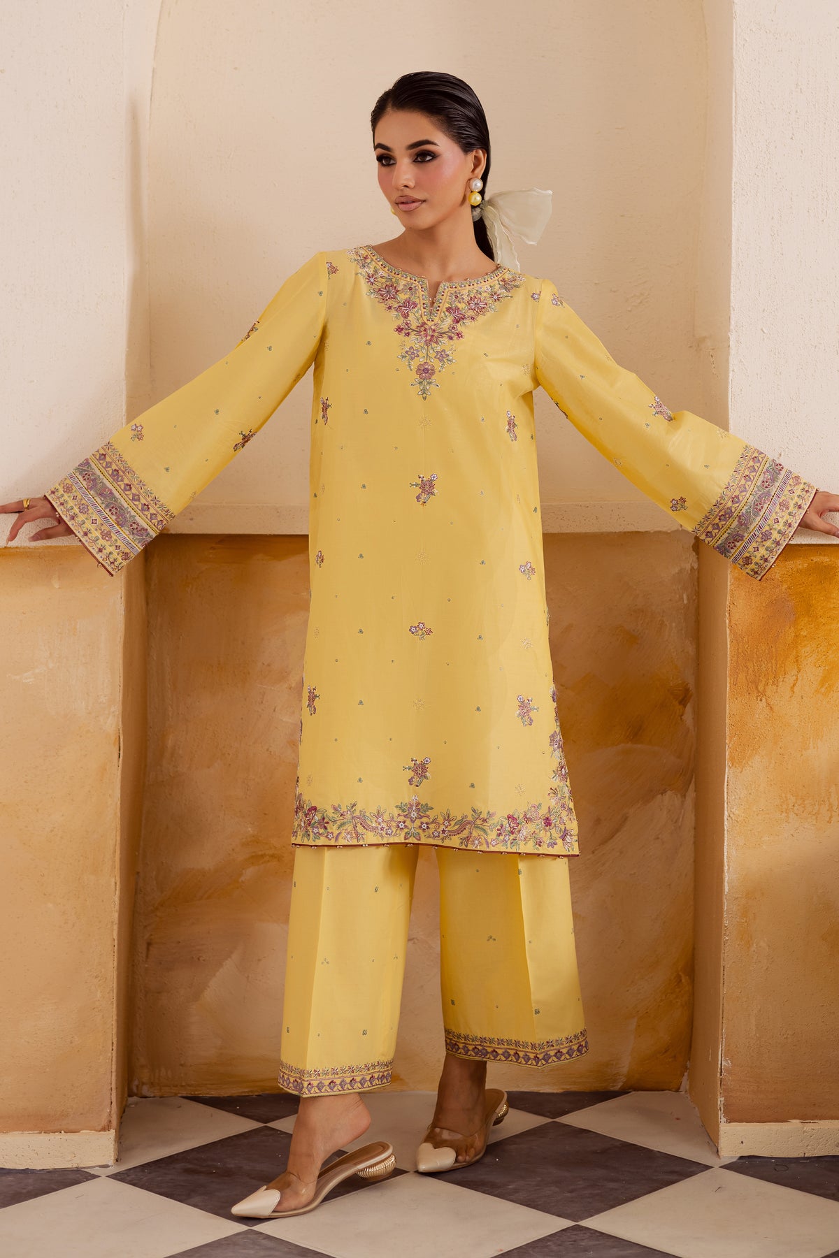A chic short-length lemon yellow pima alwn shirt featuring an intricately embroidered composed hem and neckline, enhanced with organza contrast piping along the sides. The piping is delicately finished with colored bead accents, adding a playful yet refined touch to the overall design.