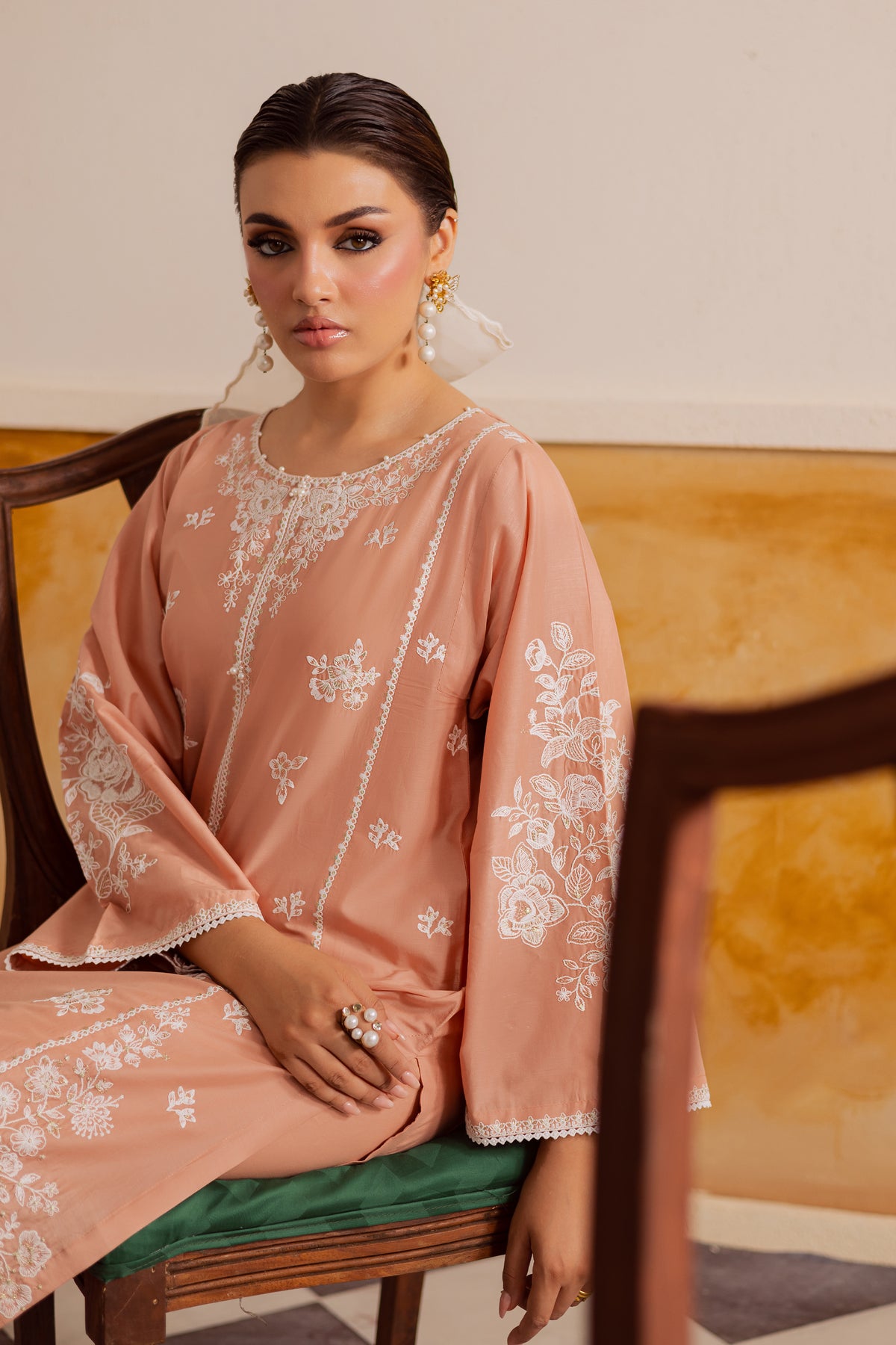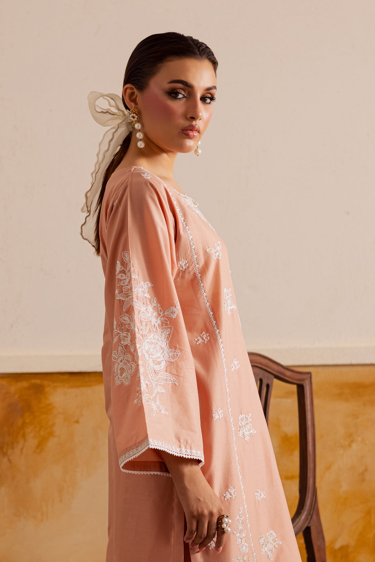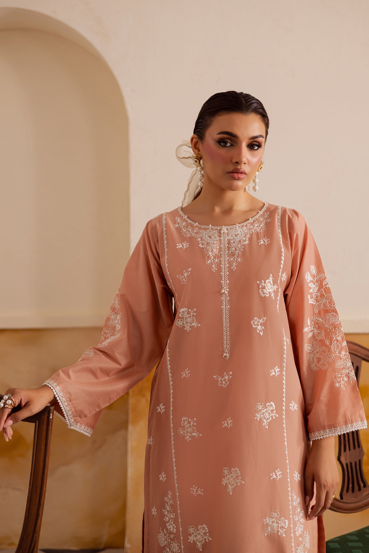 A short, panelled peach pima lawn shirt featuring composed embroidery along the front and a sleek band collar neckline accented with subtle piping - echoing the sophisticated style seen in contemporary ban-collar designs. The flared sleeves are decorated with matching composed embroidery, giving the silhouette a gracefully feminine finish.